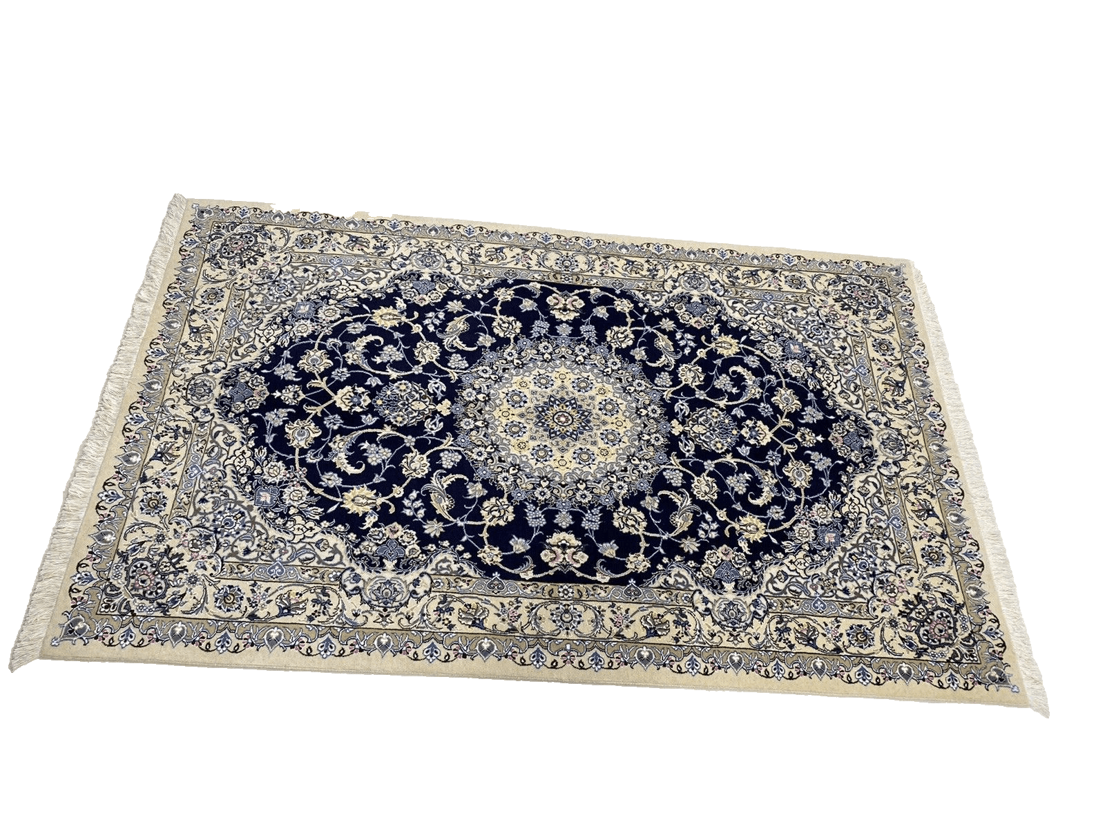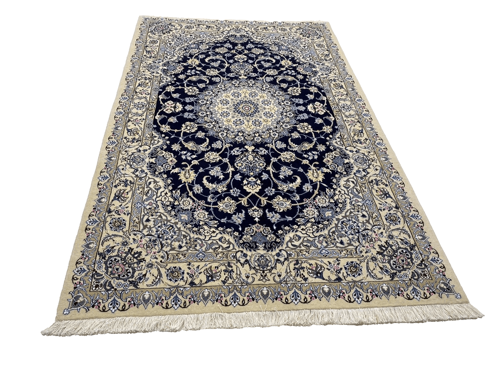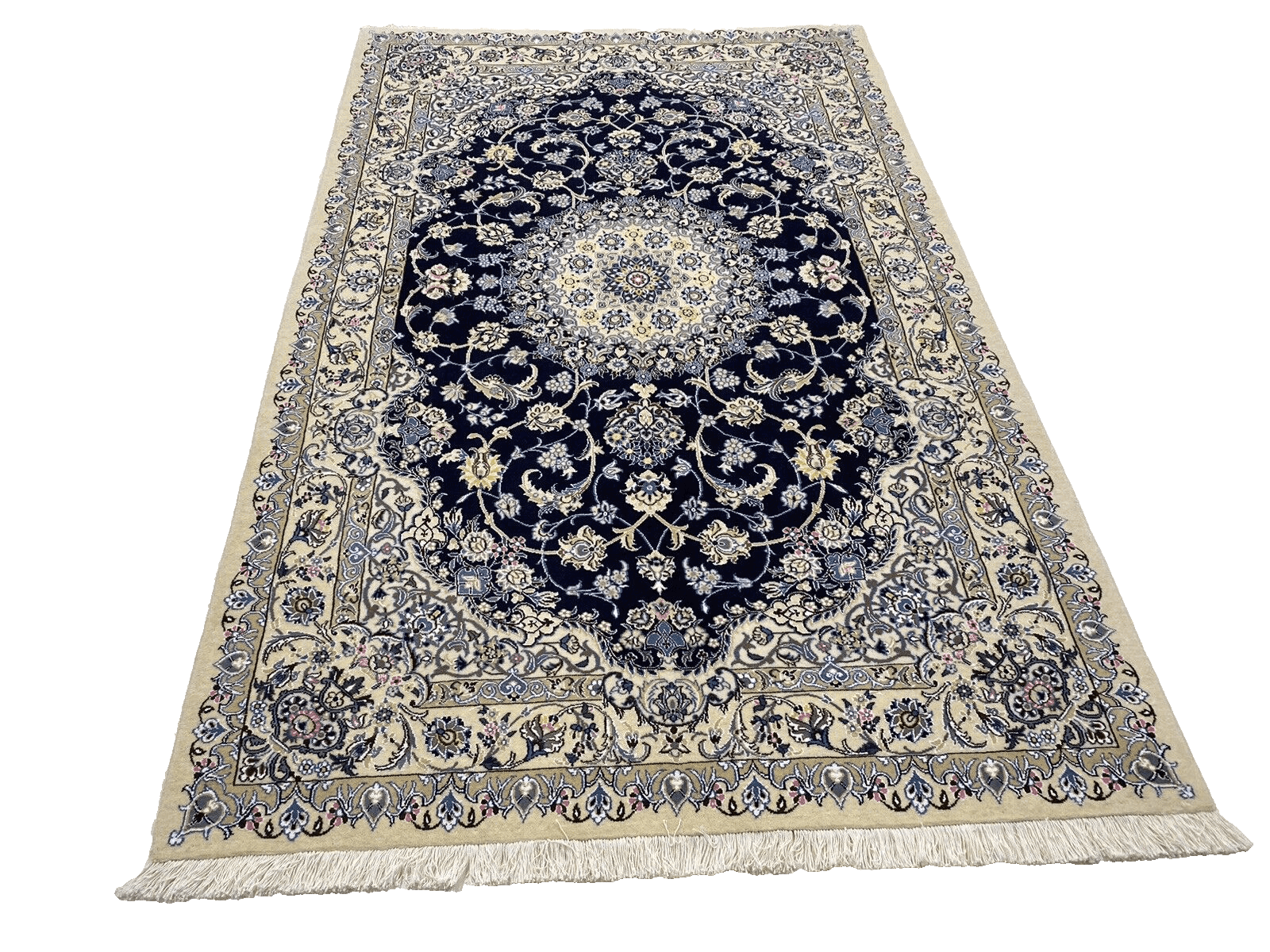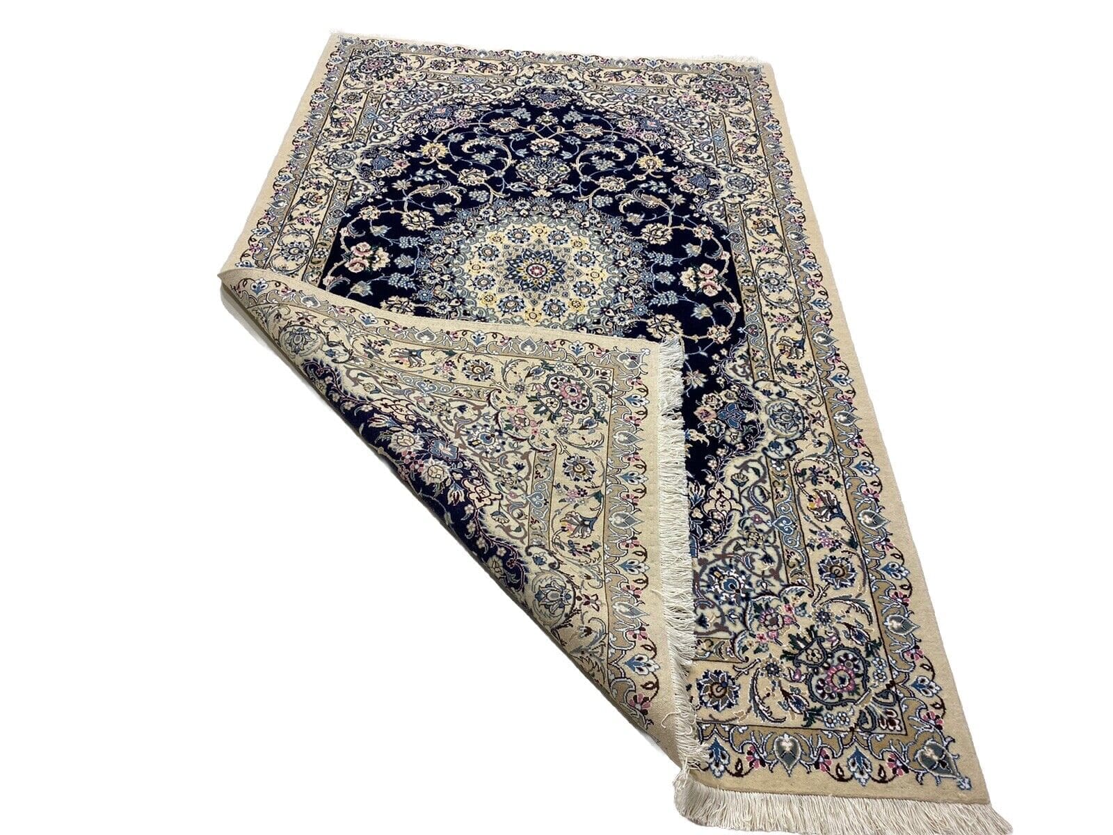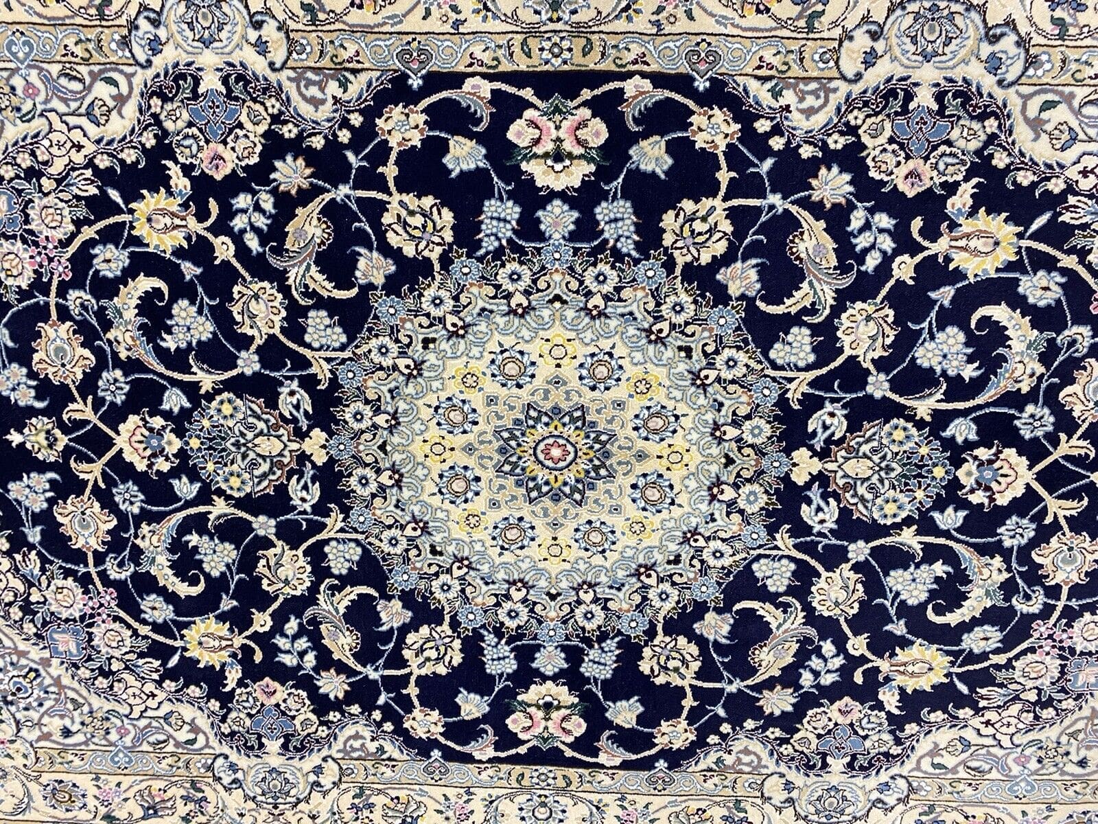 Orientteppich super Nain 9 La | Handgeknüpft | Knotendichte: ca. 500.000 Knoten/m² | Material: 90% Schurwolle, 10% Seide, 100% Baumwolle | Größe: 255 x 158 cm | Zustand: Neu, perfekt | Herkunft: Persien | Stil: Traditionell Orientalisch/Persisch | Florhöhe: ca. 8 mm | Für Fußbodenheizung geeignet, haustierfreundlich | Farbe: Blau