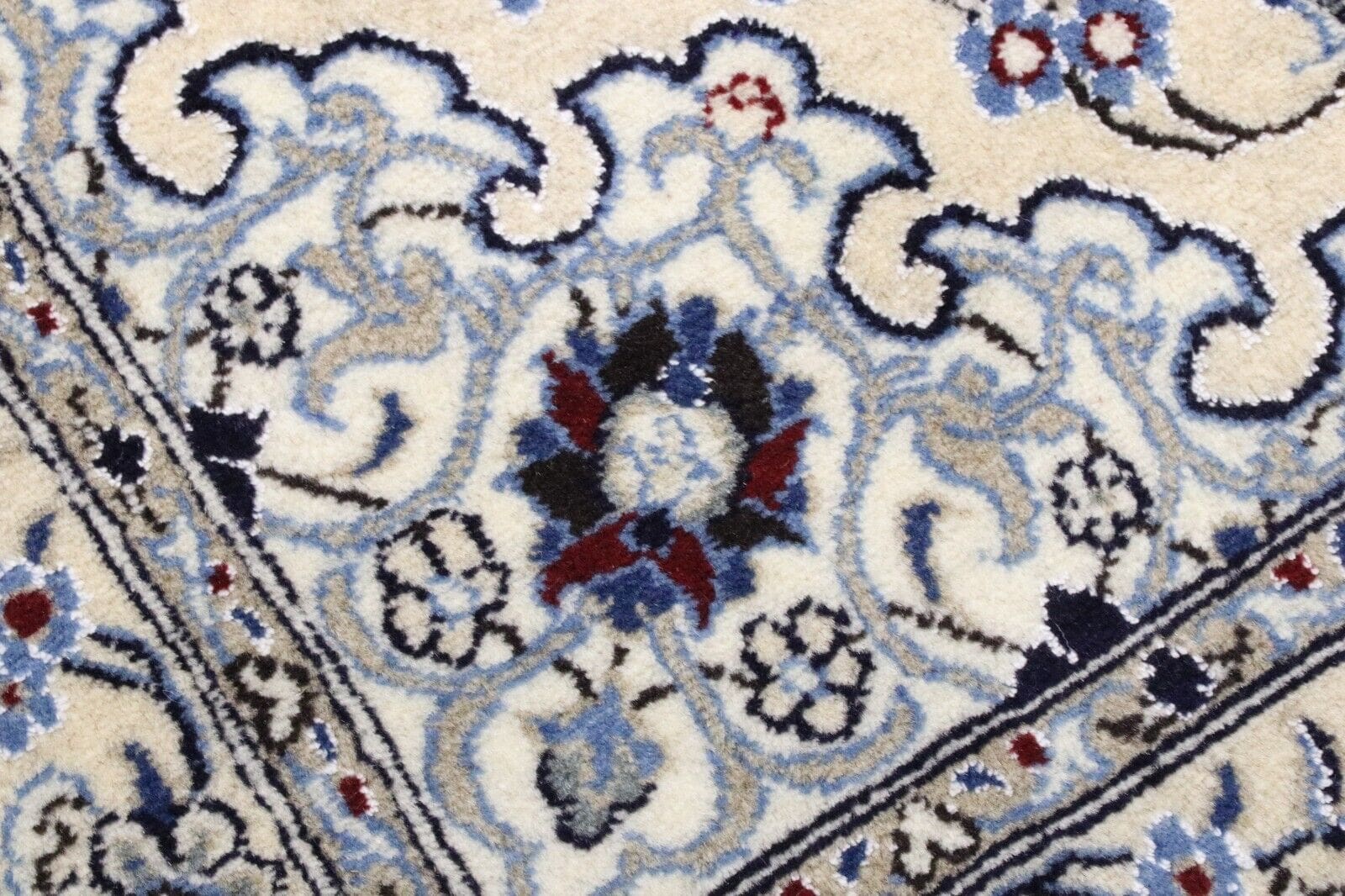 Die Designs und Muster des Perserteppichs „Super Nain“ sind charakteristisch für die Region Nain, die für ihre feinen, detaillierten Motive bekannt ist. Die kunstvollen floralen und geometrischen Muster sind nicht nur ästhetisch ansprechend, sondern erzählen auch Geschichten aus der reichen Kultur und Tradition Persiens. Dieser Teppich ist somit nicht nur ein funktionales Objekt, sondern auch ein Stück Geschichte und Kunst, das jeden Raum aufwertet.