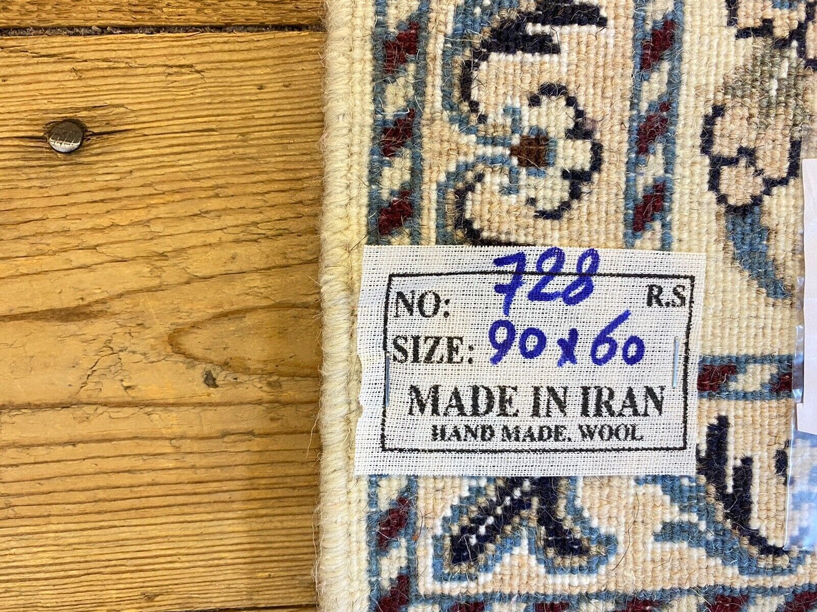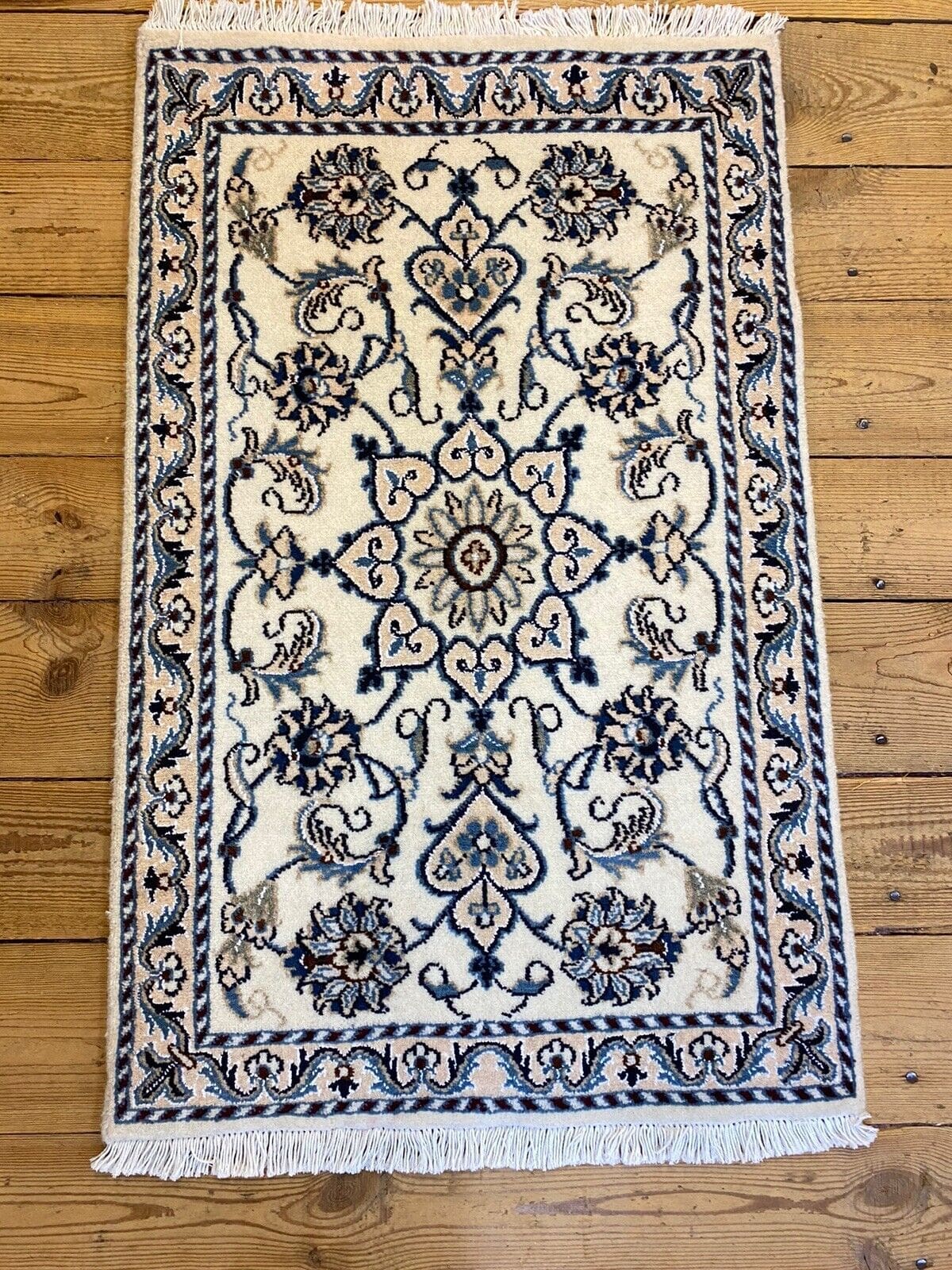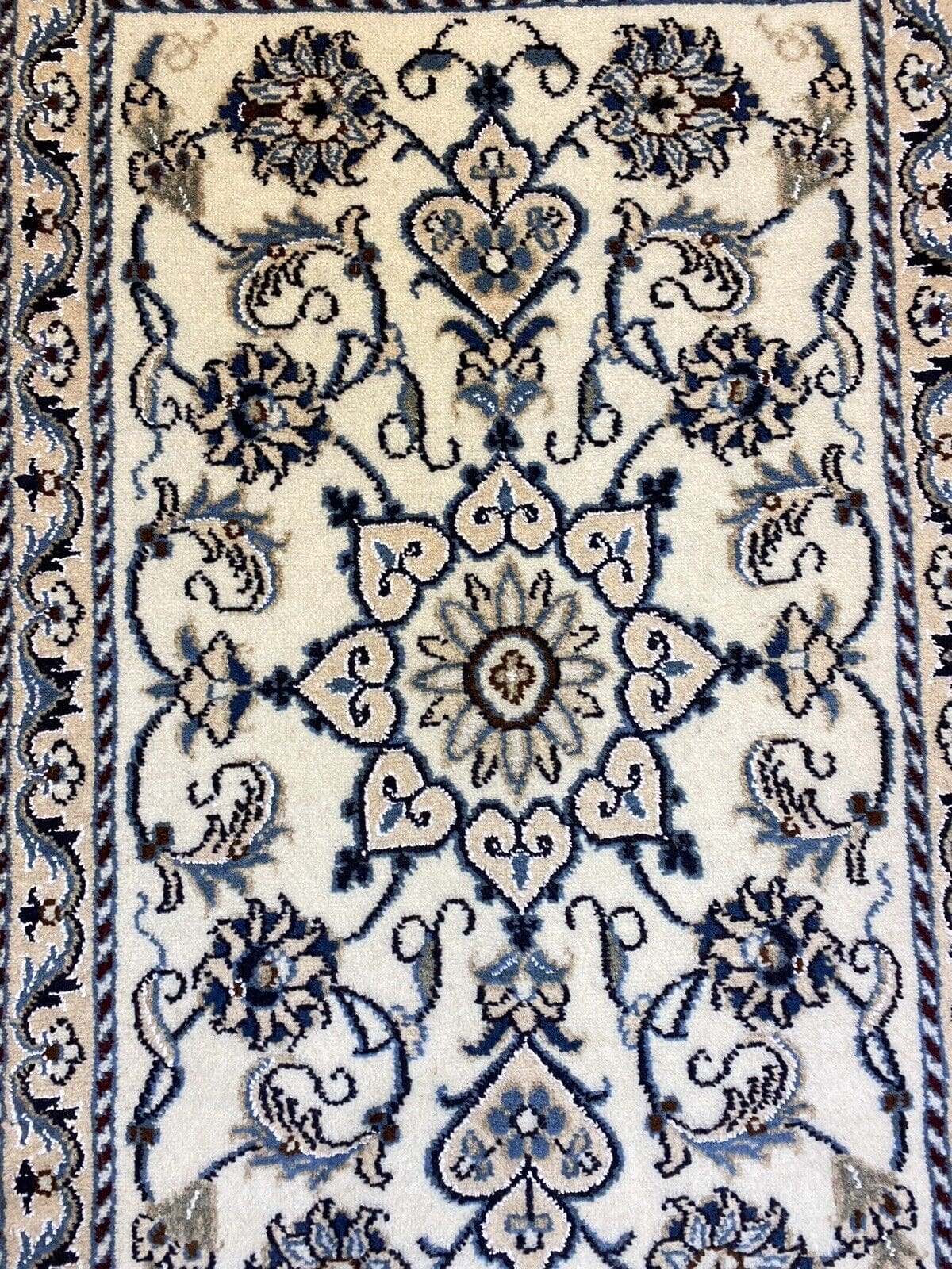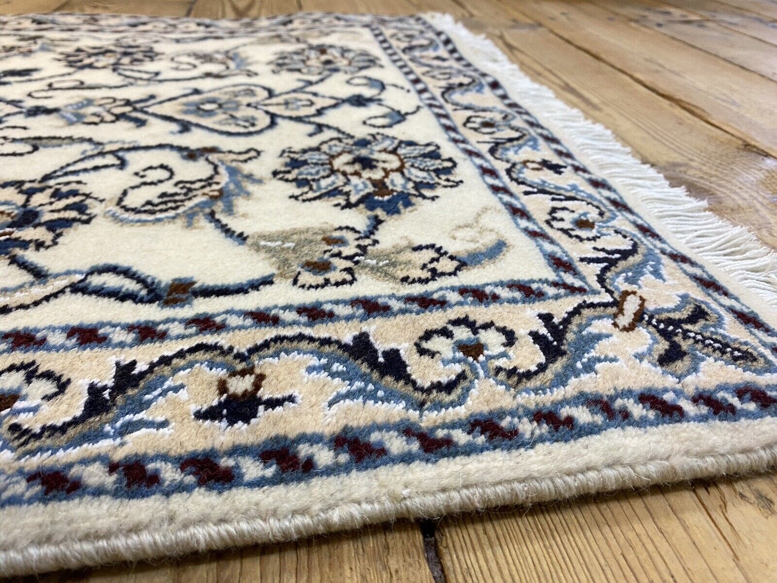 Orientteppich super Nain | Handgeknüpft | Größe: 90 x 60 cm | Knotendichte: ca. 300.000 Knoten/m² | Material: 90 % Schurwolle, 10 % Seide, 100 % Baumwolle | Zustand: Neu und perfekt | Herkunft: Persien | Dicke: ca. 8 mm | Stil: Traditionell Orientalisch/Persisch | Geeignet für Fußbodenheizung, haustier- und kinderfreundlich | Muster: Orientalisch | Farbe: Weiß