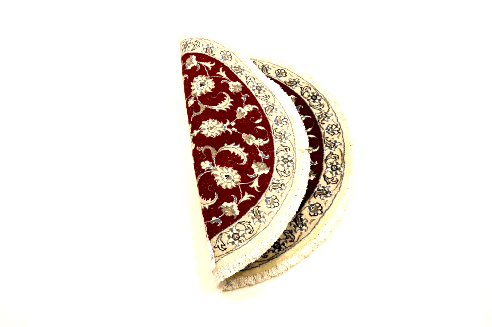 Orientteppich Nain | Größe: 100 x 100 cm | Knotendichte: ca. 300.000 Knoten/m² | Material: 90% Schurwolle, 10% Seide | Zustand: Neu, perfekt | Herkunft: Persien | Dicke: ca. 8 mm | Stil: Traditionell Orientalisch/Persisch | Besonderheiten: Für Fußbodenheizung geeignet, haustierfreundlich | Form: Rund | Farbe: Rot