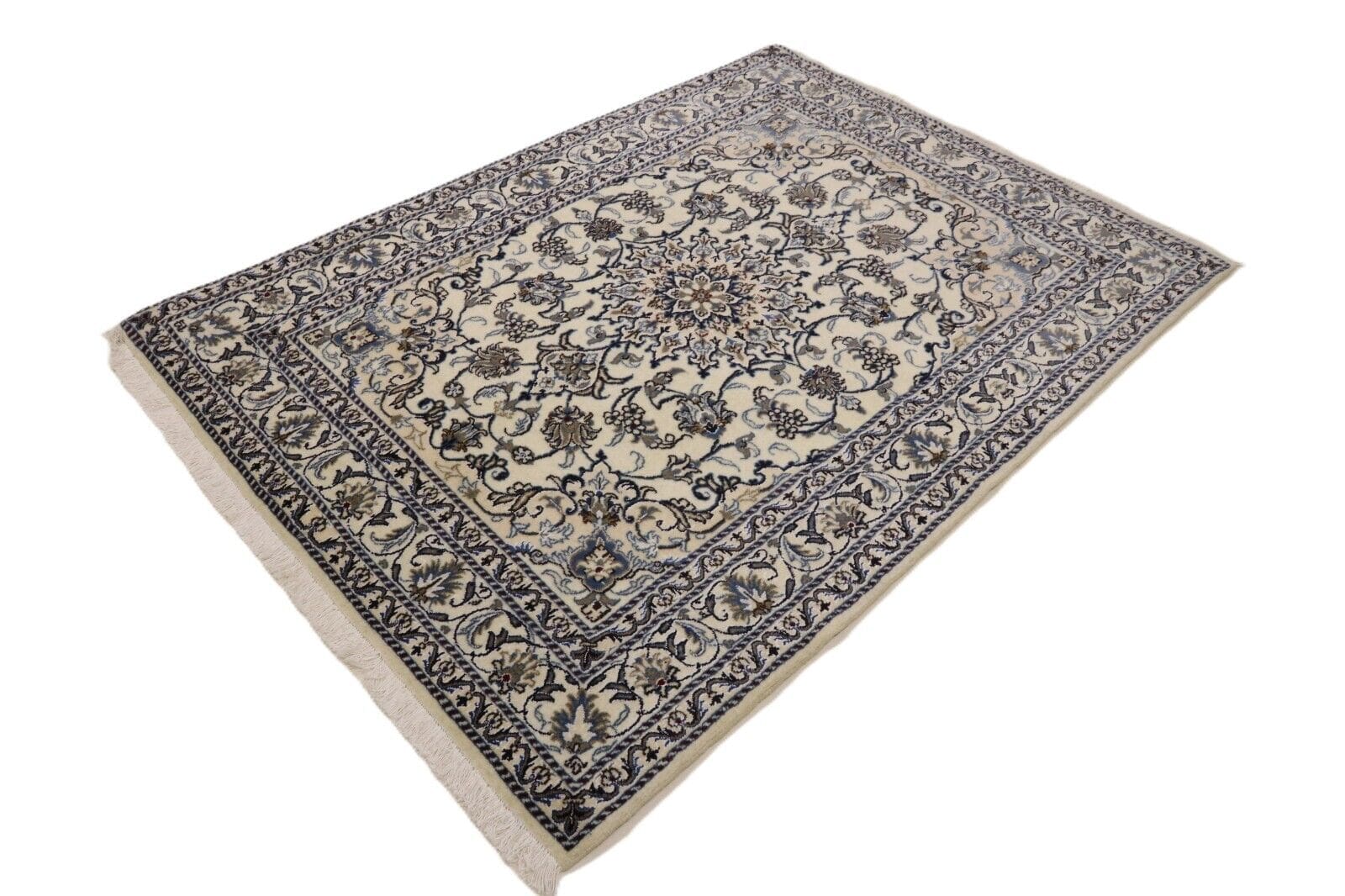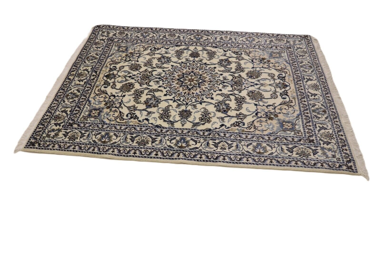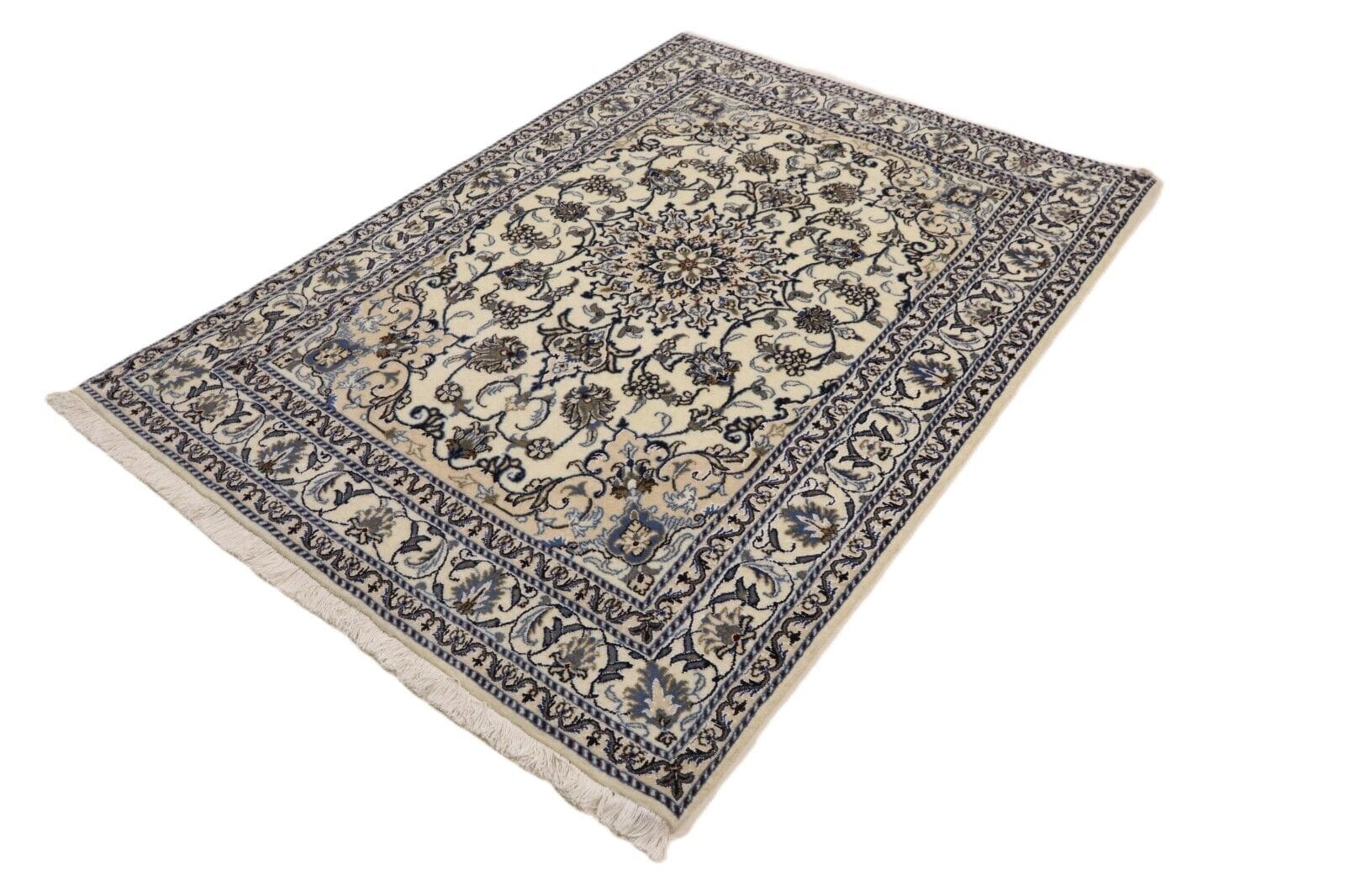 Orientteppich Nain | Größe: 198 x 143 cm | Material: 90% Schurwolle, 10% Seide | Knotendichte: ca. 300.000 Knoten/m² | Zustand: Neu, sehr gut | Herkunft: Persien | Dicke: ca. 8 mm | Stil: Traditionell Orientalisch/Persisch | Für Fußbodenheizung geeignet | Handgeknüpft, Unikat | Farbe: Weiß