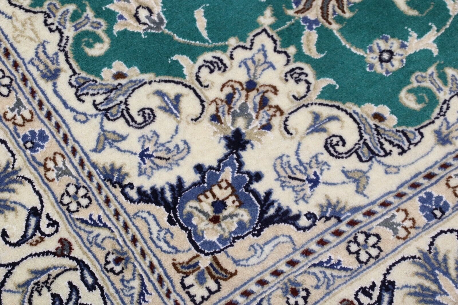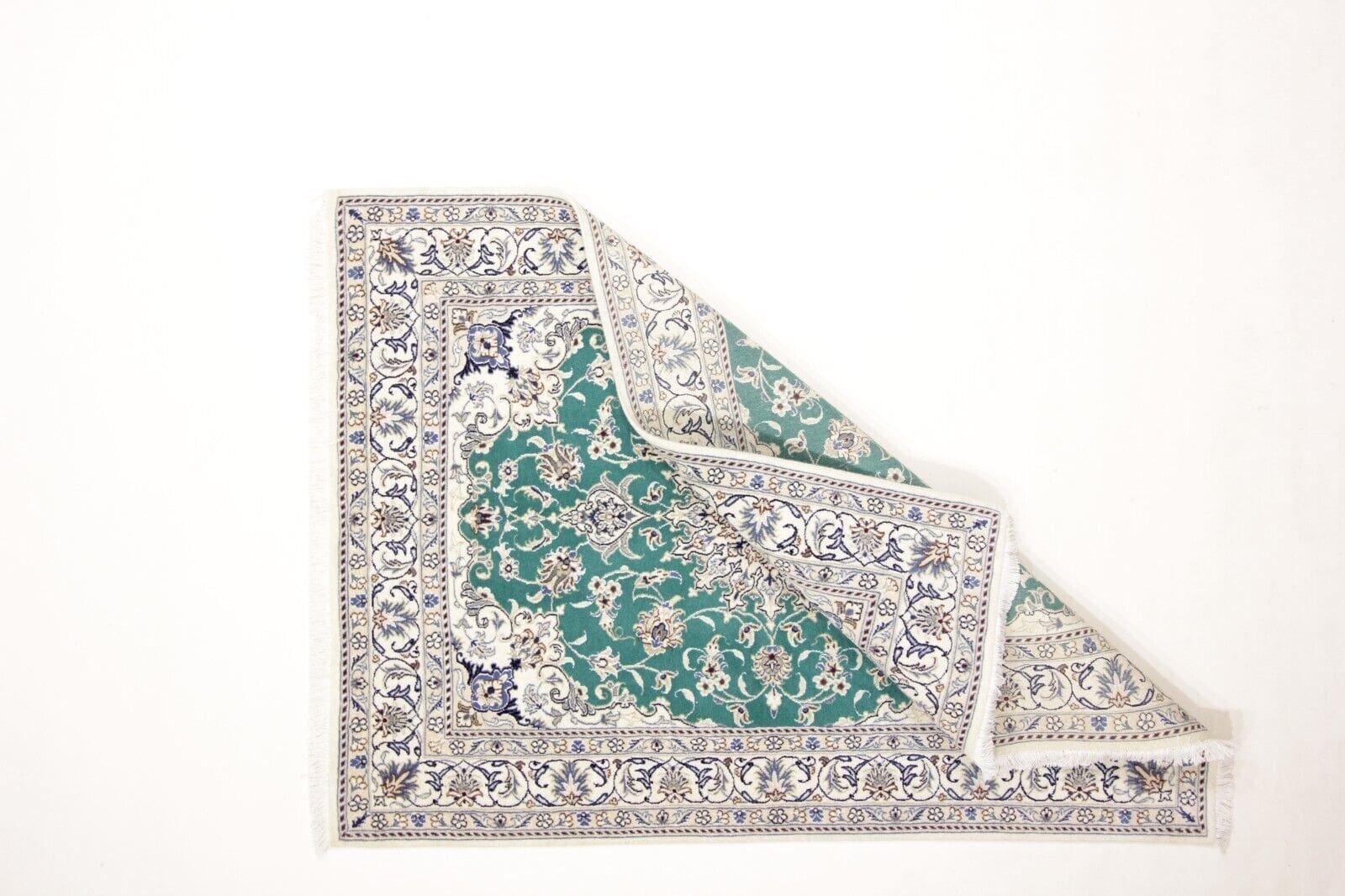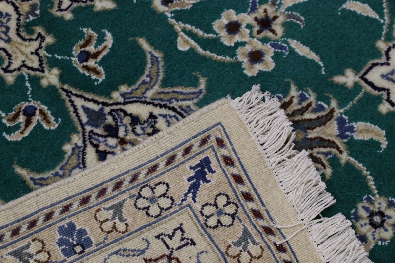 Orientteppich Super Nain | Handgeknüpft | Knotendichte: 300.000 Knoten/m² | Material: 90% Schurwolle, 10% Seide, 100% Baumwolle | Größe: 200 x 150 cm | Zustand: Neu, perfekt | Herkunft: Persien | Farbe: Grün | Dicke: Ca. 8 mm | Für Fußbodenheizung geeignet, haustierfreundlich | Stil: Traditionell Orientalisch/Persisch