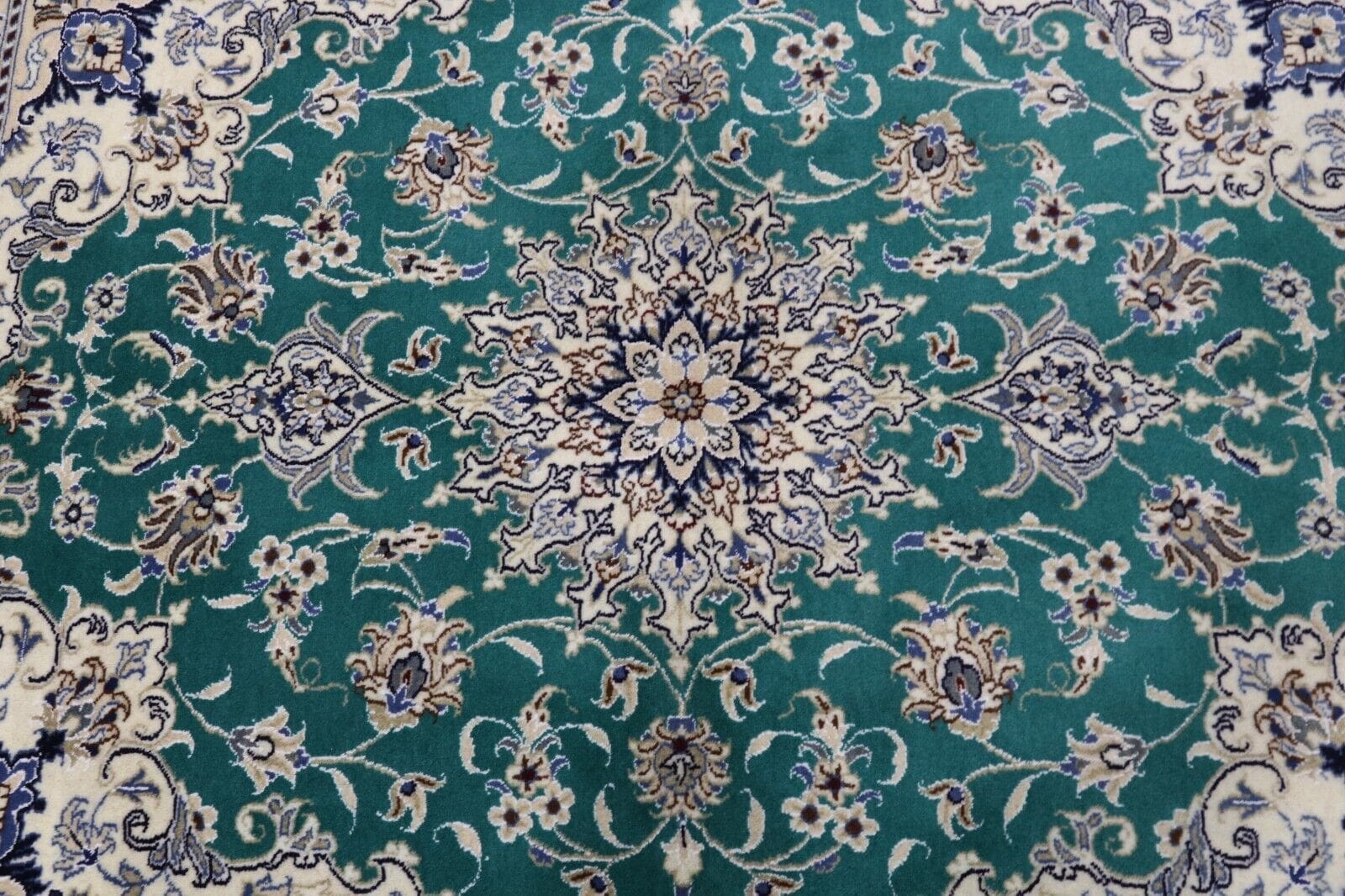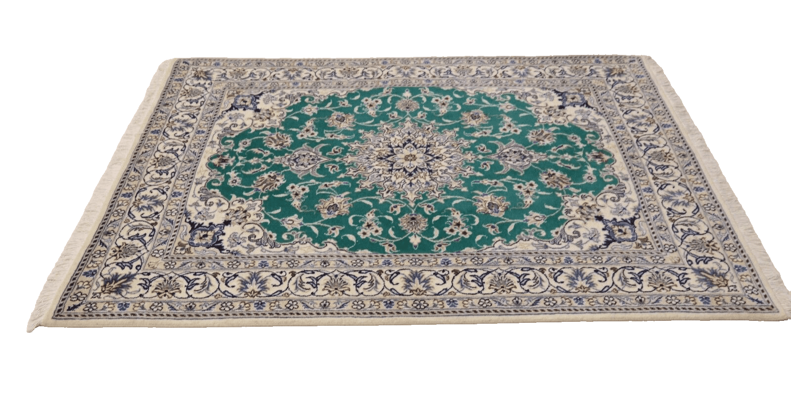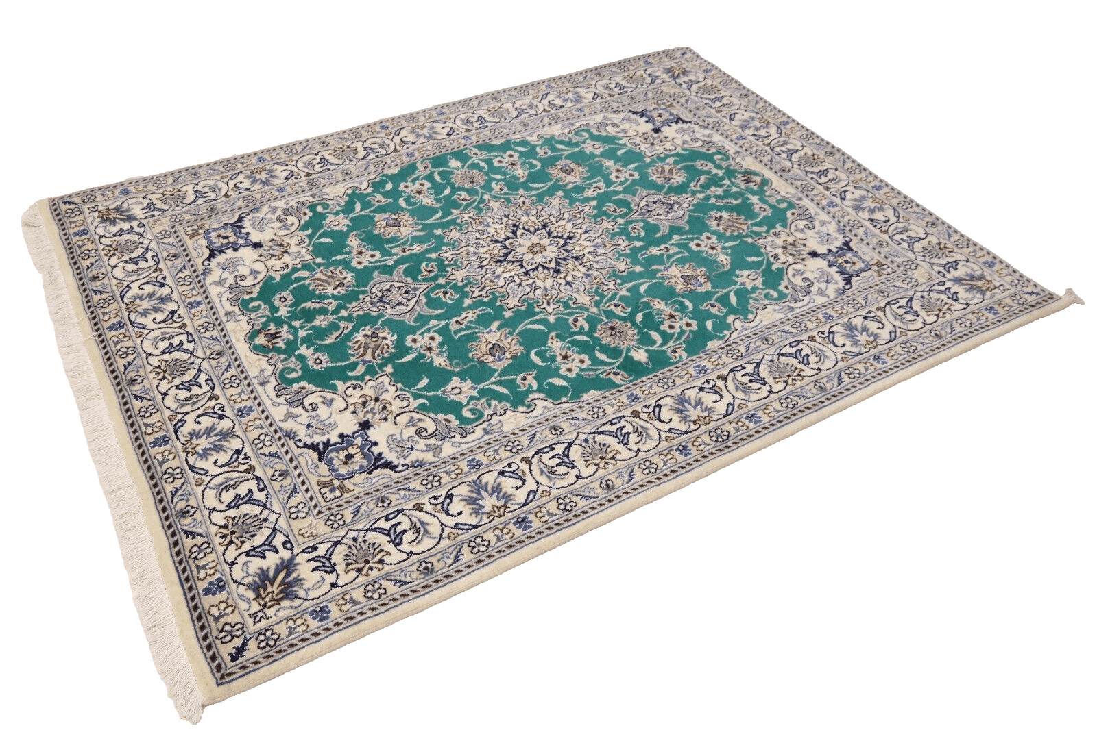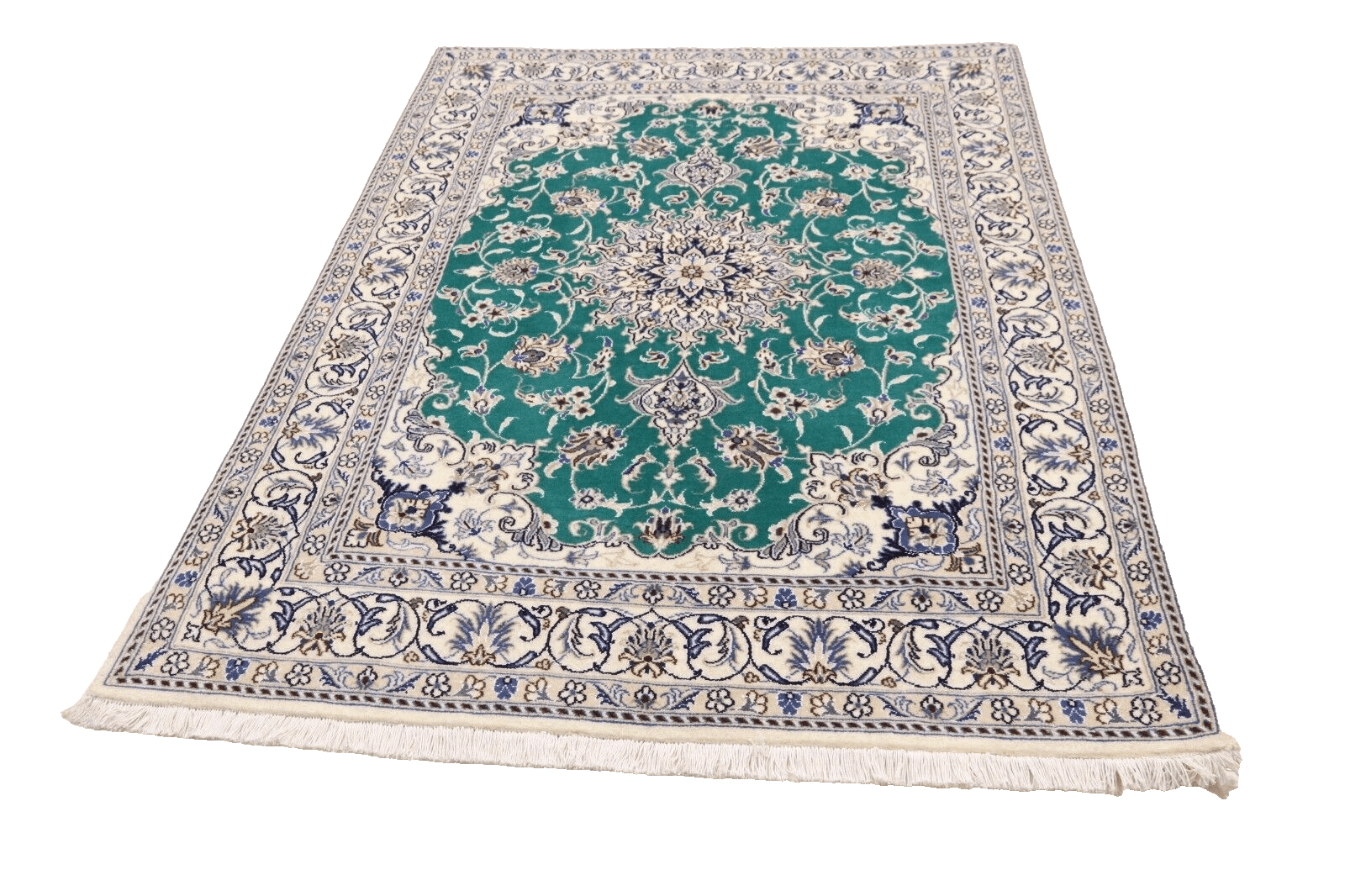 Orientteppich Super Nain | Handgeknüpft | Knotendichte: 300.000 Knoten/m² | Material: 90% Schurwolle, 10% Seide, 100% Baumwolle | Größe: 200 x 150 cm | Zustand: Neu, perfekt | Herkunft: Persien | Farbe: Grün | Dicke: Ca. 8 mm | Für Fußbodenheizung geeignet, haustierfreundlich | Stil: Traditionell Orientalisch/Persisch