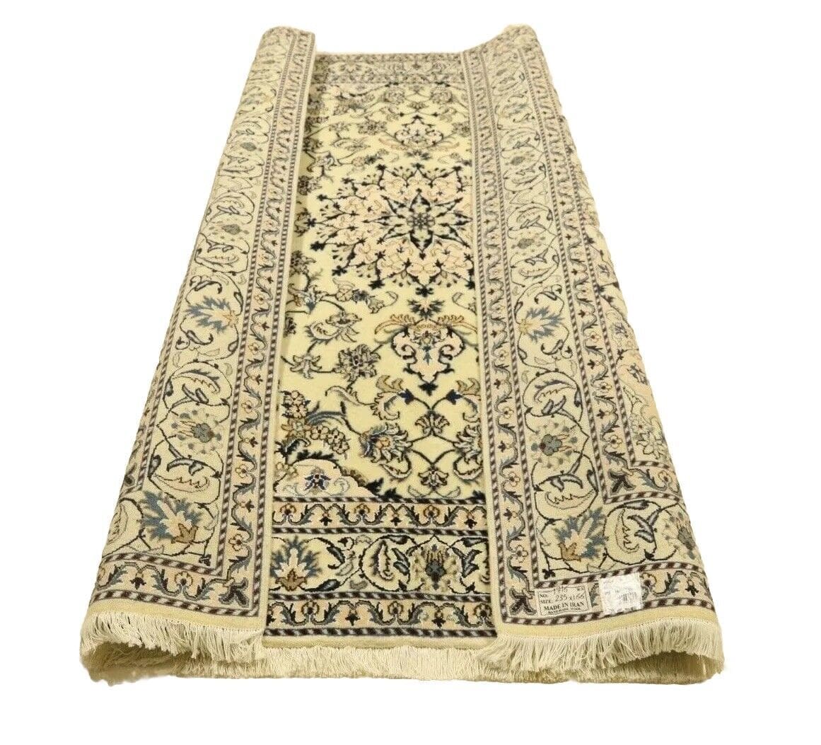 Der Teppich stammt aus dem Iran und ist somit ein authentischer Perserteppich, der in der berühmten Stadt Nain gefertigt wurde. Nain ist bekannt für seine exquisiten Teppiche, die oft mit detaillierten, floralen Motiven und eleganten Farbschemata beeindruckend auffallen. Diese Stadt hat eine lange Geschichte in der Teppichwebkunst, beginnend im 18. Jahrhundert, als lokale Handwerker begannen, ihre eigene Technik und Designs zu entwickeln. Die Teppiche aus Nain sind besonders wegen ihrer feinen Verarbeitung und der Verwendung von Seide geschätzt, die den Teppichen einen einzigartigen Glanz verleiht.