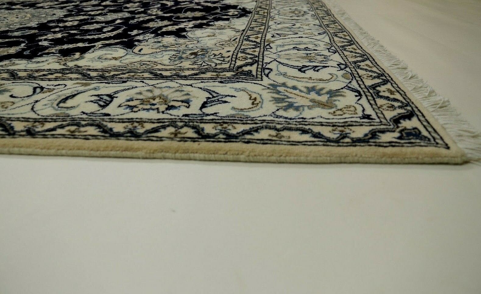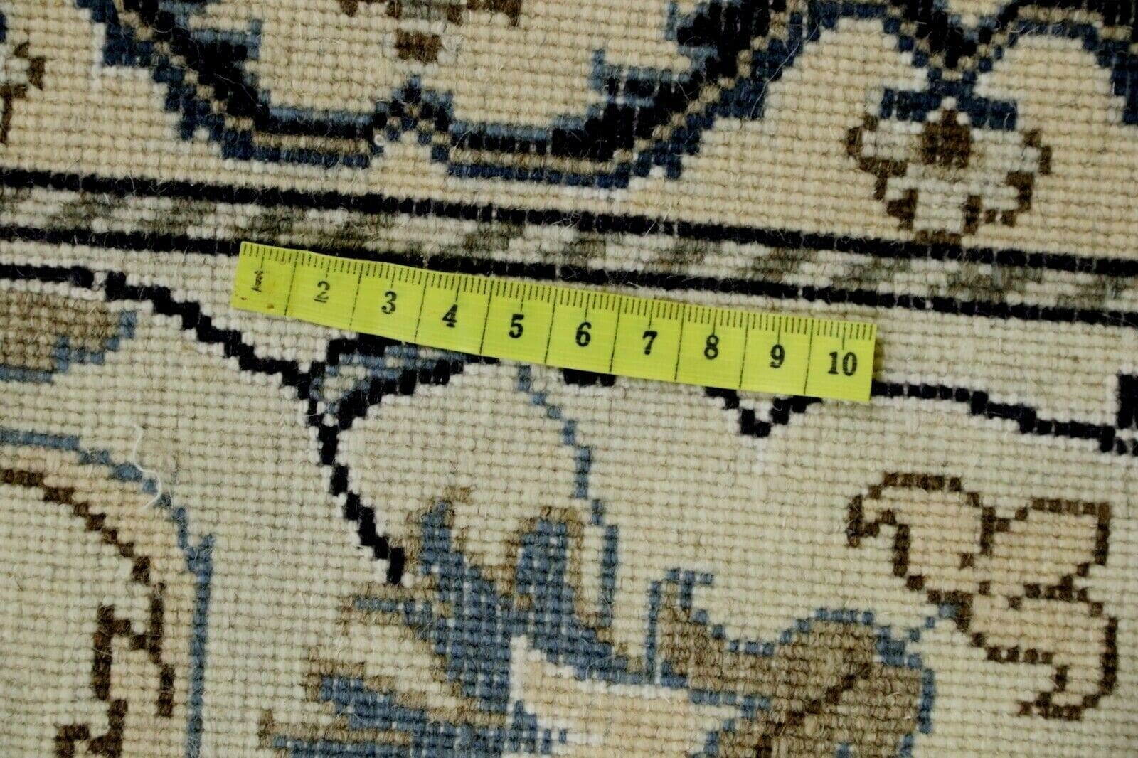 Der wunderschöne Orientteppich Super Nain ist ein beeindruckendes Beispiel traditioneller Teppichkunst und kombiniert exquisite Materialien mit meisterhafter Handwerkskunst. Dieser handgeknüpfte Perserteppich zeichnet sich durch eine hohe Knotendichte von ca. 300.000 Knoten pro Quadratmeter aus, was seine hervorragende Qualität und Langlebigkeit unterstreicht. Gefertigt aus 90% Schurwolle und 10% Seide, vereint er sowohl Robustheit als auch einen unvergleichlichen Glanz, der jedem Raum eine elegante Note verleiht.