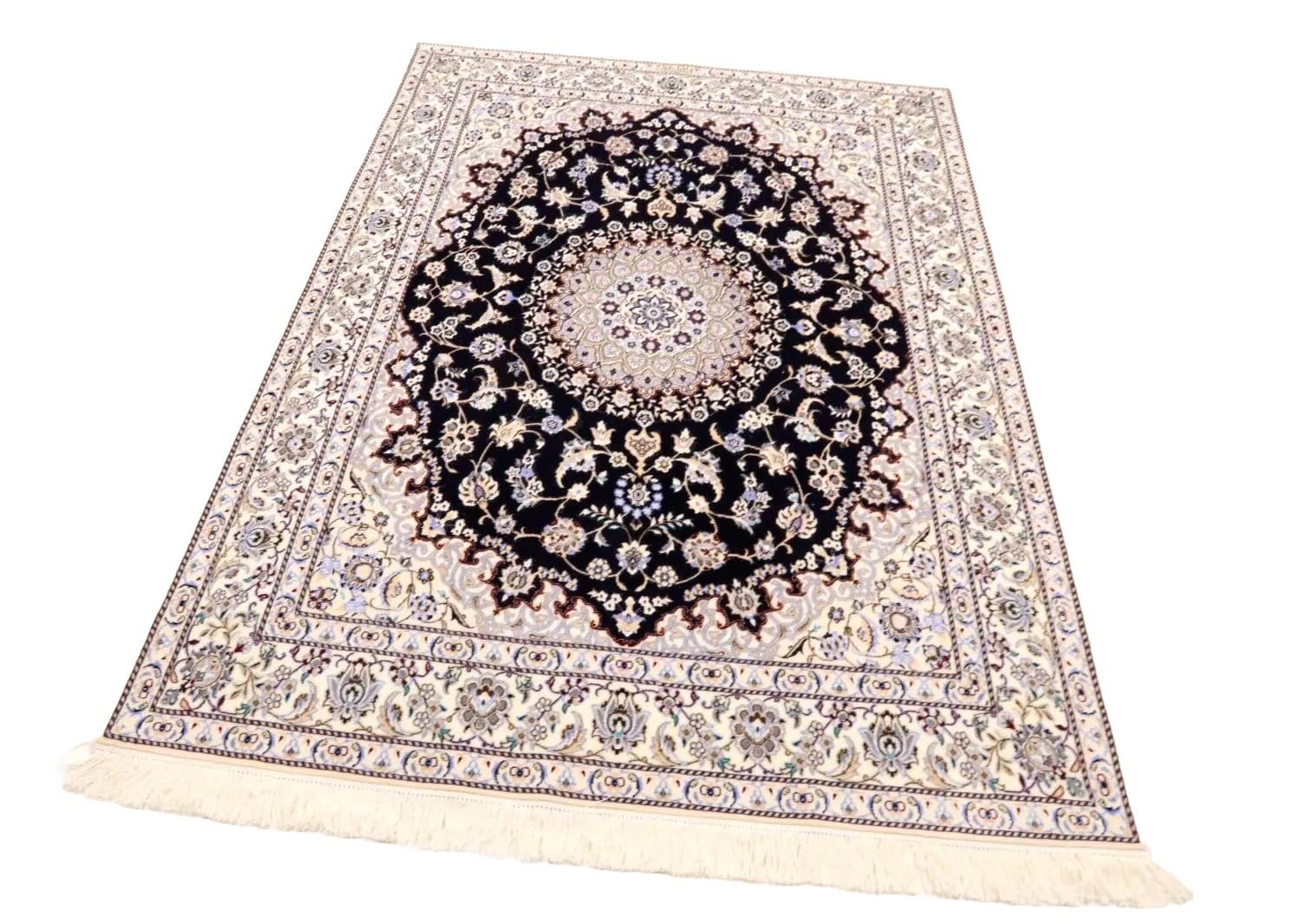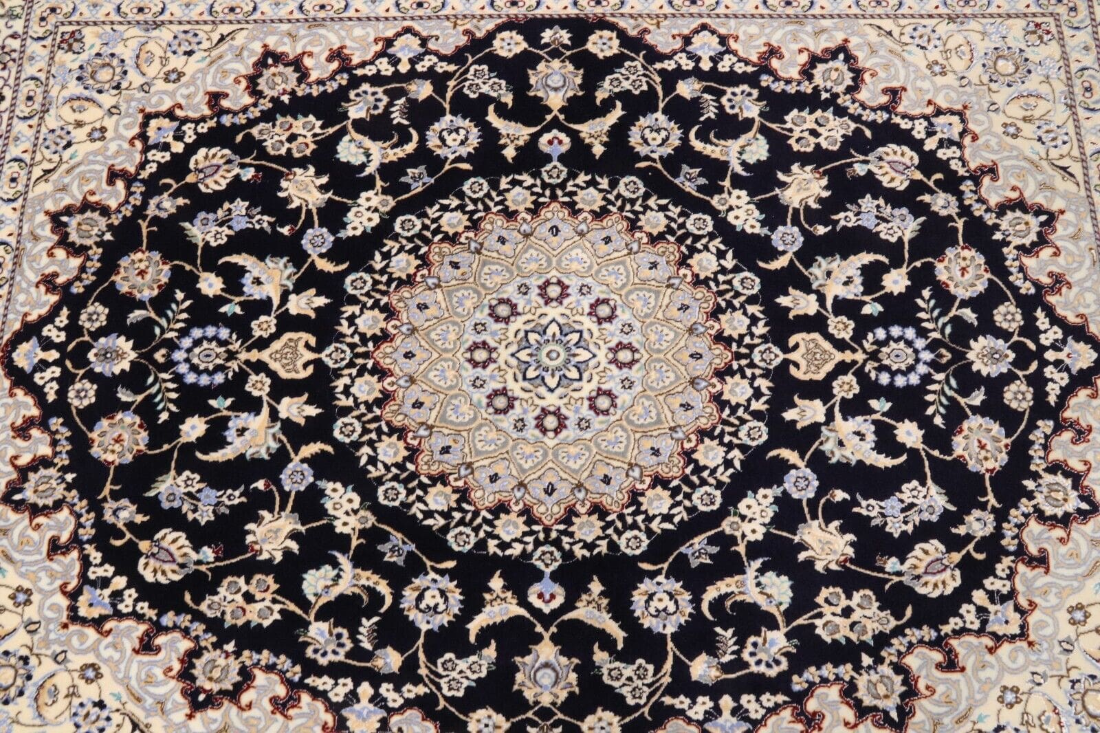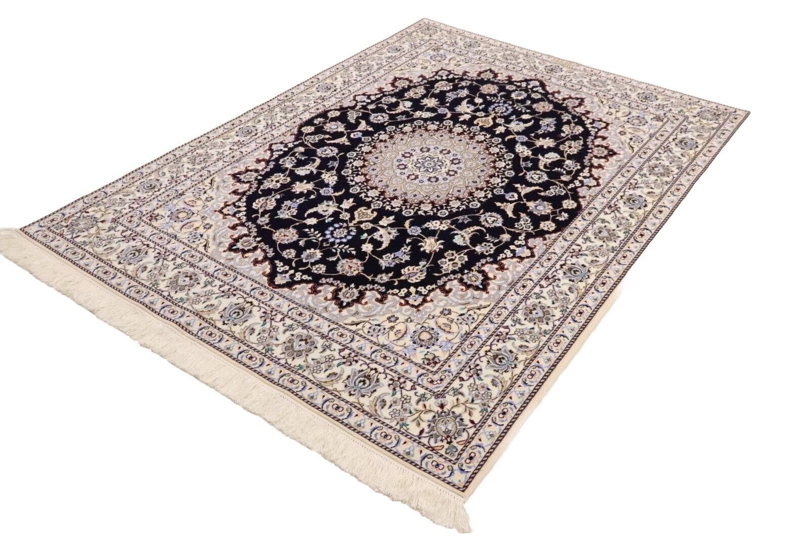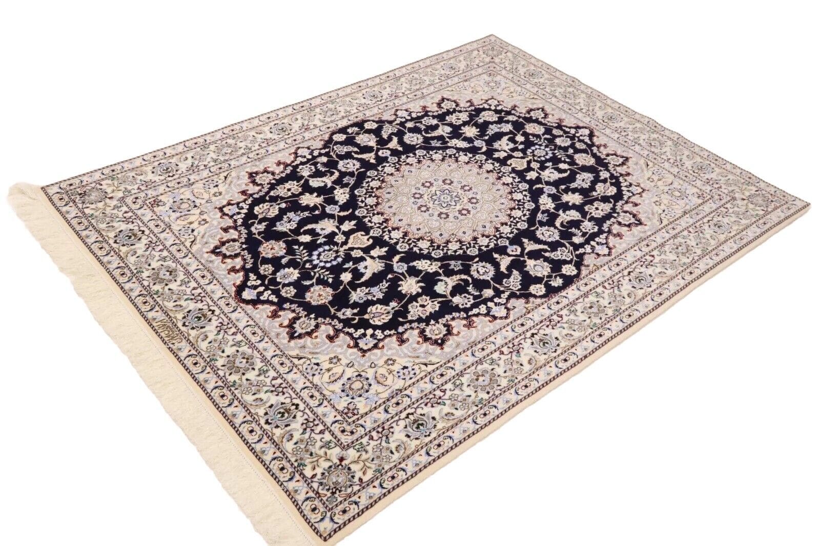 Wunderschöner Orientteppich Super Nain 6 La | Knotendichte: ca. 1.000.000 Knoten/m² | Material: 80% Korkwolle, 20% Naturseide | Größe: 202 x 151 cm | Zustand: Neu und perfekt | Herkunft: Persien | Verarbeitung: Handgeknüpft | Florhöhe: 6 mm | Farbe: Dunkelblau/Weiß