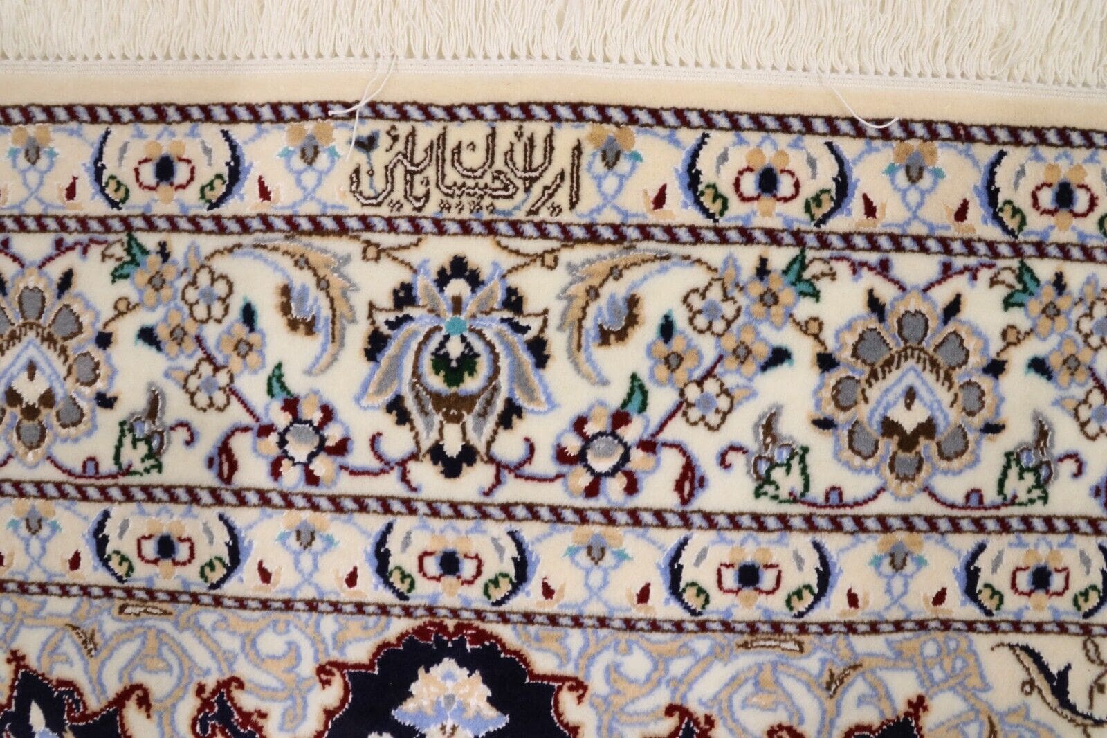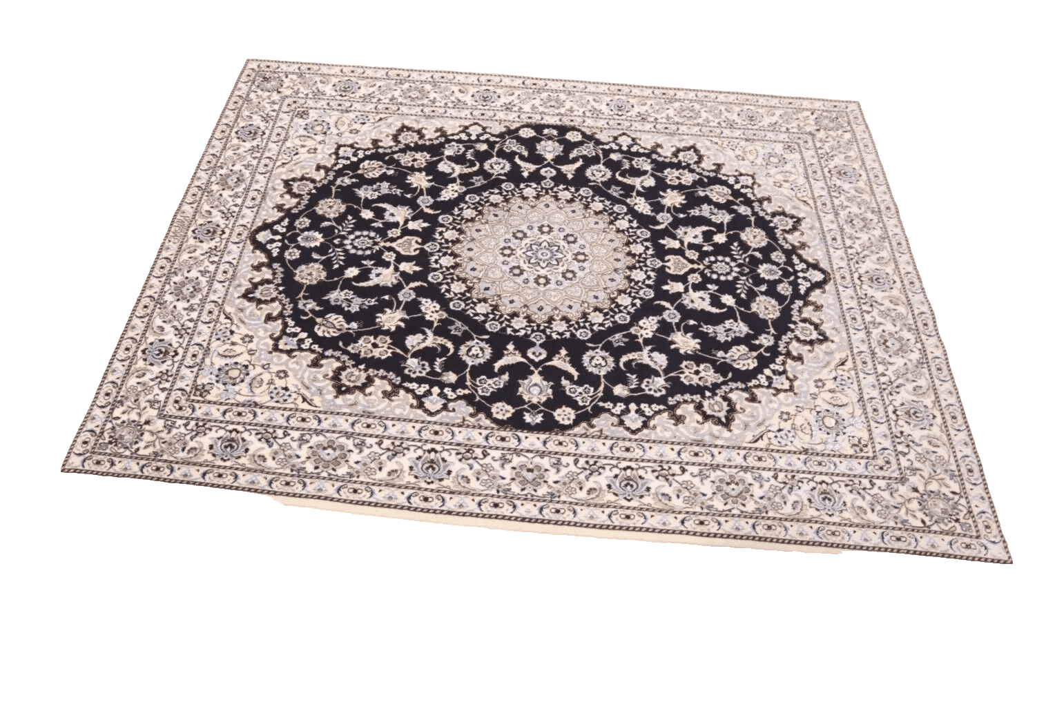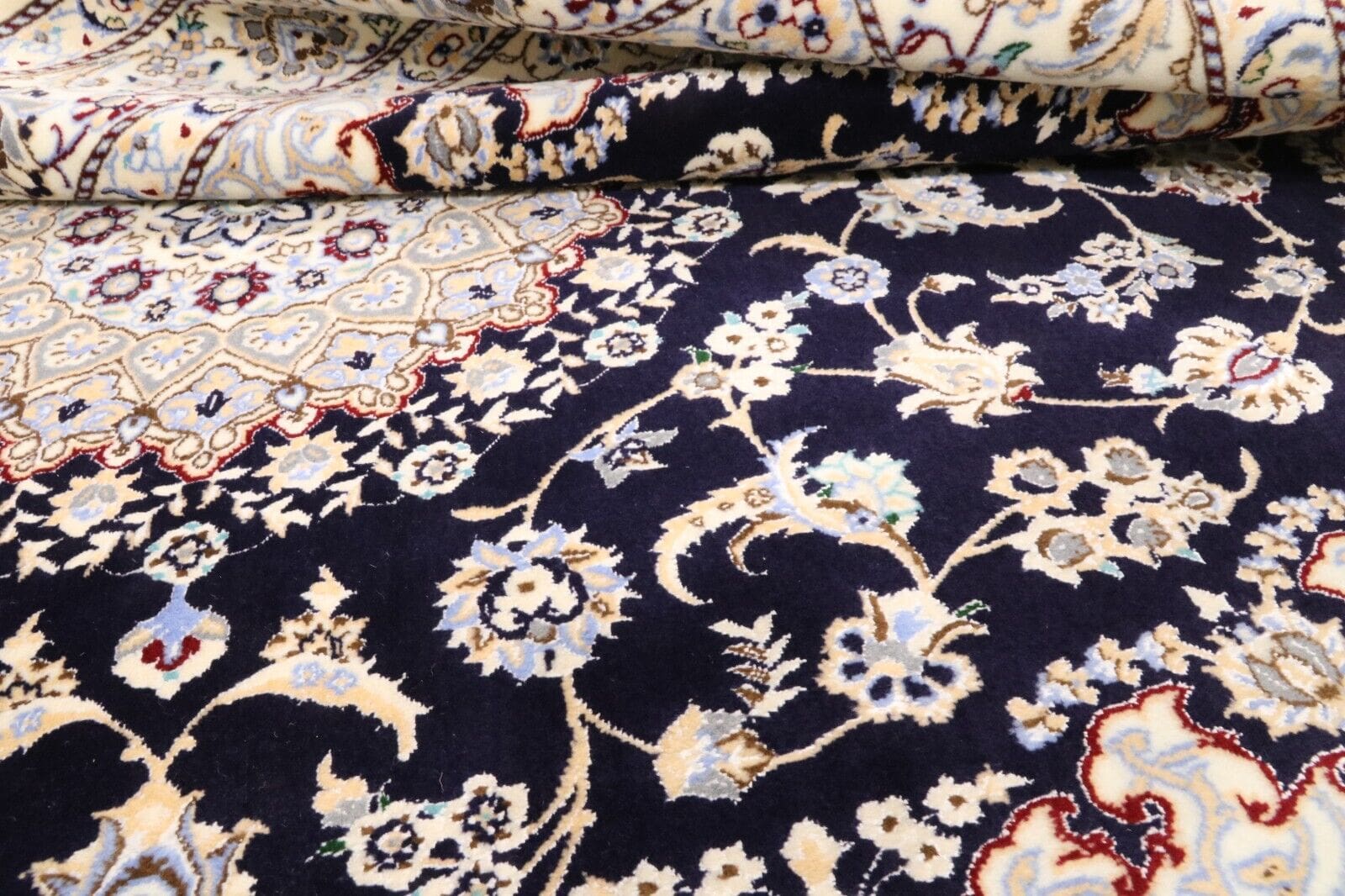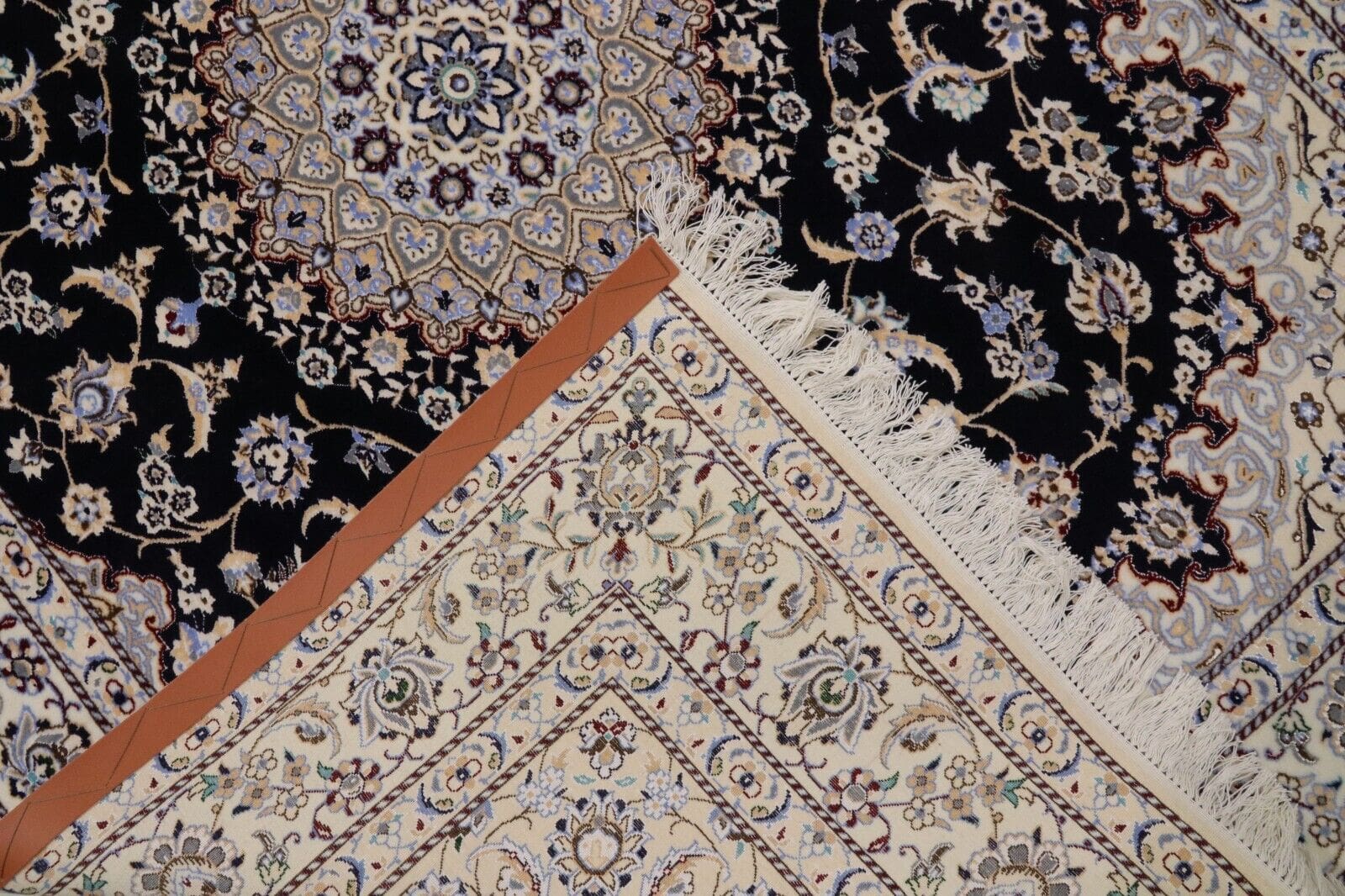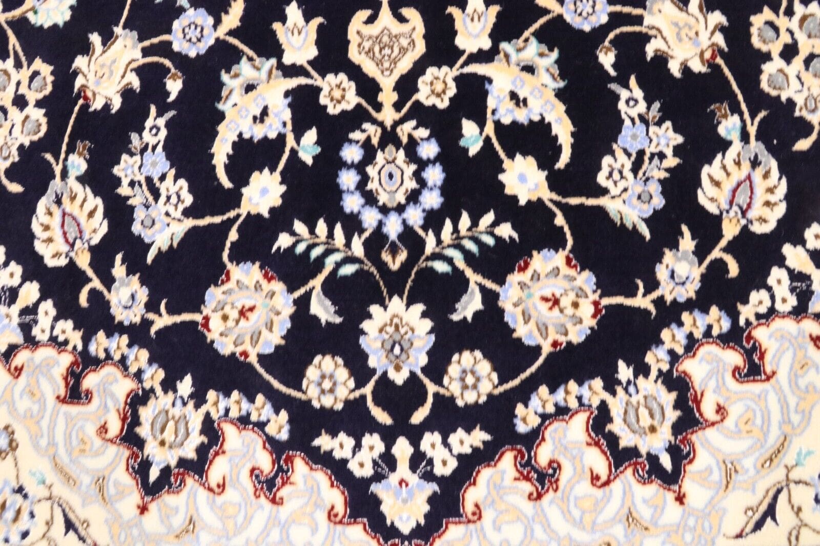 Wunderschöner Orientteppich Super Nain 6 La | Knotendichte: ca. 1.000.000 Knoten/m² | Material: 80% Korkwolle, 20% Naturseide | Größe: 202 x 151 cm | Zustand: Neu und perfekt | Herkunft: Persien | Verarbeitung: Handgeknüpft | Florhöhe: 6 mm | Farbe: Dunkelblau/Weiß