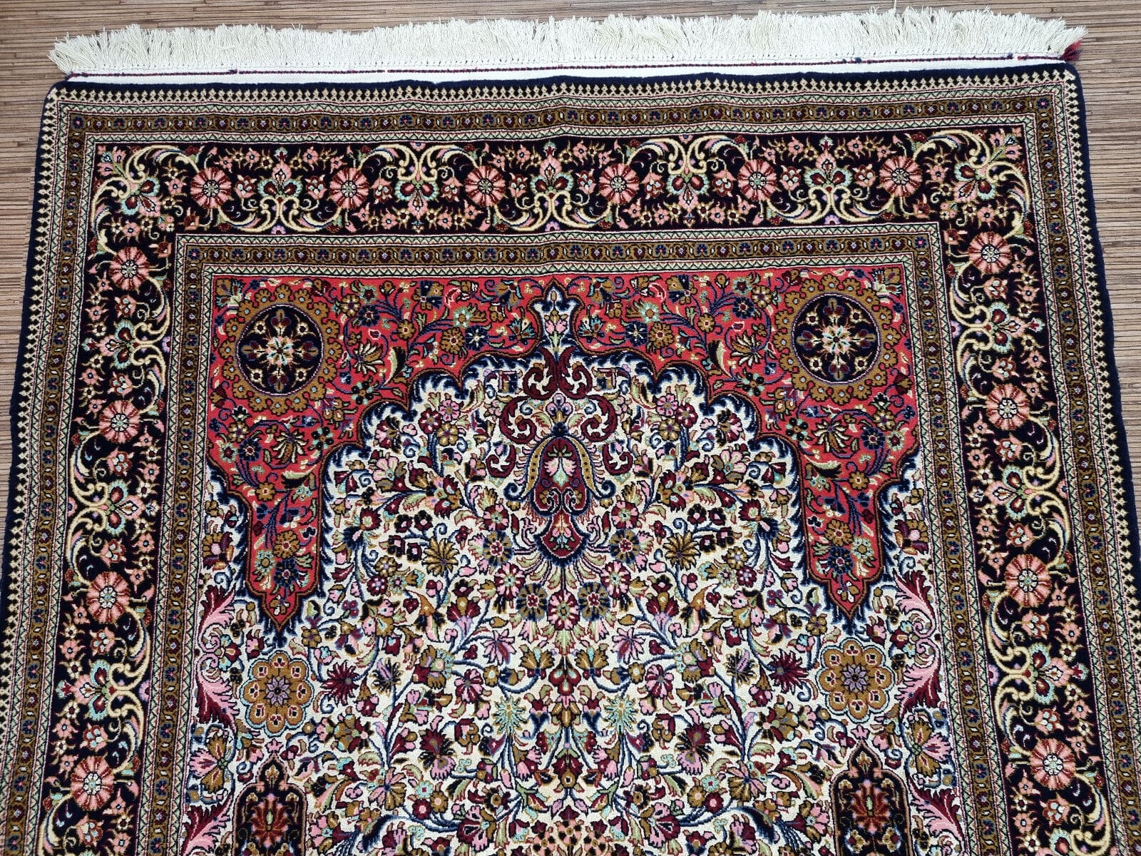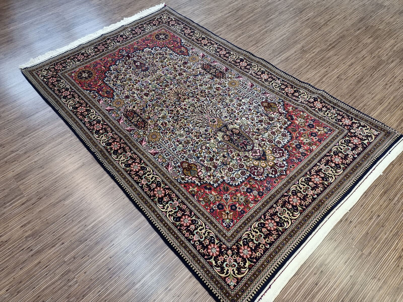 Wunderschöner Original Alter Persischer Ghom | Knotendichte: Handgeknüpft | Material: Korkwolle & Seide auf Baumwolle | Größe: 231×139 cm | Muster: Orientalisch | Zustand: Sehr gut, frisch gewaschen | Ursprung: Persien | Herstellungszeitraum: 1960-1969