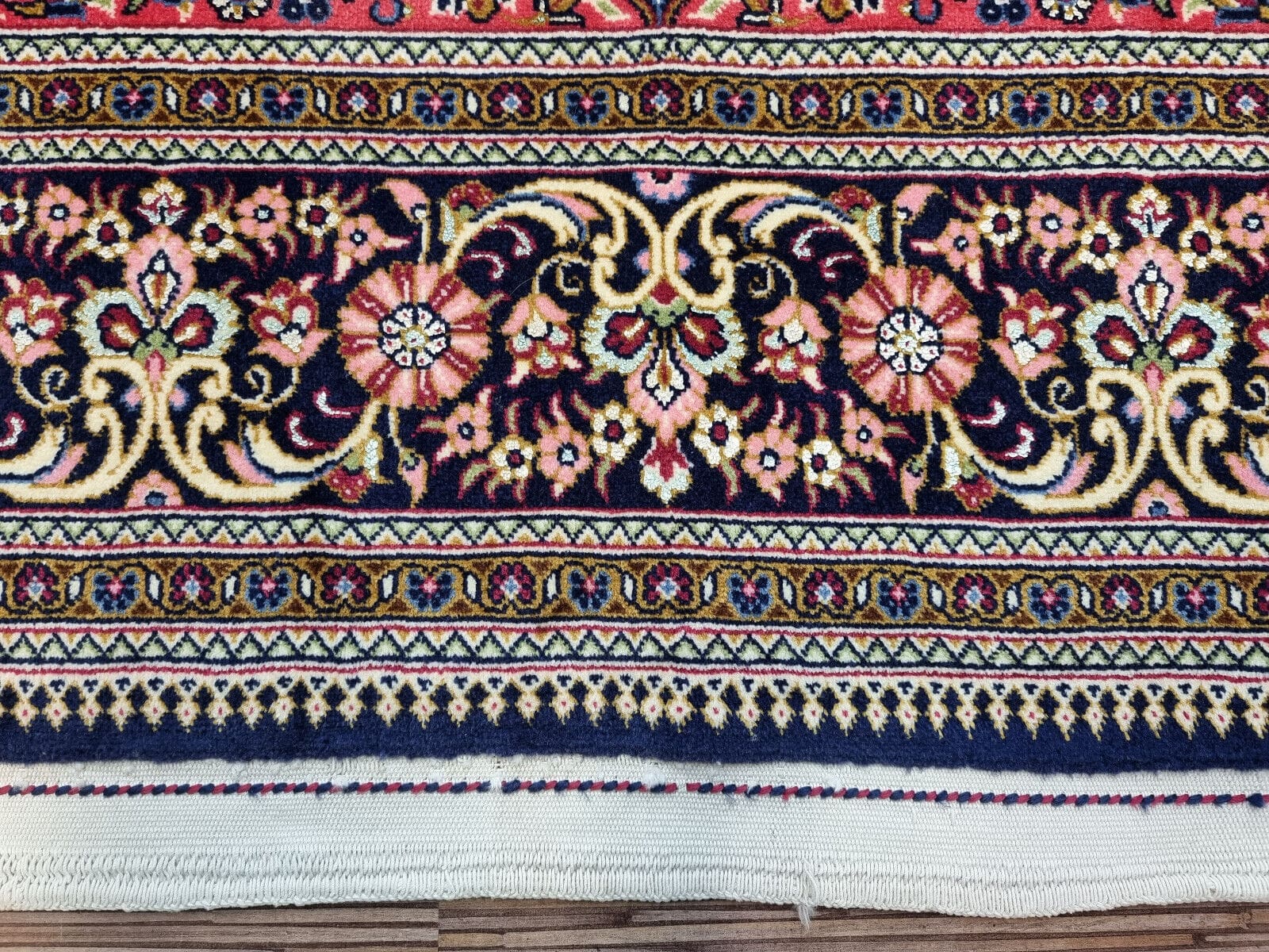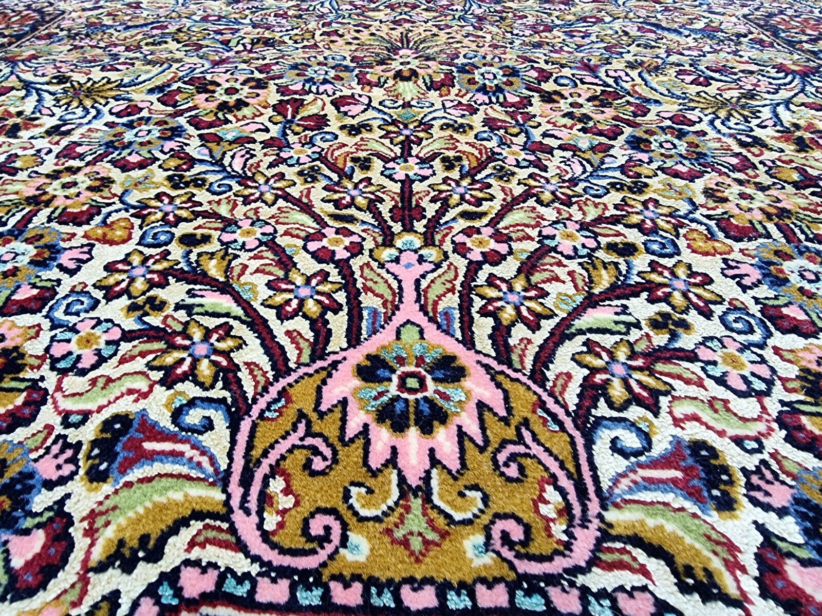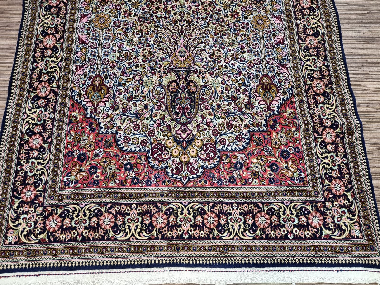Dieser Perserteppich wurde aus feinstem Wollmaterial handgeknüpft, das für seine Langlebigkeit und Widerstandsfähigkeit bekannt ist. Die Verwendung von Wolle sorgt dafür, dass der Teppich nicht nur weich und warm ist, sondern auch eine hervorragende Schmutzresistenz aufweist. Die hohe Knotendichte, die typisch für Ghom-Teppiche ist, zeugt von der exzellenten Handwerkskunst, die in jedem einzelnen Knoten sichtbar wird. Jedes Detail ist mit höchster Präzision gearbeitet, was diesem Teppich eine besondere Textur und Haptik verleiht.