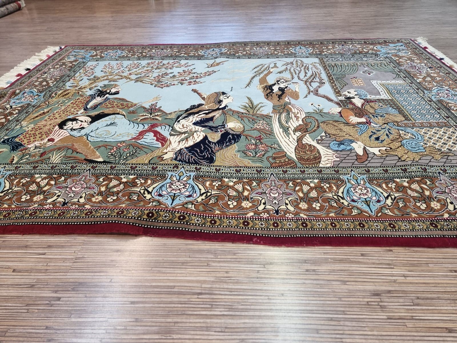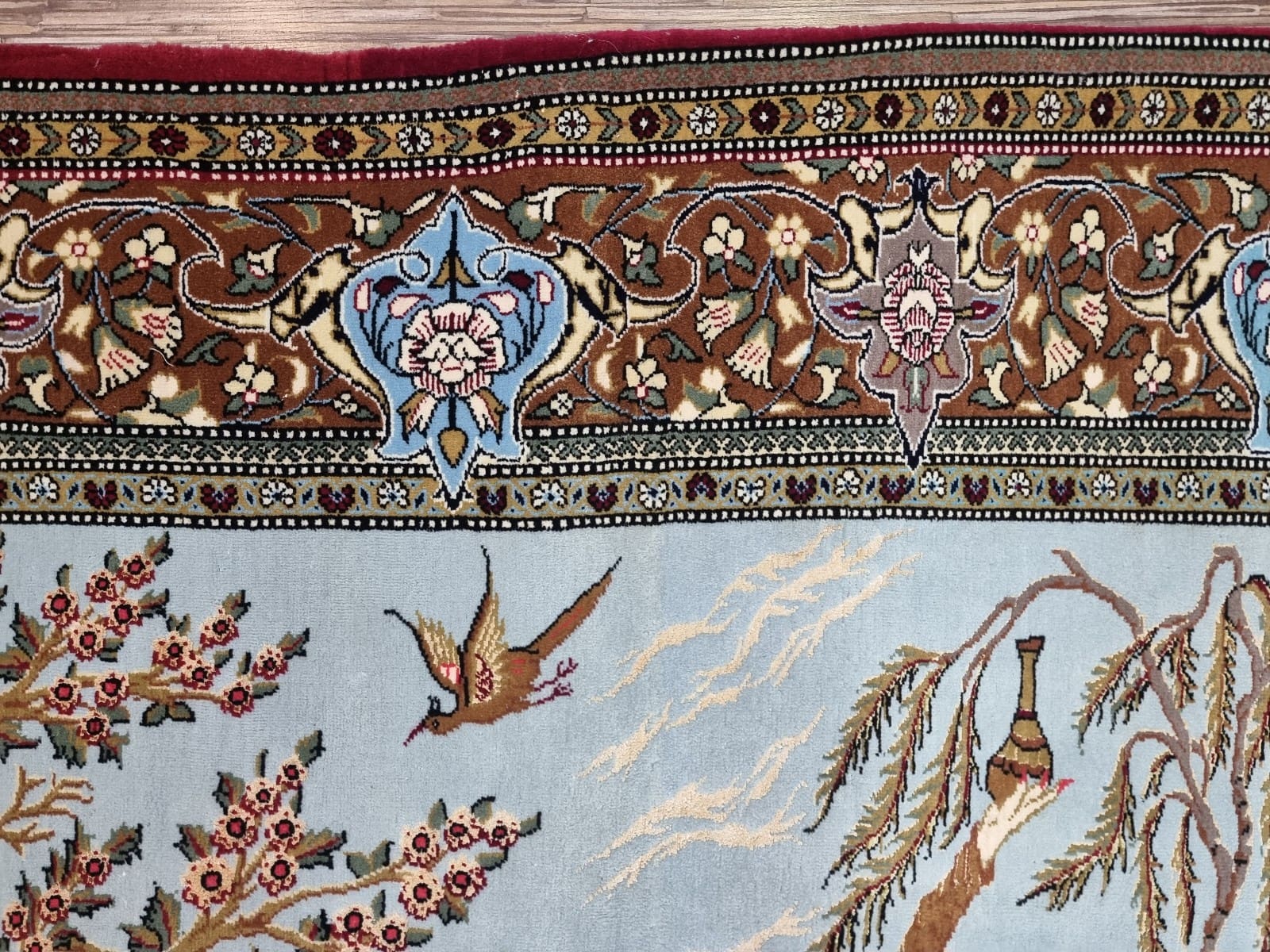 Die Kombination aus Wolle und Seide im Ghom-Teppich bietet eine perfekte Symbiose aus Komfort und Anmut. Während das Wolle dafür sorgt, dass der Teppich robust und widerstandsfähig ist, verleiht die Seide ihm einen schimmernden Glanz, der ihn zu einem echten Schmuckstück im Raum macht. Der Teppich ist handgeknüpft, was bedeutet, dass jeder einzelne Knoten sorgfältig von Hand hergestellt wurde. Dies zeigt sich in der feinen Detailarbeit und der hohen Qualität des Endprodukts. Teppiche aus Ghom sind bekannt für ihre hohe Knotendichte, die oft bei über 300.000 Knoten pro Quadratmeter liegt, was die Langlebigkeit und die ästhetische Anziehungskraft dieser Teppiche verstärkt.