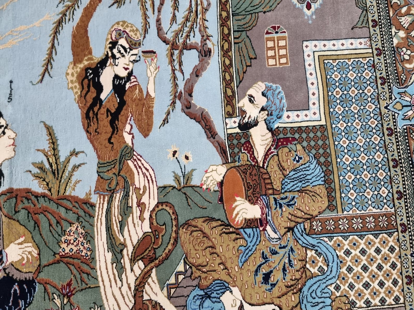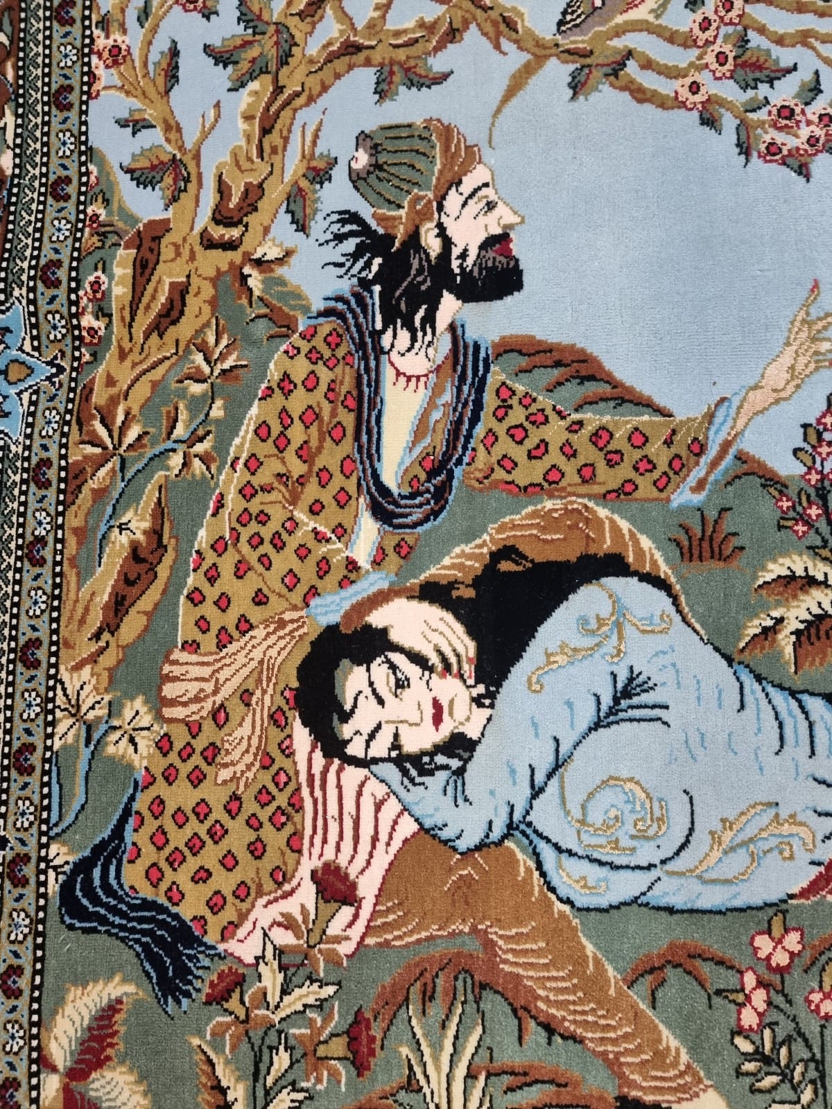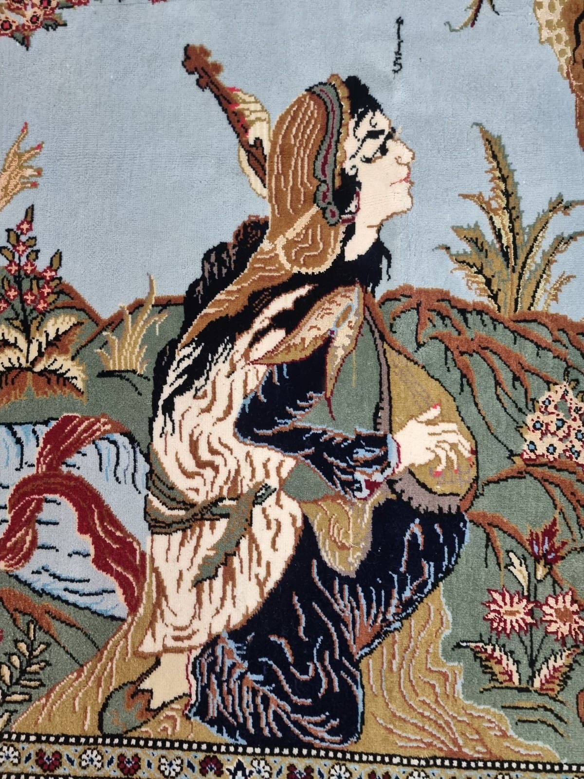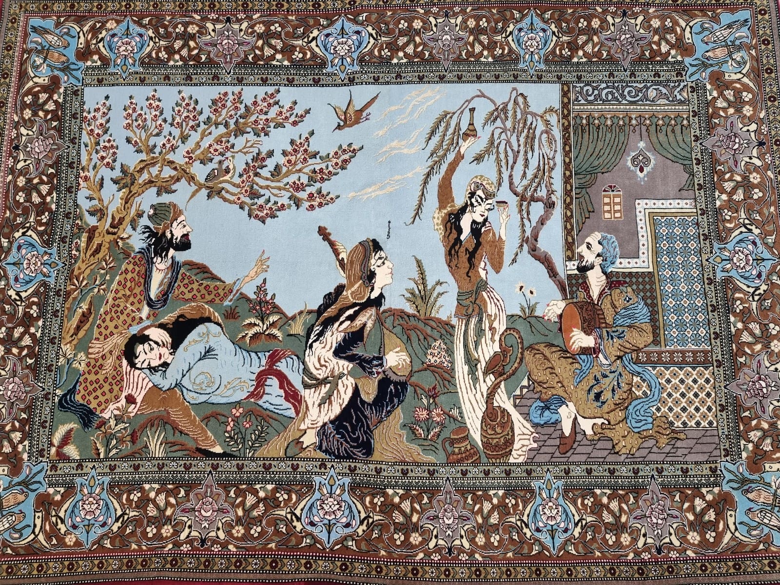 Original persischer Ghom-Teppich | Handgeknüpft aus Schurwolle auf Baumwolle | Knotendichte: Hoch | Größe: 205×146 cm | Zustand: Sehr gut, als Wandteppich genutzt | Muster: Orientalisch | Herkunft: Persien | Herstellungszeitraum: 1920-1949 | Pflege: Professionelle Reinigung empfohlen