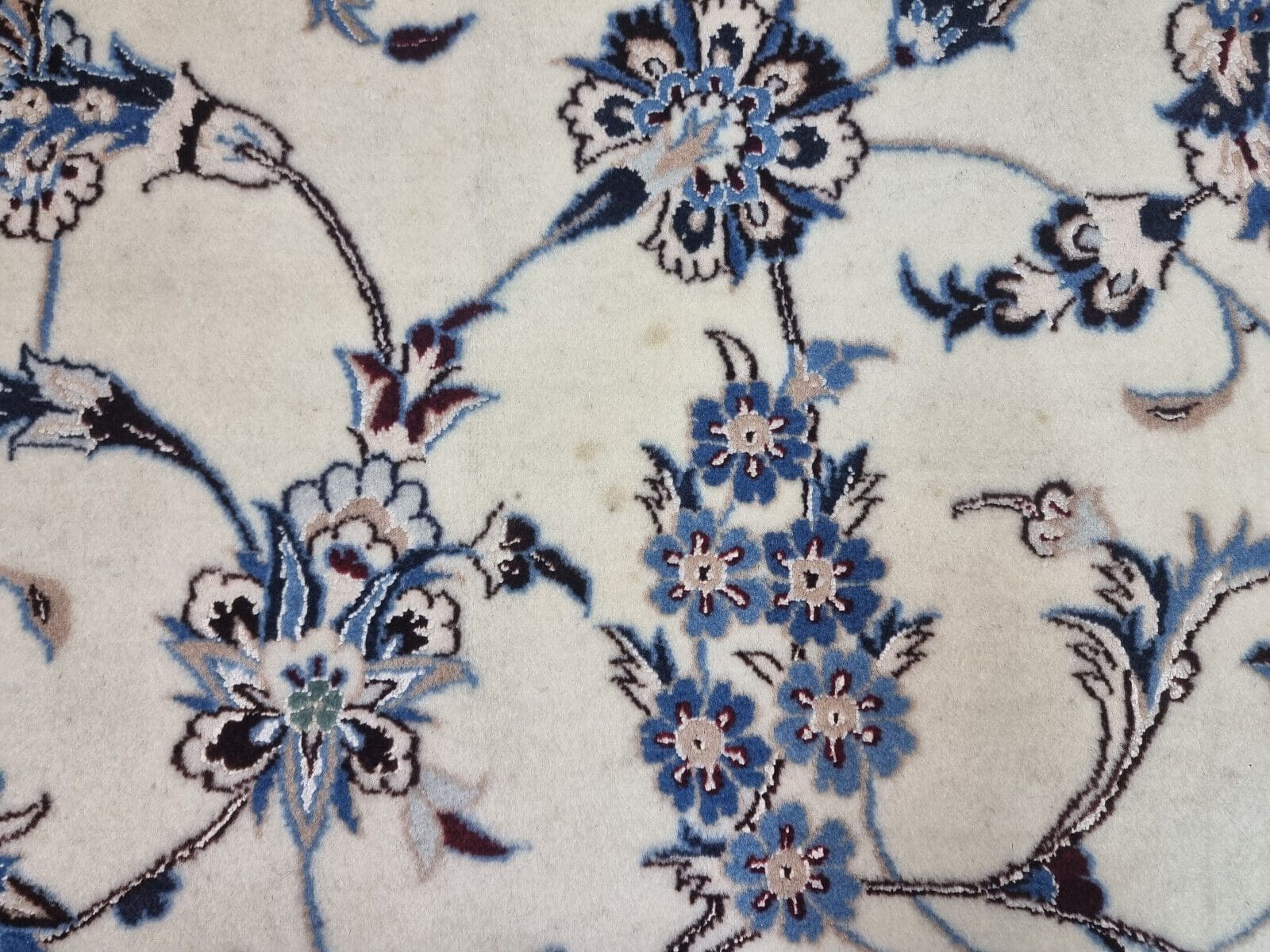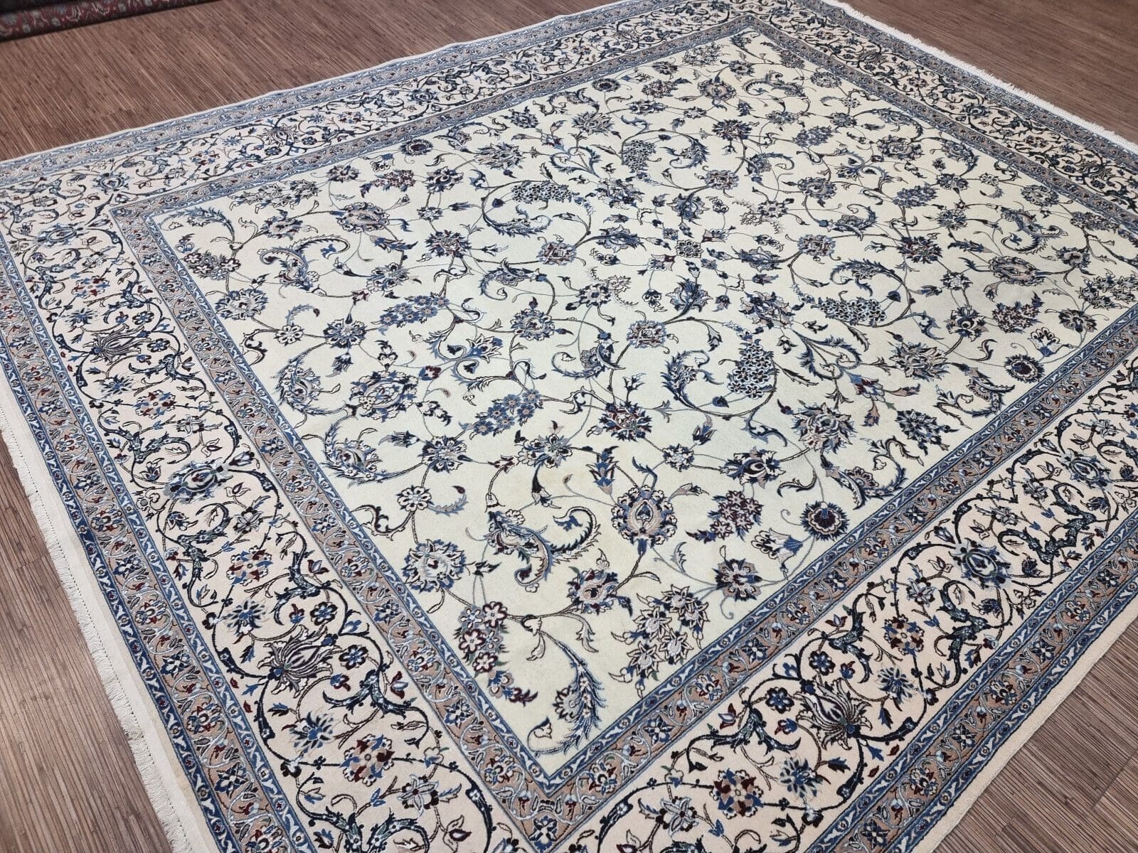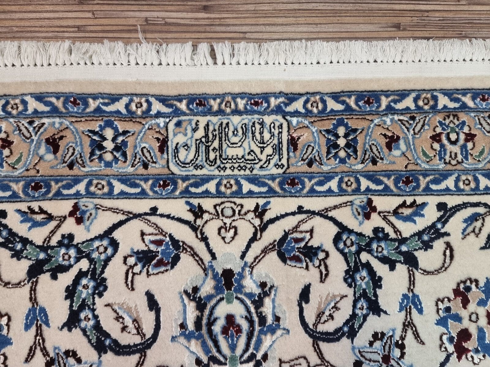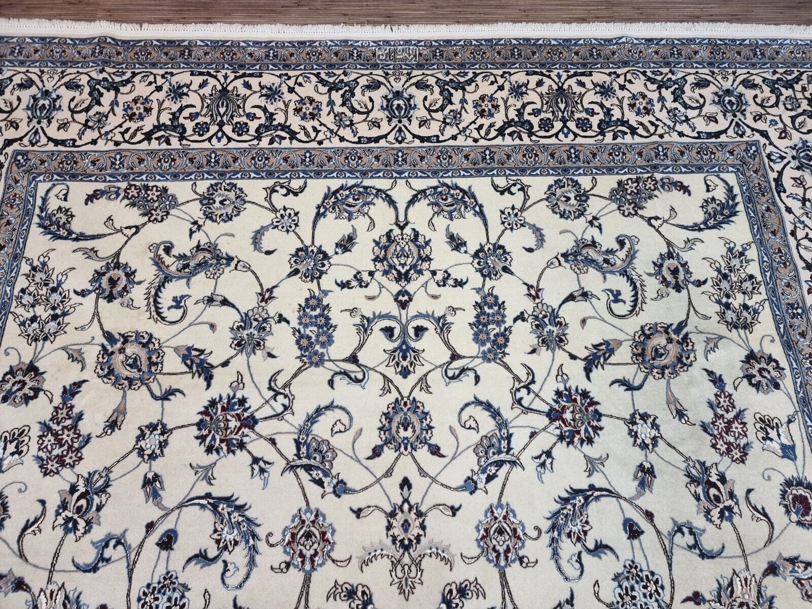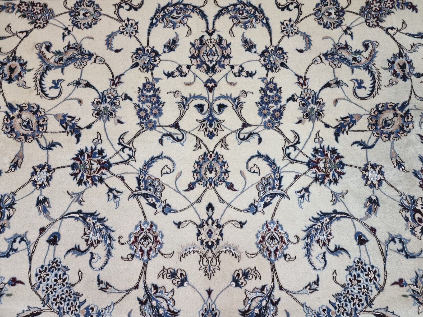 Original Persischer Nain 6 La Teppich | Knotendichte: ca. 800.000 Knoten/m² | Material: Korkwolle mit Seide auf Baumwolle | Größe: 308×252 cm | Zustand: Sehr gut, frisch professionell gewaschen | Muster: Orientalisch | Herkunft: Persien | Handgeknüpft, handgefertigt | Farbe: Beige | Herstellungszeitraum: 1980-1989