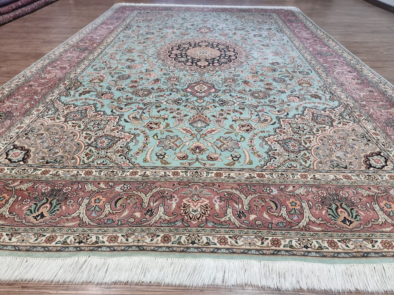 Der Teppich kommt aus Tabriz, einer der bedeutendsten Teppichregionen im Iran. Die Stadt ist bekannt für ihre erstklassigen Teppichherstellungen, die auf eine jahrhundertealte Tradition zurückblicken. Tabriz zählt zu den ältesten Städten des Iran und war schon immer ein wichtiger Handelsplatz, was sich in der Vielfalt der dort hergestellten Teppichdesigns und -techniken widerspiegelt. Die Teppiche aus Tabriz stehen oft für exquisite Kunstwerke, wobei die Kombination von traditioneller Handwerkskunst und innovativem Design eine zentrale Rolle spielt.