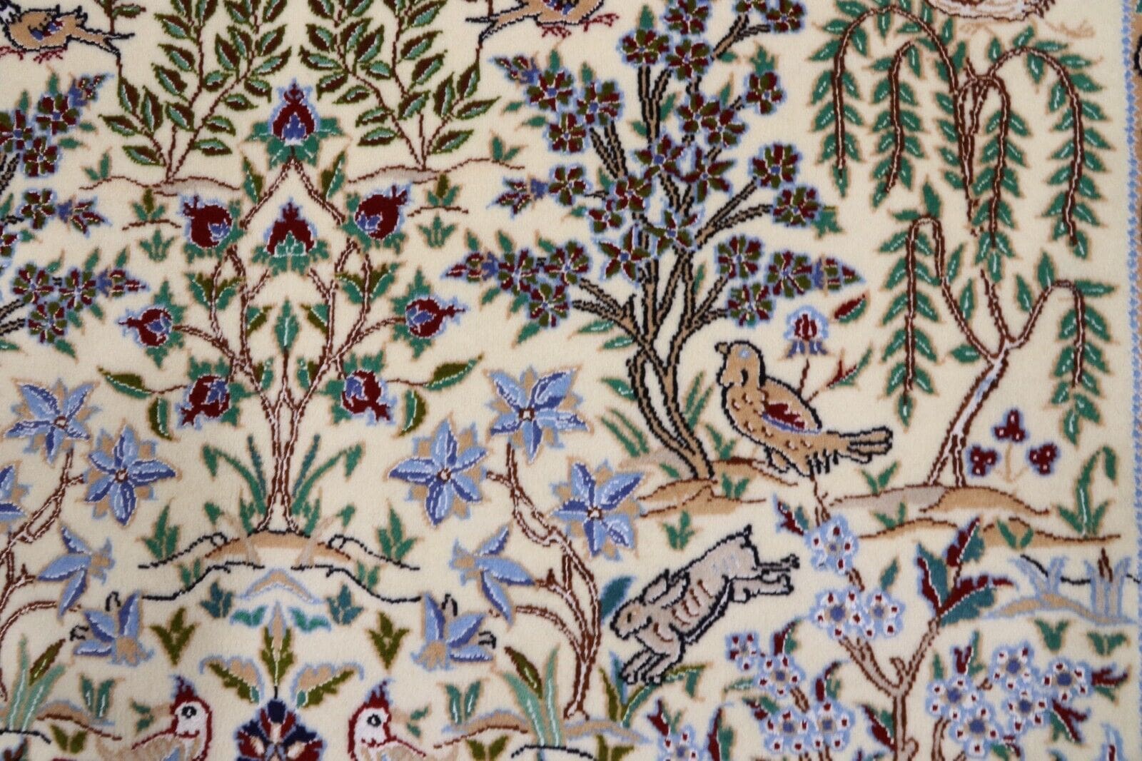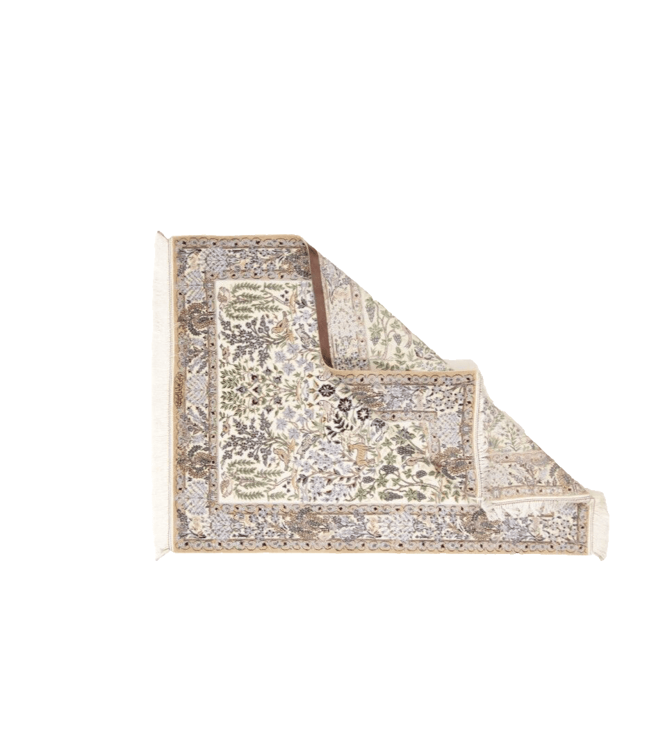 Die Materialien des Nain 6 La sind von höchster Güte. Der Flor besteht zu 80 % aus Korkwolle und zu 20 % aus edler Naturseide, was dem Teppich eine unvergleichliche Weichheit und Haltbarkeit verleiht. Die Kette ist aus 100 % Baumwolle gefertigt, was zusätzlich zur Stabilität und Langlebigkeit des Teppichs beiträgt. Mit einem Knoten pro Quadratmeter von ca. 1.000.000 ist dieser Teppich extrem dicht und sorgt für eine detailreiche Darstellung der kunstvollen Muster und Designs.