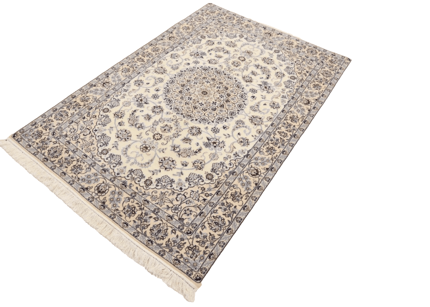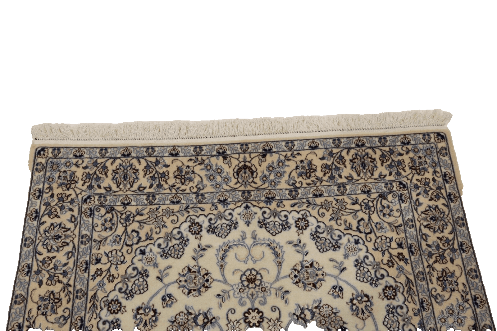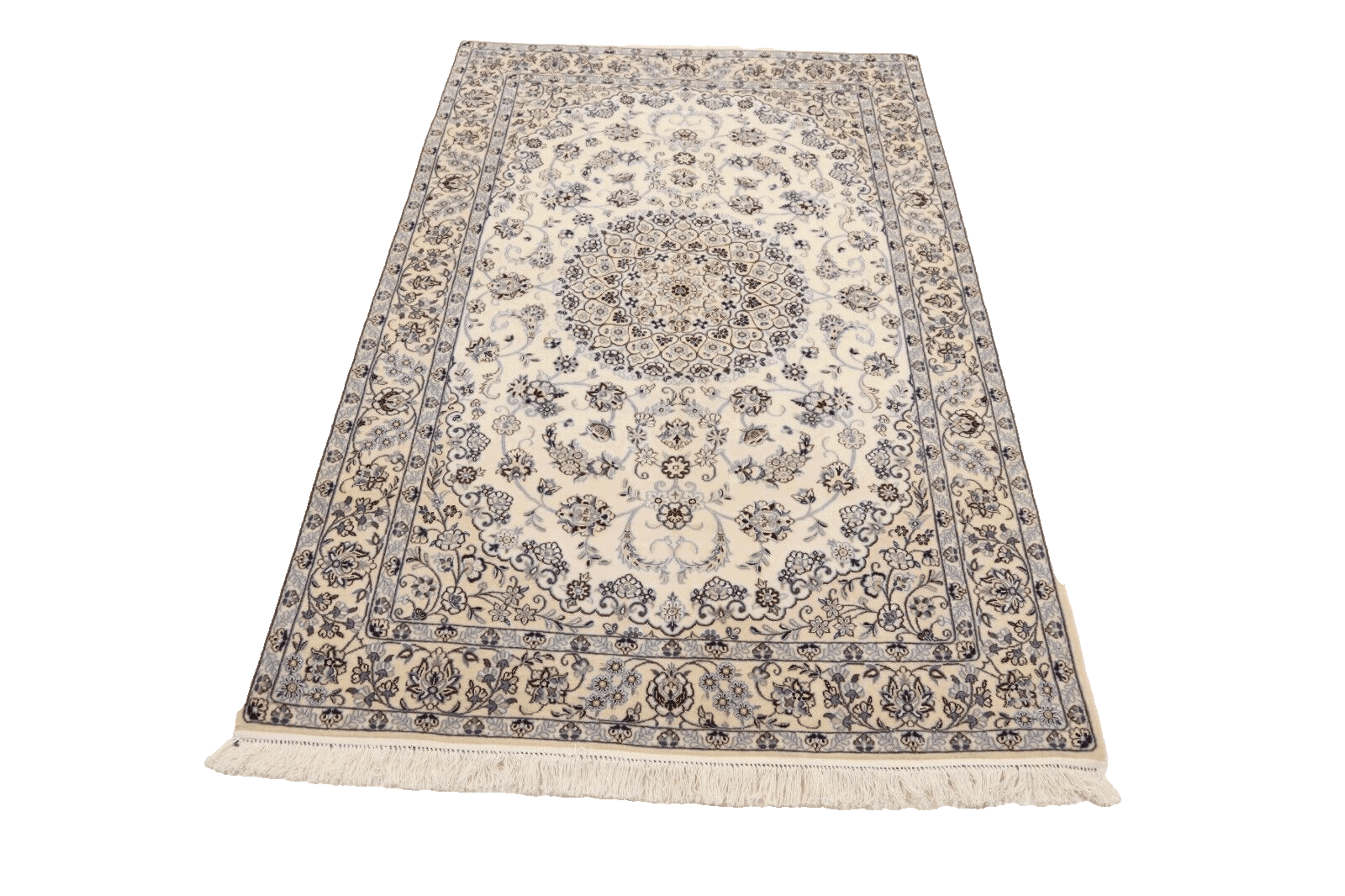 Handgeknüpfter Orientteppich Nain 6 La | Größe: 172 x 117 cm | Material: 80 % Korkwolle, 20 % Naturseide | Knotendichte: ca. 1.000.000 Knoten/m² | Zustand: Neu, perfekt | Herkunft: Persien | Stil: Traditionell Orientalisch/Persisch | Dicke: ca. 6 mm | Gewicht: 5 kg | Farbe: Weiß | Ideal für alle Zimmer