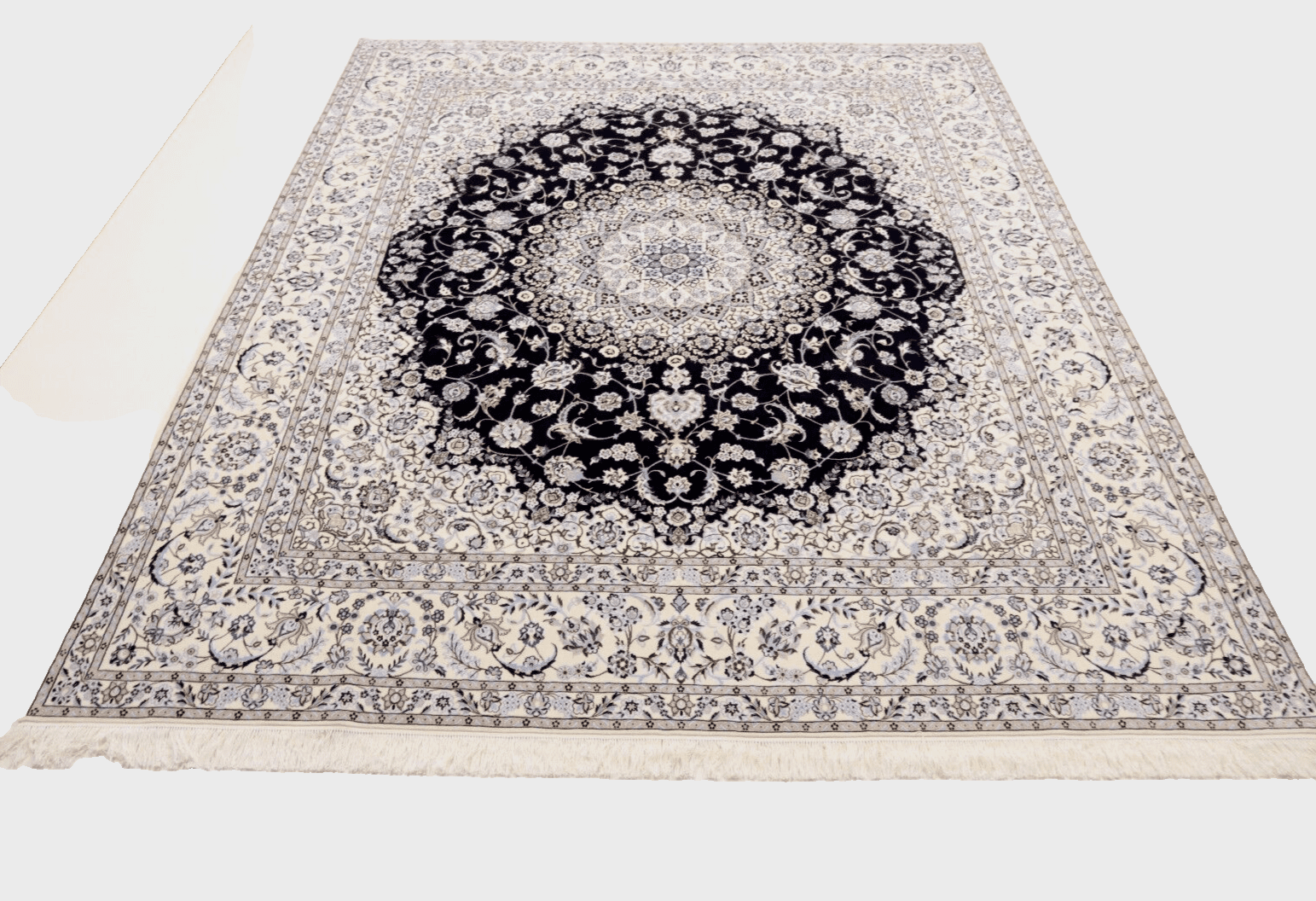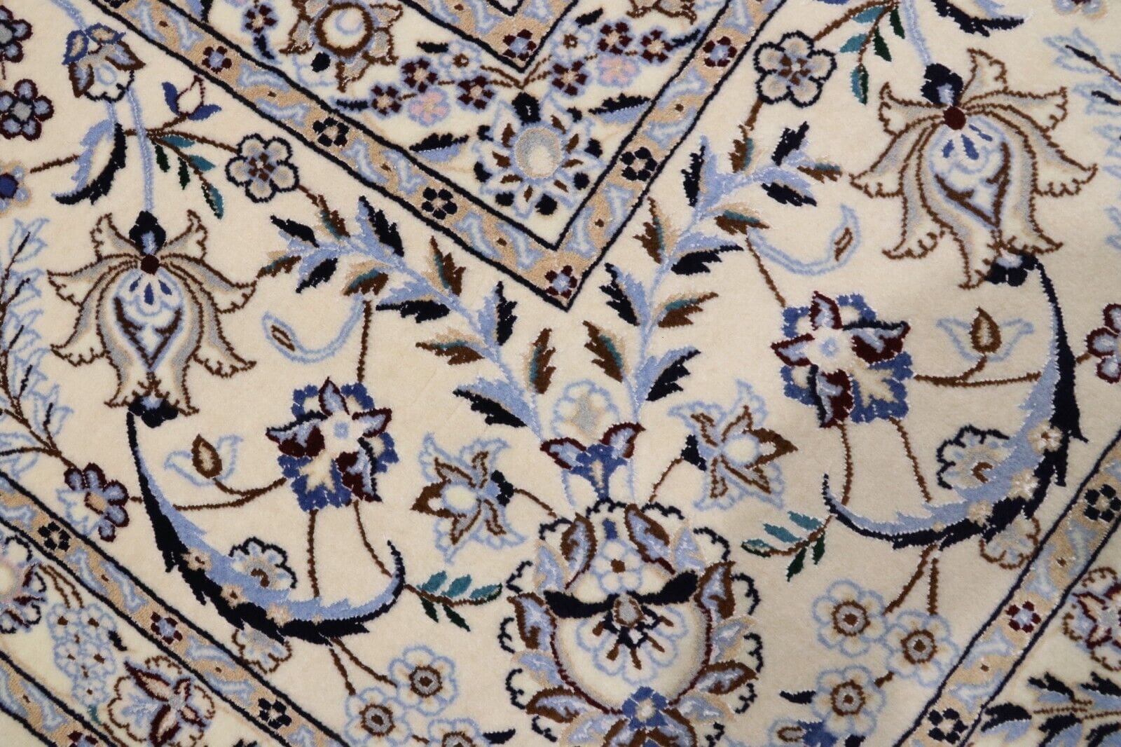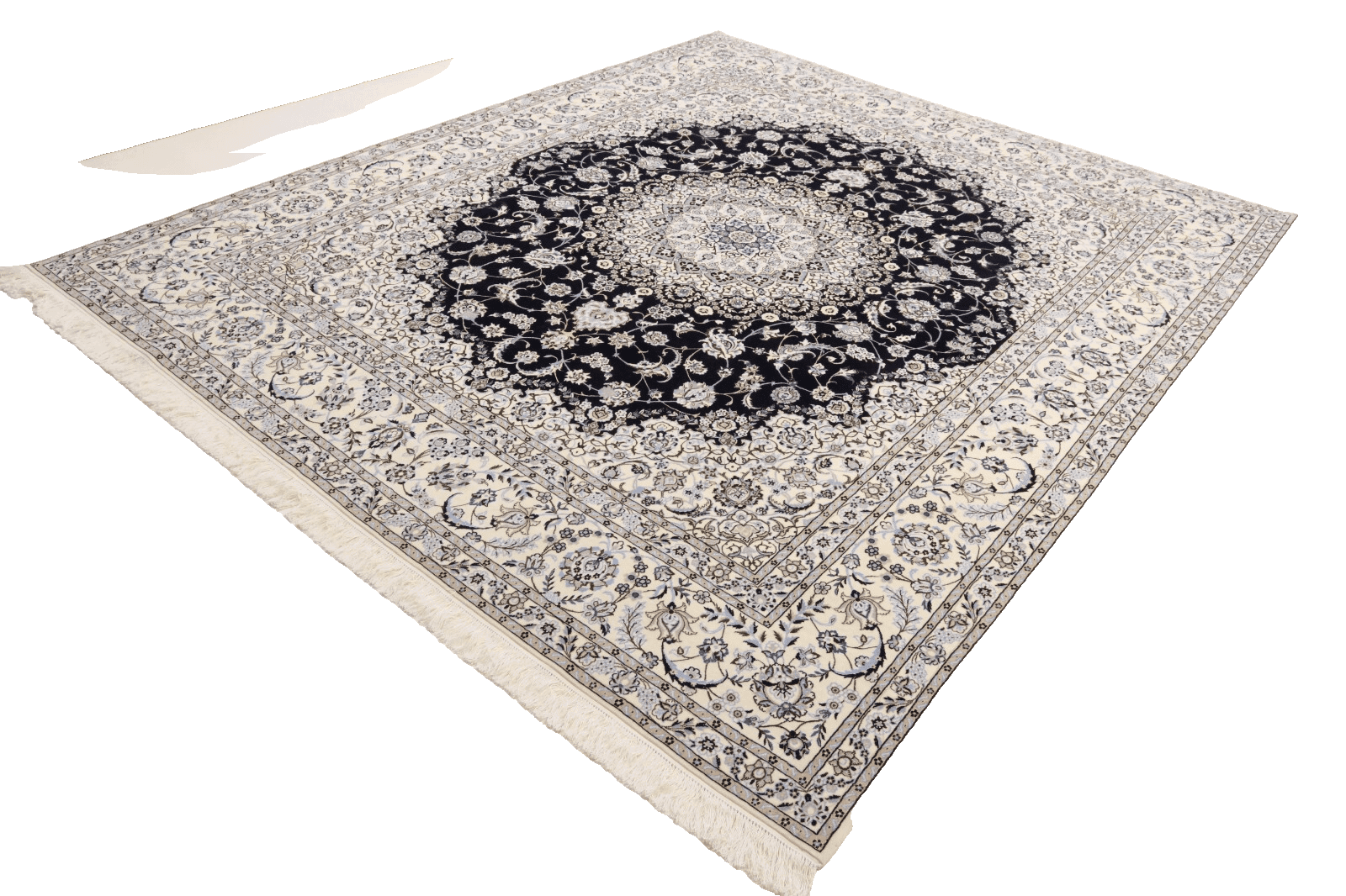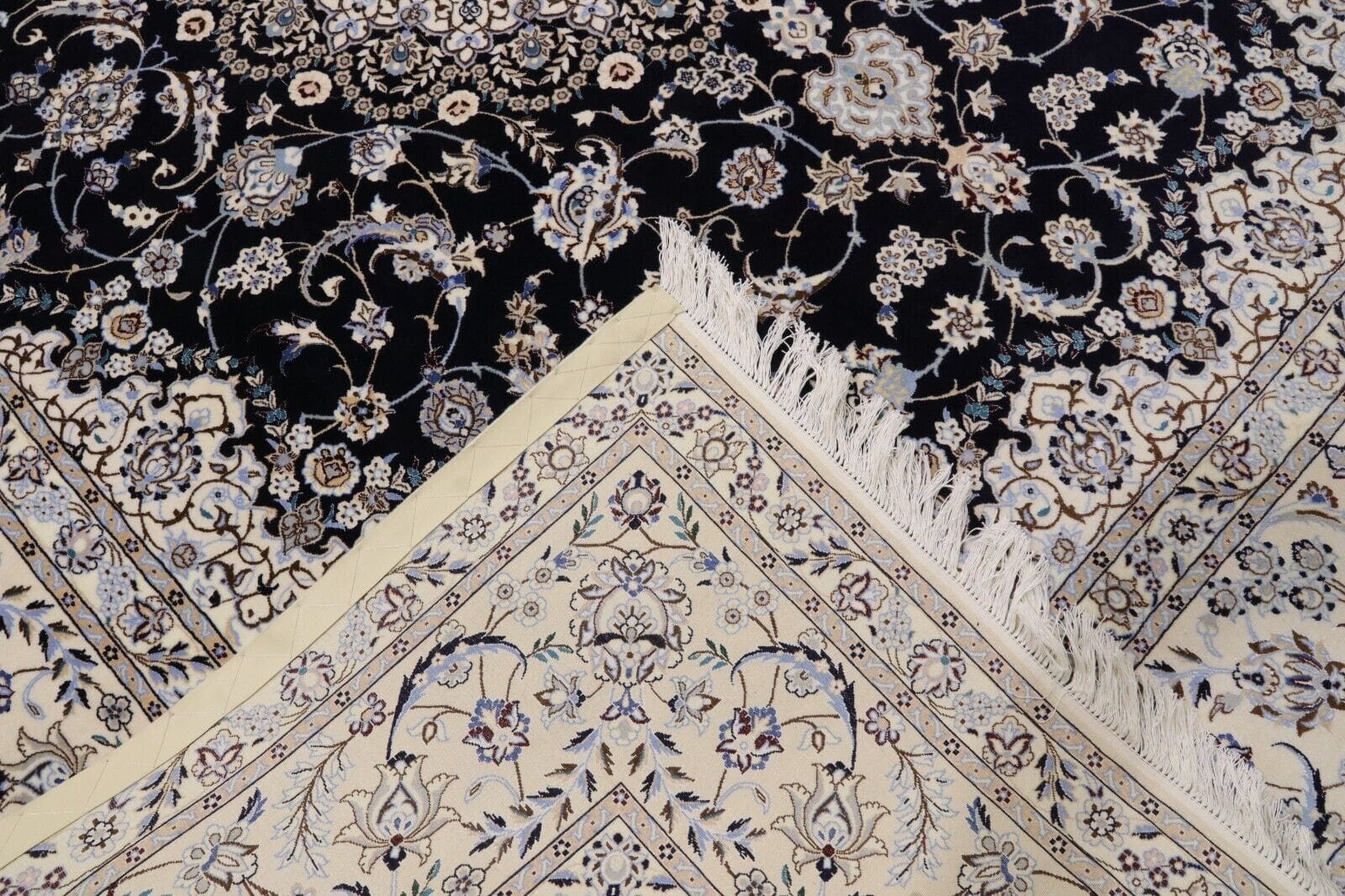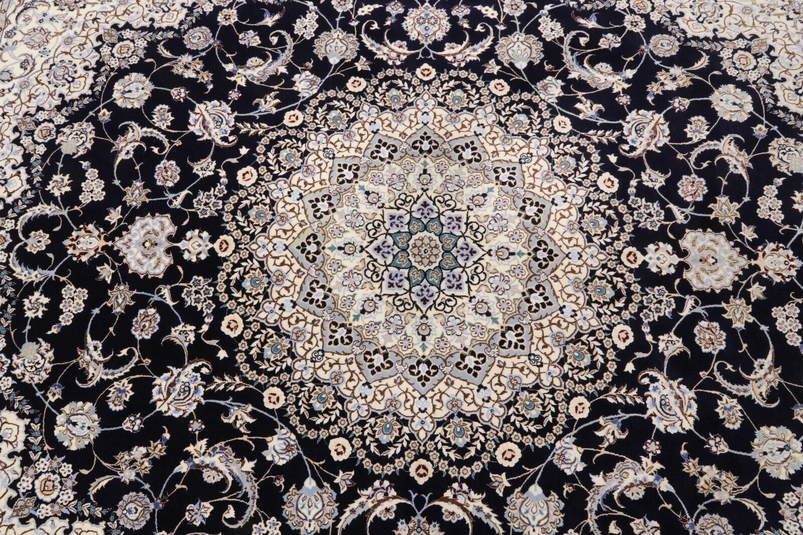 Wunderschöner Orientteppich Nain 6 La | Knotendichte: 850.000 – 1.000.000 Knoten/m² | Material: 80 % Korkwolle, 20 % Naturseide | Größe: 312 x 259 cm | Zustand: Neu, sehr gut | Herkunft: Persien | Handgeknüpft | Farbe: Dunkelblau | Für Fußbodenheizung geeignet | Haustierfreundlich | Stil: Traditionell Orientalisch/Persisch