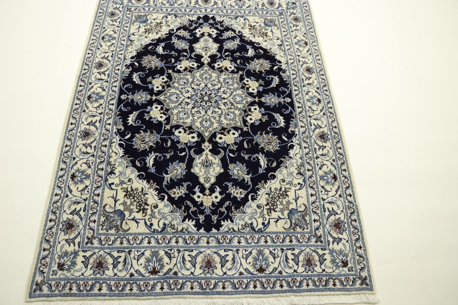 Orientteppich Super Nain | Größe: 200 x 149 cm | Knotendichte: ca. 300.000 Knoten/m² | Material: 90% Schurwolle, 10% Seide | Kette: 100% Baumwolle | Zustand: Neu, unbenutzt | Herkunft: Persien | Florhöhe: ca. 8 mm | Stil: Traditionell Orientalisch/Persisch | Rechteckige Form | Farben: Weiß / Dunkelblau | Handgeknüpft, Unikat