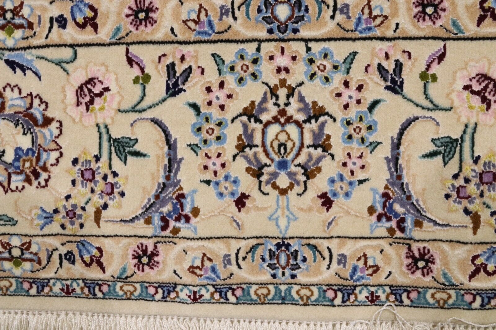 Das Design dieses Teppichs ist ein traumhaftes Zusammenspiel aus floralen und geometrischen Elementen, die typisch für die Nain-Kunst sind. Häufige Motive in Nain-Teppichen sind arabeske Muster, die an die natürliche Vegetation erinnern, sowie stilisierte Blumen- und Blätterdesigns. Diese kunstvolle Musterung verleiht dem Teppich eine zeitlose Eleganz und fügt sich wunderbar in verschiedene Einrichtungsstile ein – von klassisch bis modern.
