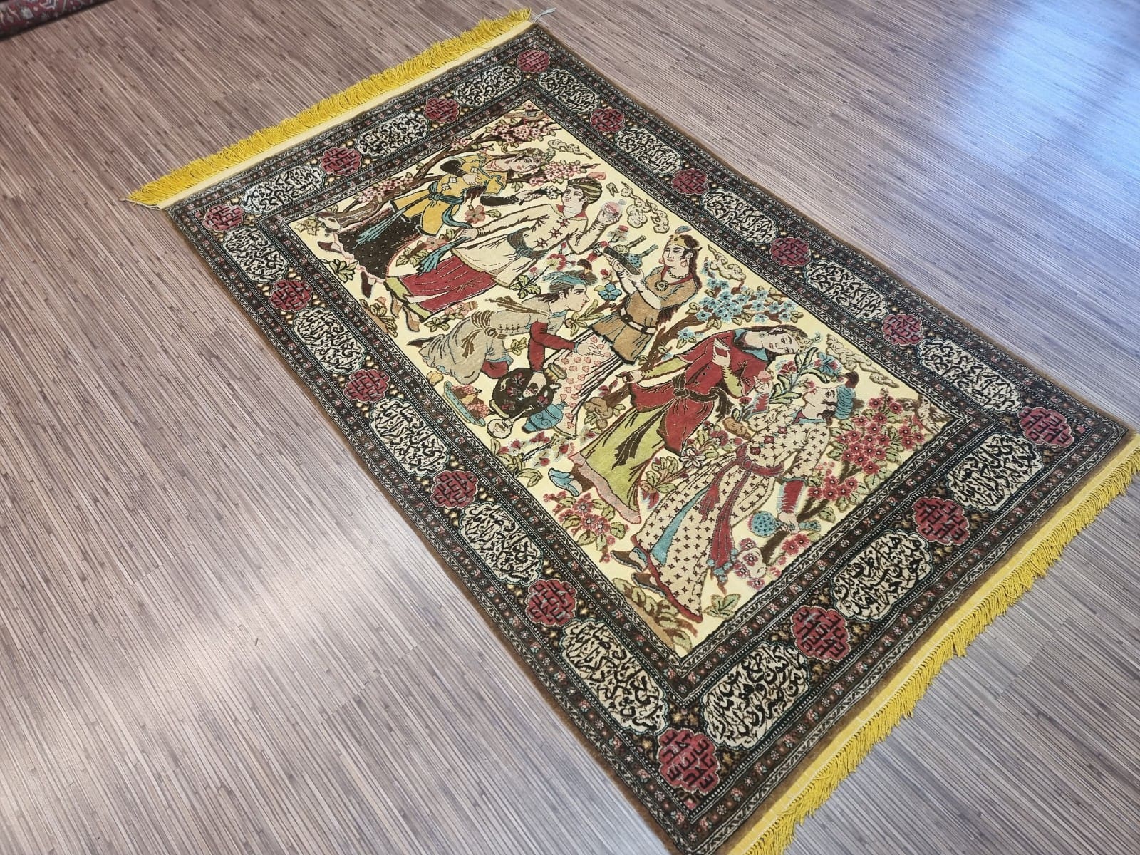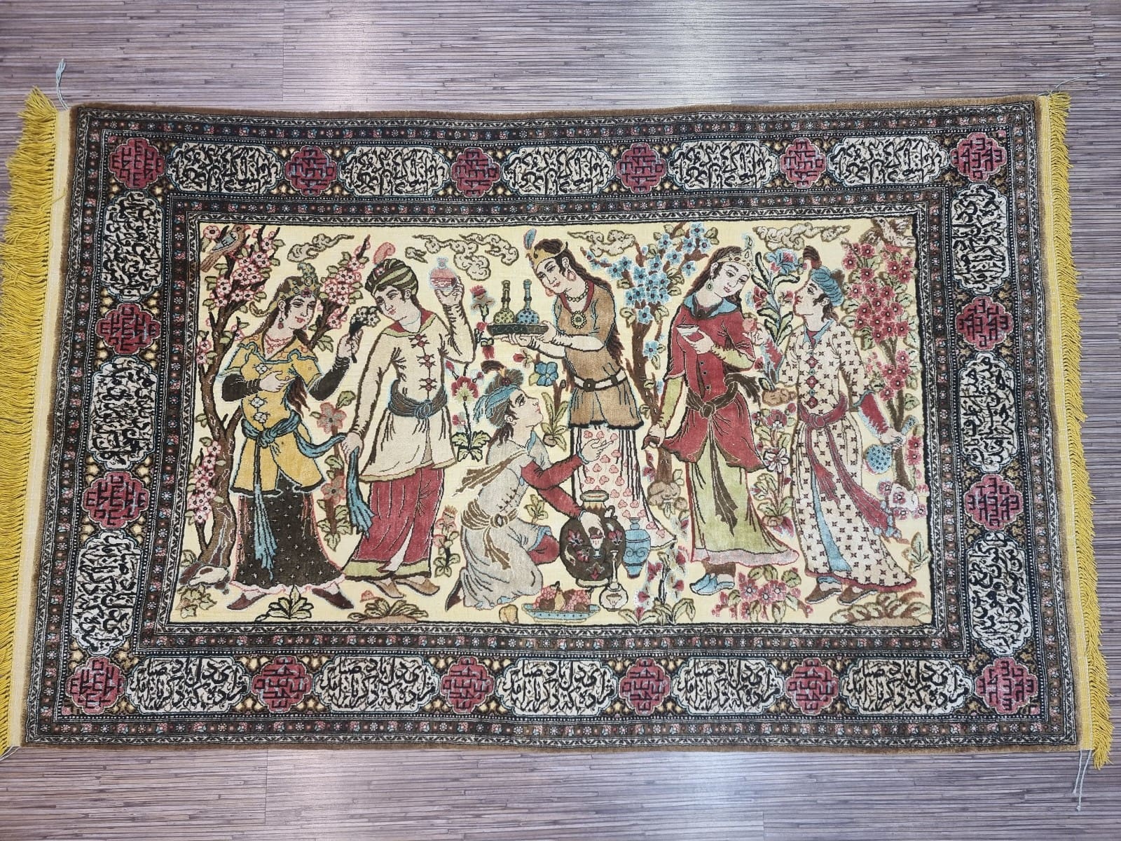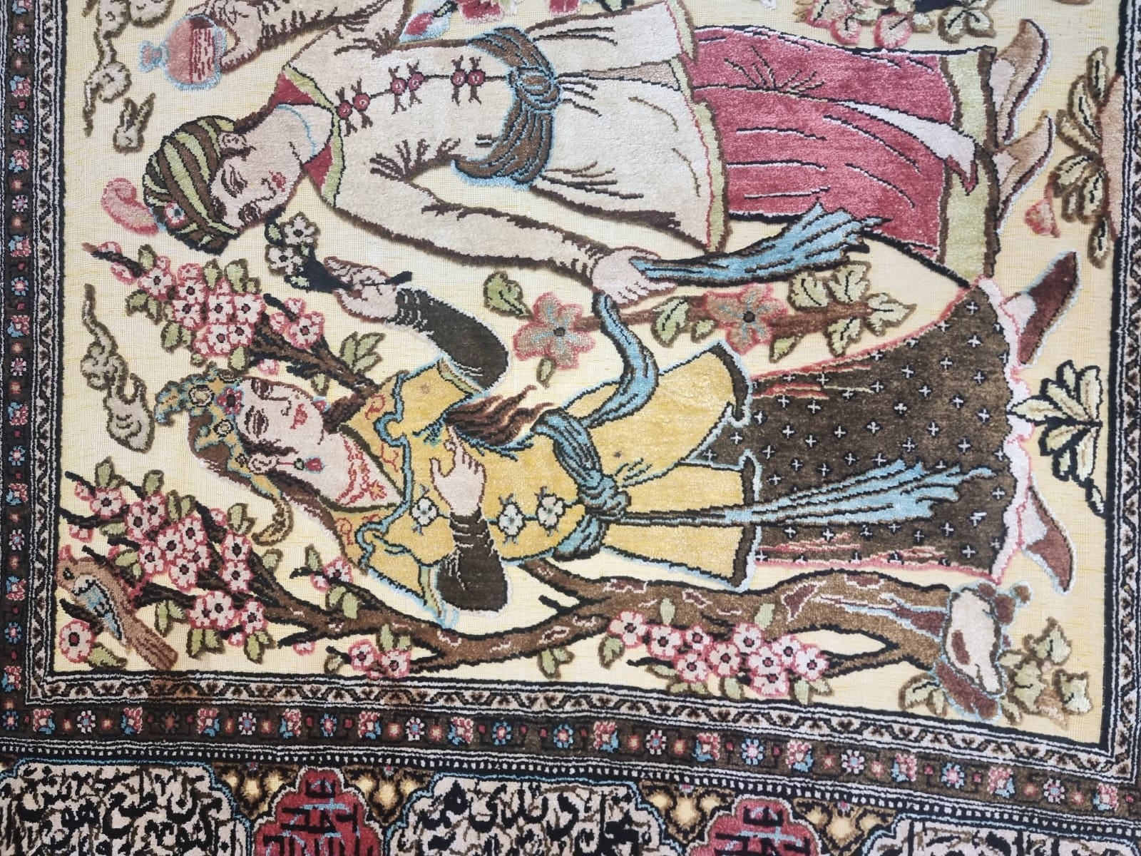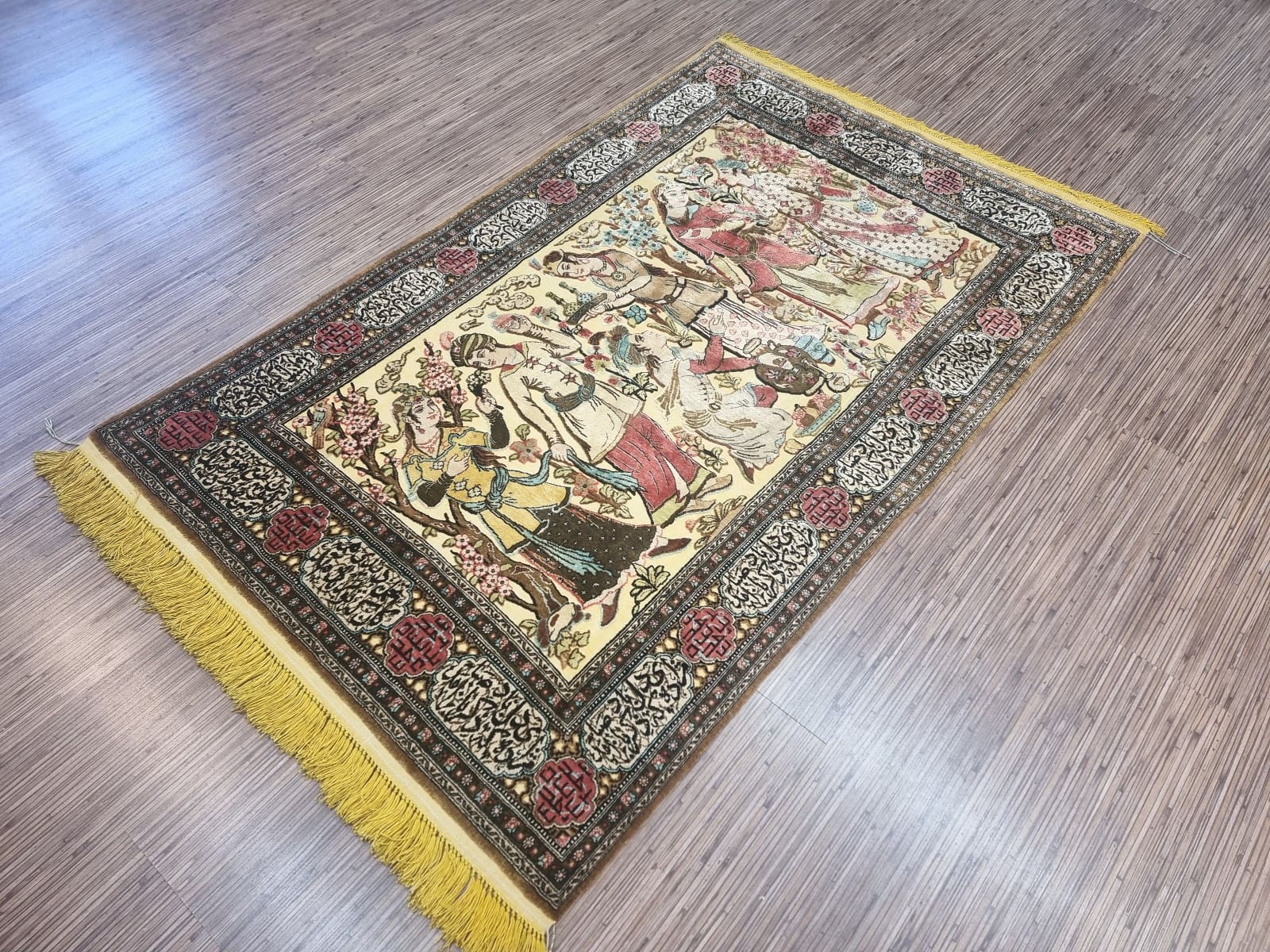 Original persischer Ghom Teppich | Knotendichte: ca. 600.000 Knoten/m² | Material: 100% Seide | Größe: 168×106 cm | Zustand: Neuwertig, nur als Wandteppich genutzt | Herkunft: Persien | Handgeknüpft und signiert | Stil: Orientalisch | Farbe: Siehe Bilder