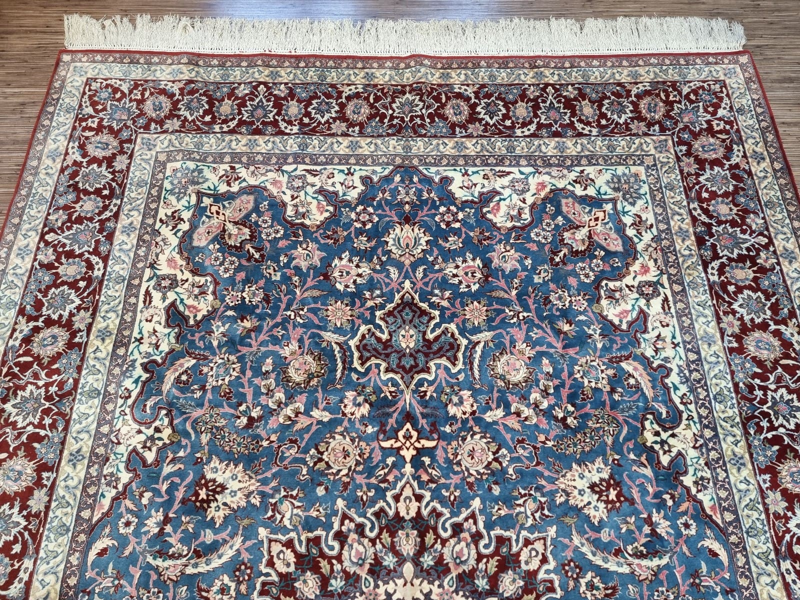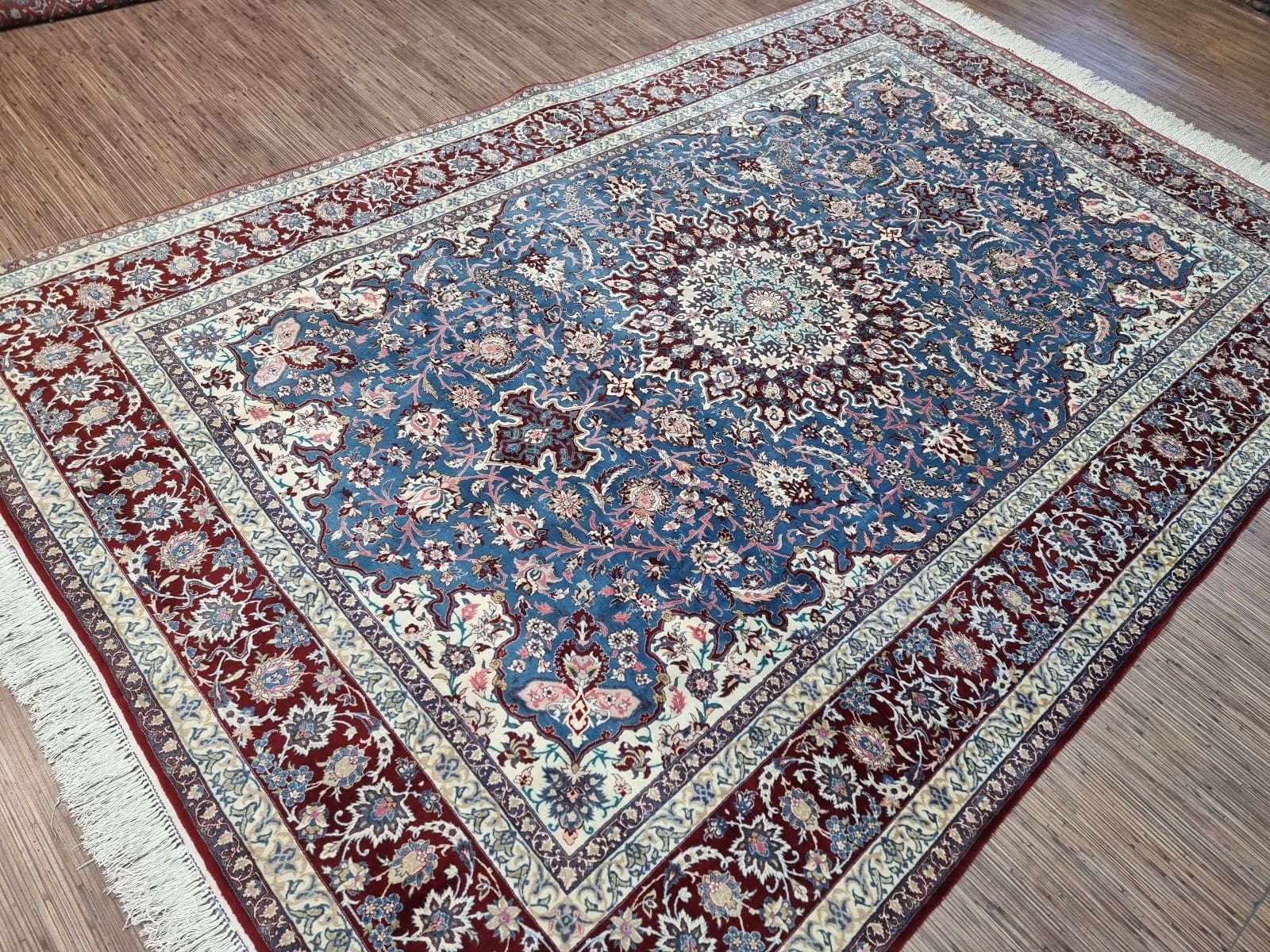 Isfahan ist eine der bekanntesten Teppichregionen im Iran und hat eine lange Tradition der Teppichwebkunst, die bis ins 16. Jahrhundert zurückreicht. Während der Safawiden-Dynastie erlebte die Stadt eine Blütezeit, in der die Teppichherstellung einen unvergleichlichen Höhepunkt erreichte. Isfahan-Teppiche zeichnen sich durch ihre reiche Farbpalette und eleganten Muster aus, die oft florale Motive, geometrische Formen und komplexe Designs enthalten, die symbolische Bedeutungen tragen.