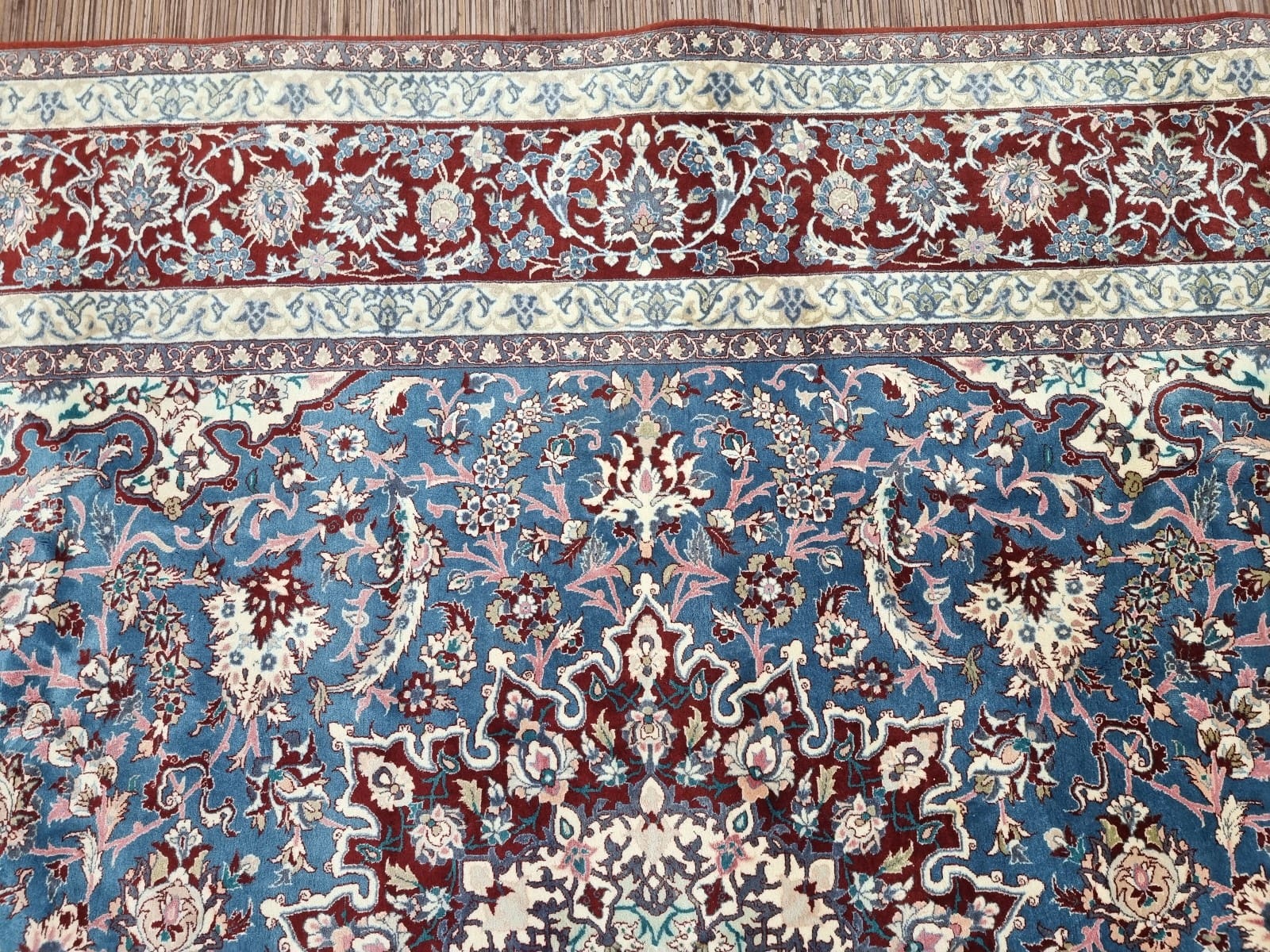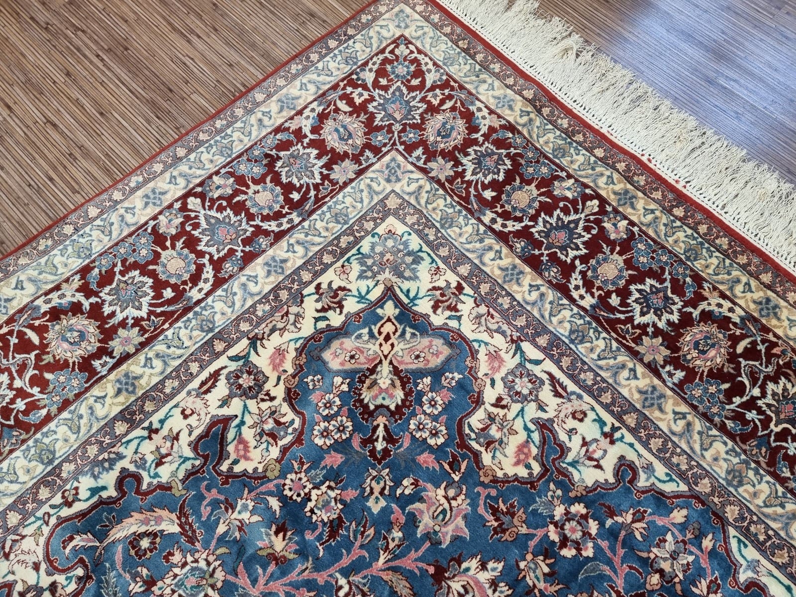 Der Boden des Teppichs besteht aus luxuriösem Wolle, die nicht nur für ihre Weichheit, sondern auch für ihre Robustheit geschätzt wird. Wolle hat zudem die erstaunliche Fähigkeit, Temperatur und Feuchtigkeit zu regulieren, was den Isfahan Teppich besonders angenehm und pflegeleicht macht. Die Verwendung dieser hochwertigen Materialien sorgt dafür, dass der Teppich über viele Jahre hinweg seine lebendigen Farben und seine Form behält, selbst in stark frequentierten Räumen.