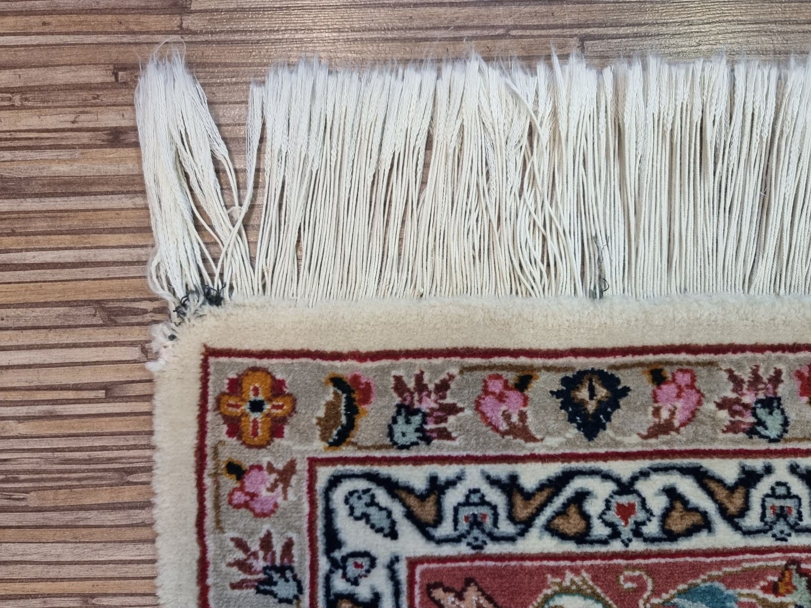 Ein weiterer großer Vorteil dieses handgeknüpften Täbriz-Teppichs ist die außergewöhnliche Pflegeleichtigkeit. Naturmaterialien sorgen dafür, dass Flecken nicht so schnell haften und der Teppich mit einfachen Mitteln gereinigt werden kann. Zudem trägt die Knotendichte dazu bei, dass der Teppich auch bei intensivem Gebrauch seine Form und Farbe behält.