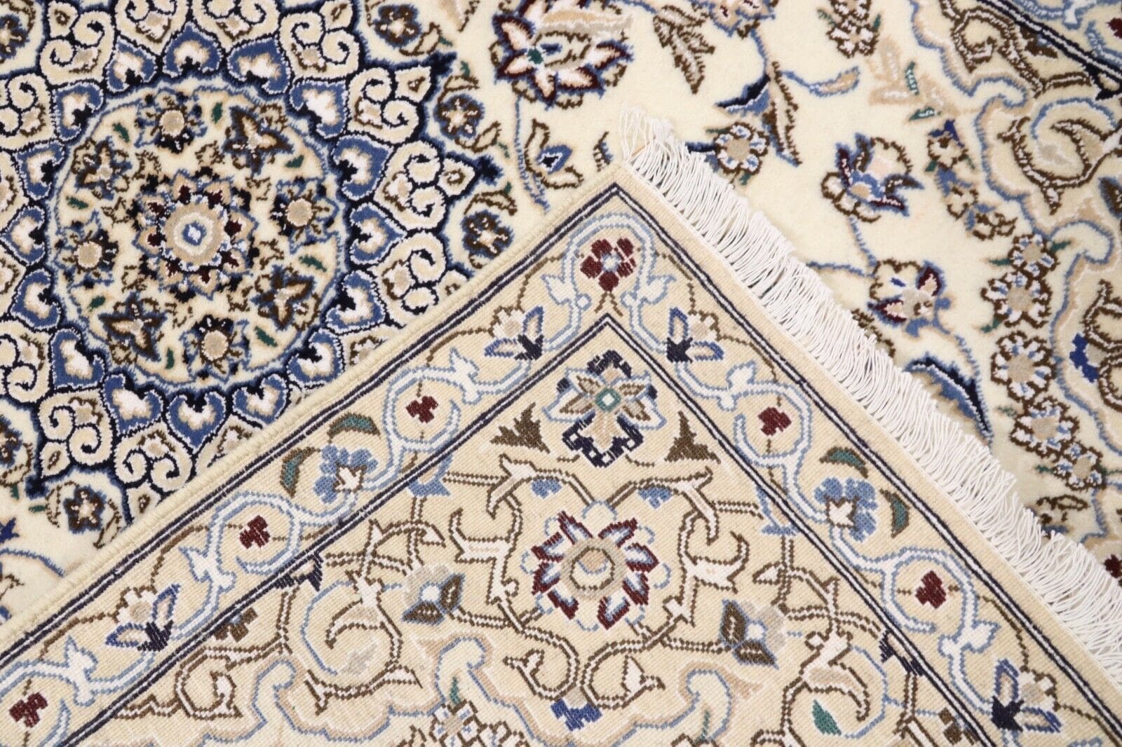 Echte Nain Teppiche sind handgeknüpft und sollten eine hohe Knotendichte aufweisen. Achten Sie auch auf die Materialien: Eine Mischung aus Schurwolle und Seide ist typisch. Oft gibt es auch Etiketten oder Zertifikate, die die Herkunft bestätigen.