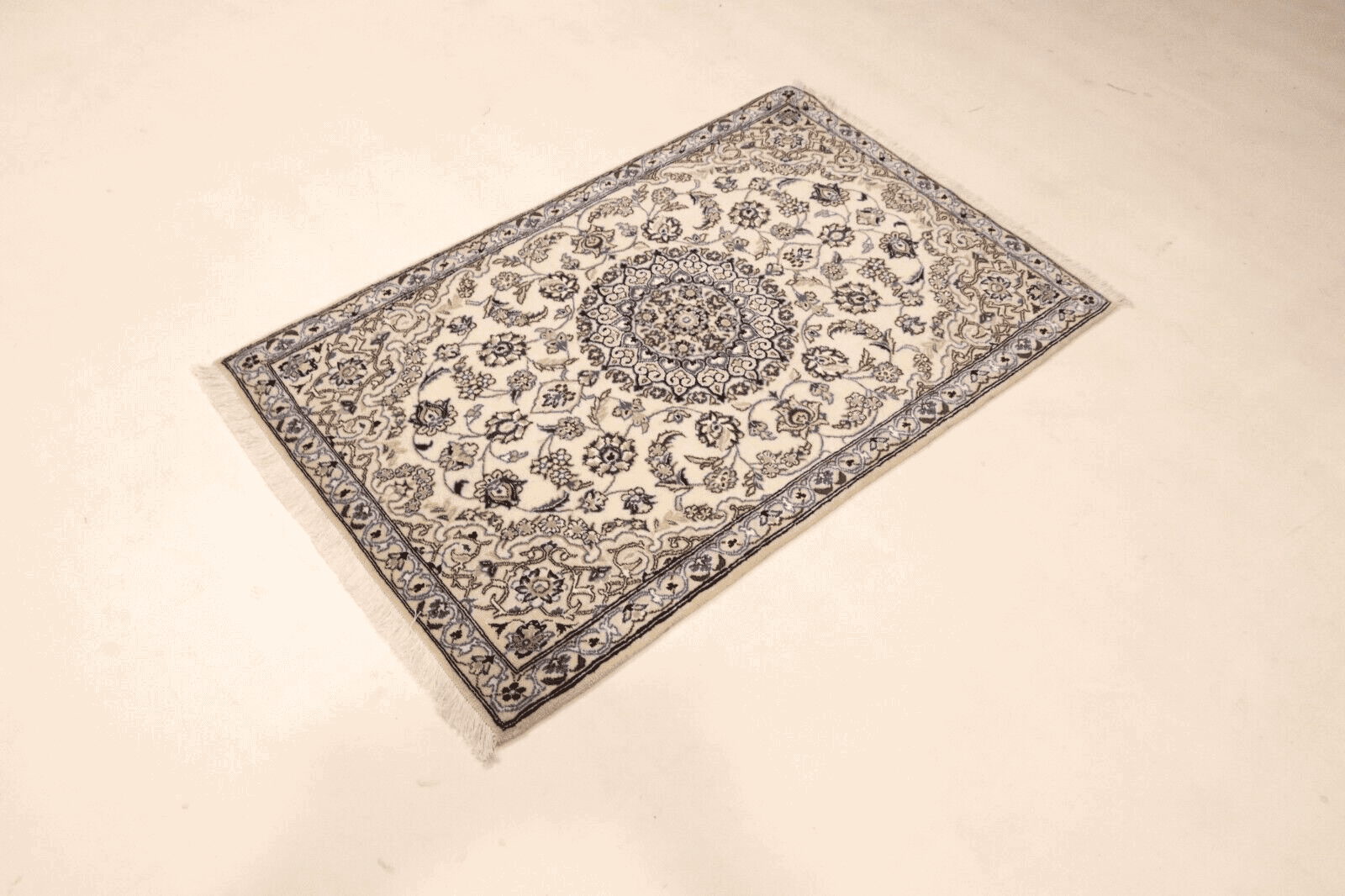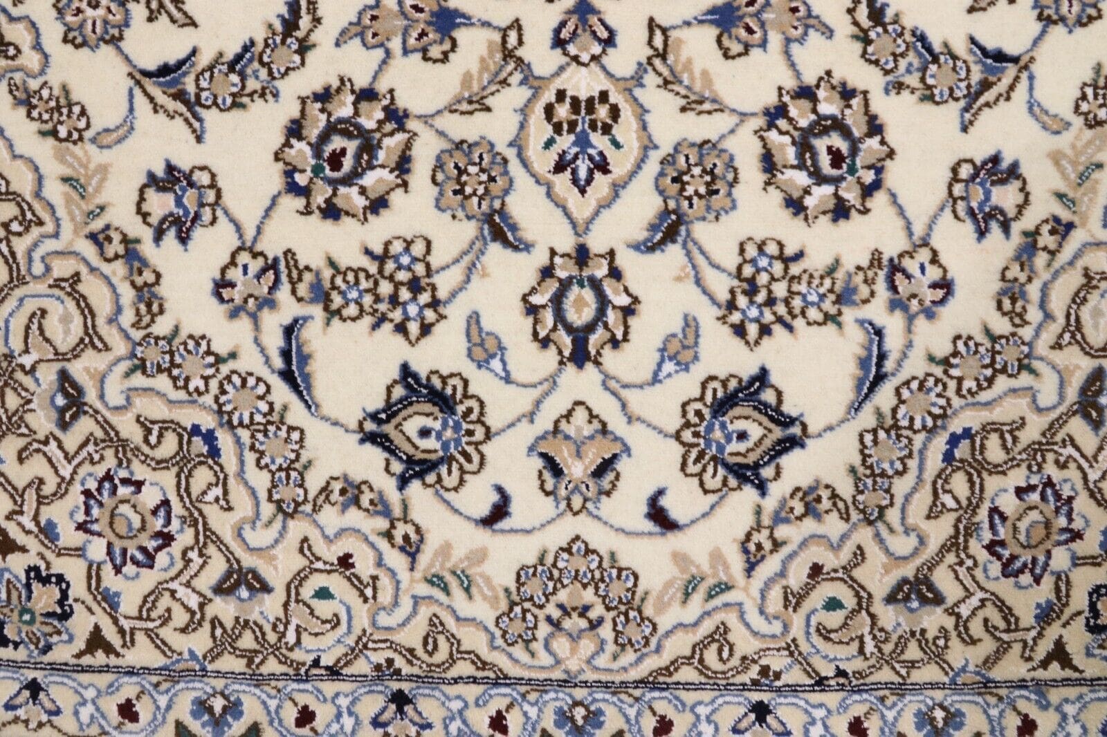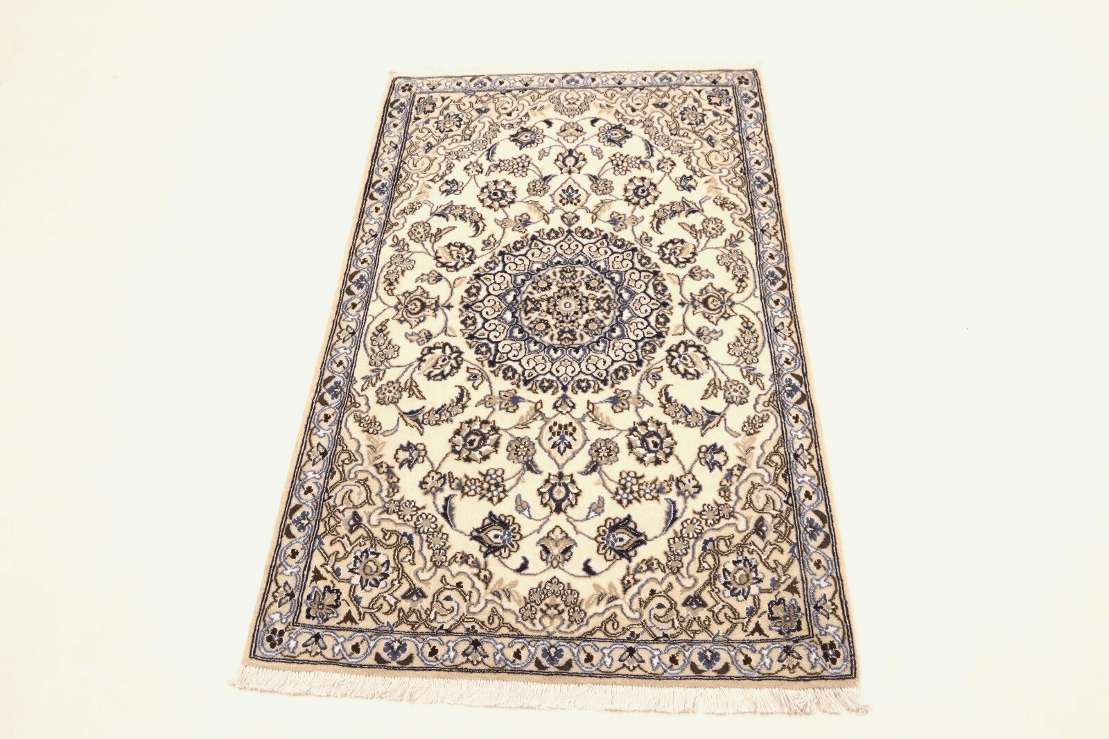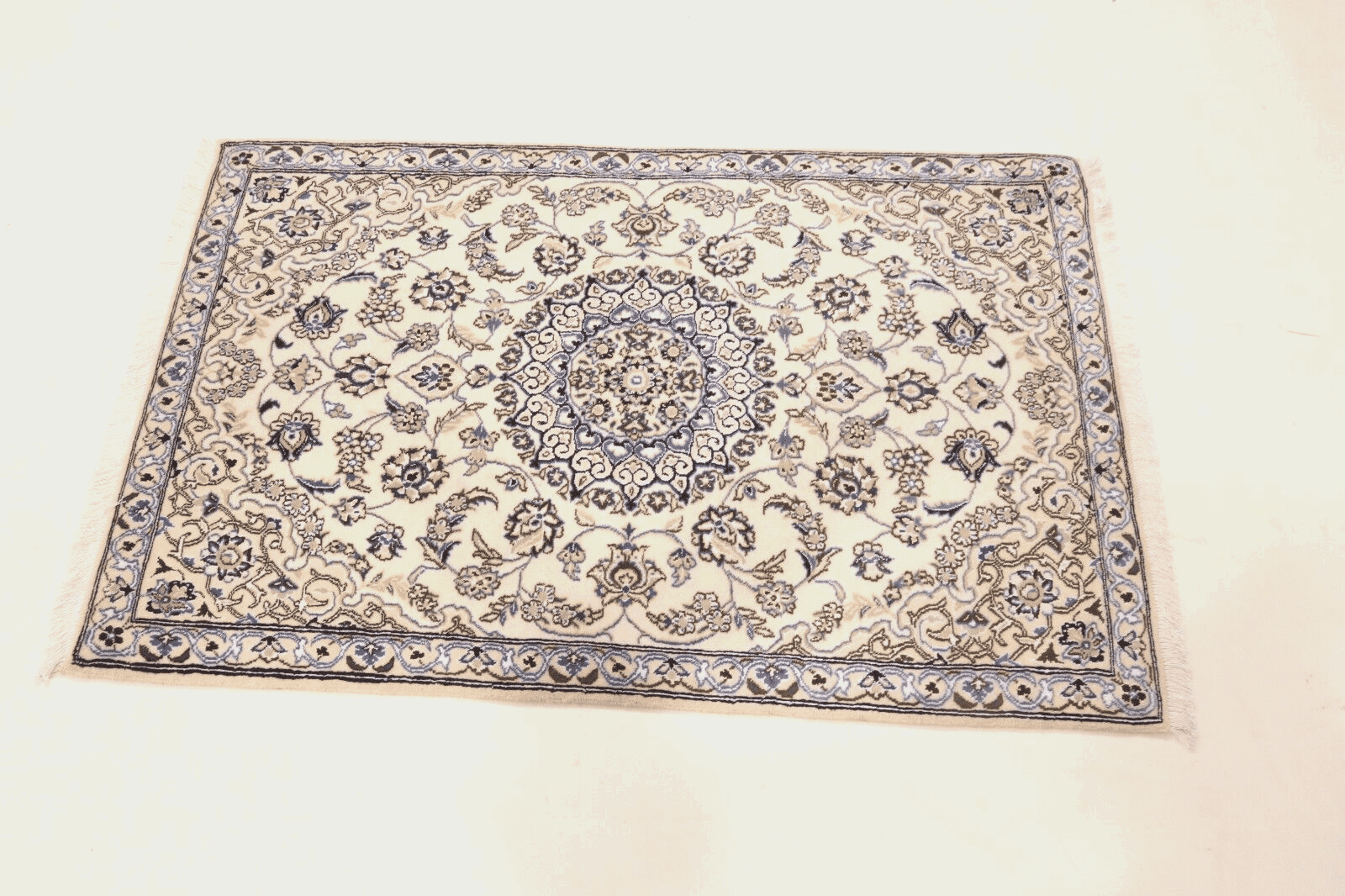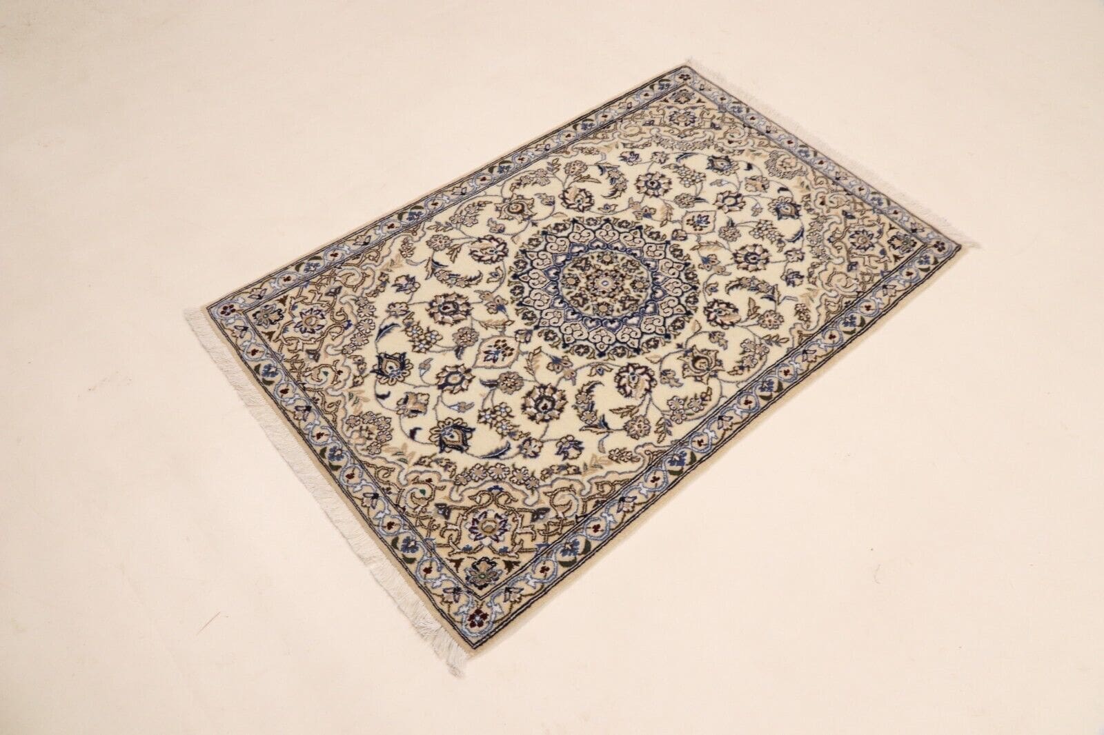Handgeknüpfter Perserteppich Super Nain 9 La | Größe: 136 x 88 cm | Knotendichte: ca. 500.000 Knoten/m² | Material: 90 % Schurwolle, 10 % Seide | Kette: 100 % Baumwolle | Zustand: Neu, sehr gut | Stil: Traditionell Orientalisch/Persisch | Herkunft: Persien/Iran | Besonderheiten: Für Fußbodenheizung geeignet, haustierfreundlich | Florhöhe: 8 mm
