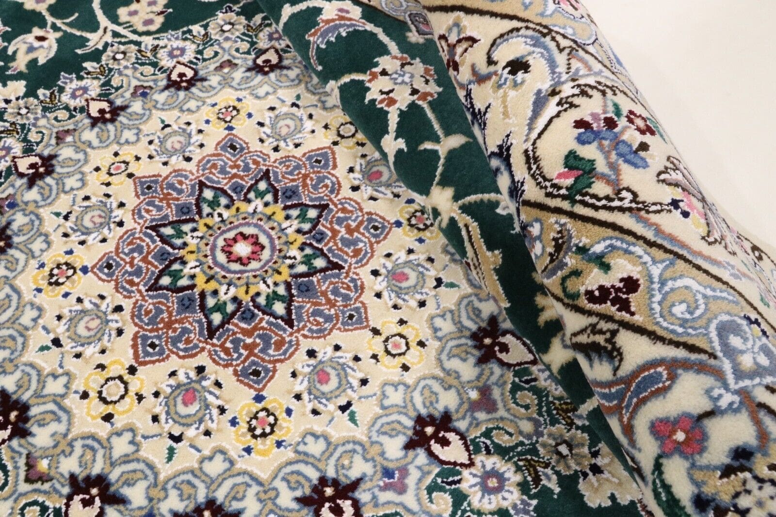 Die beeindruckende Knotendichte von 500.000 Knoten macht diesen Teppich besonders strapazierfähig und verleiht ihm ein luxuriöses Aussehen. Je höher die Knotendichte, desto detaillierter und feiner sind die Muster, was zu einer hervorragenden Qualität führt. Dadurch ist der Teppich nicht nur ein Kunstwerk, sondern auch eine lohnenswerte Investition, die über Jahrzehnte hinweg Freude bereiten wird. Zudem ist jeder handgeknüpfte Nain-Teppich ein Unikat und trägt die Handschrift des Knüpfers, der viel Zeit und Geduld aufwenden muss, um ein solches Meisterwerk zu schaffen. In jedem Knoten steckt die Leidenschaft und die Kunstfertigkeit, die diese Teppiche zu einem besonderen Erlebnis machen.