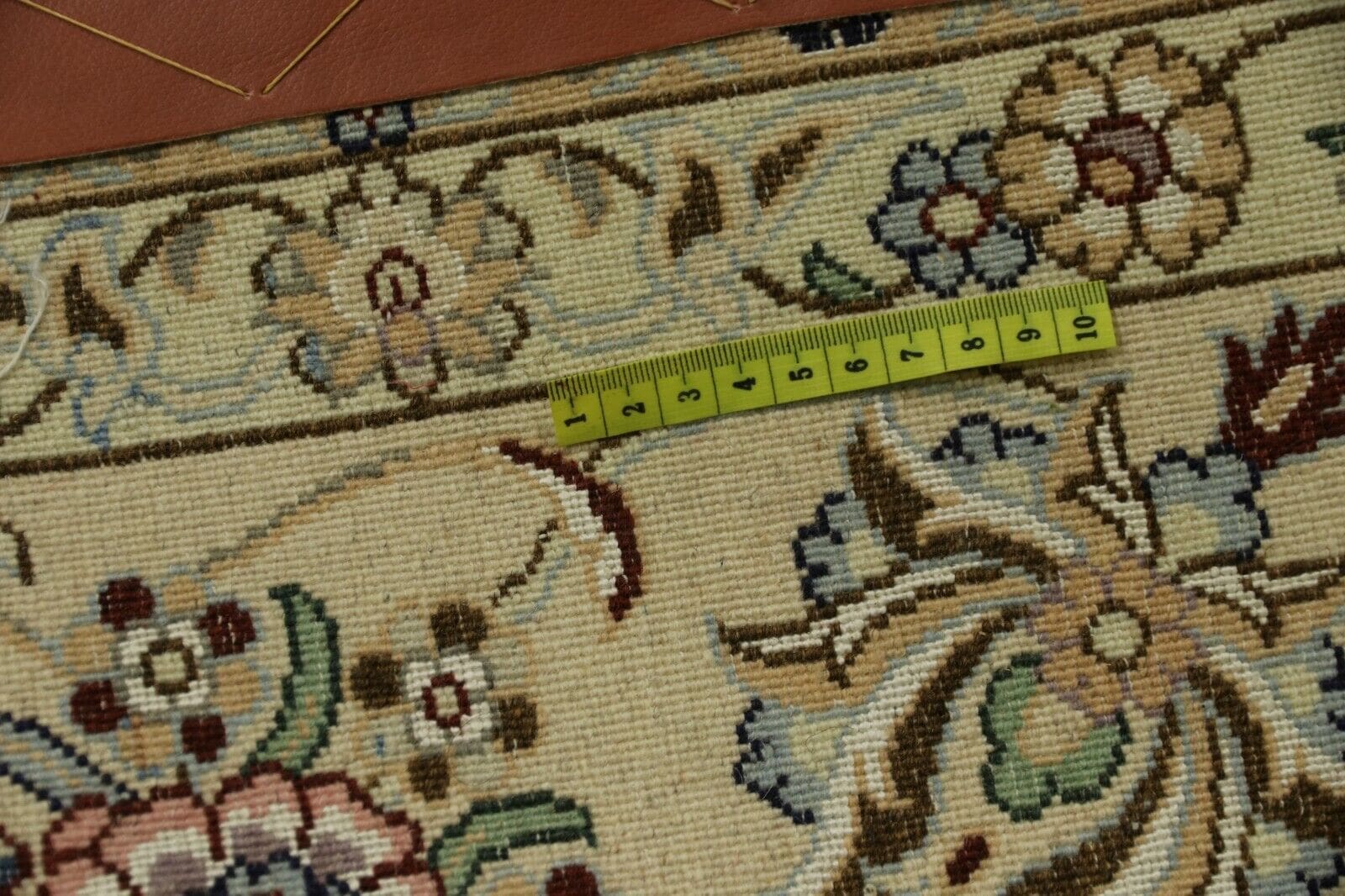 Zu den besonderen Eigenschaften des Super Nain 9 la gehören seine hervorragende Knotendichte und die verwendeten Materialien. Eine Knotendichte von ca. 500.000 Knoten pro Quadratmeter bedeutet, dass dieser Teppich äußerst dicht und strapazierfähig ist, was ihn ideal für stark frequentierte Räume macht. Darüber hinaus sorgt die Verwendung von edler Seide für eine besondere Lichtreflexion, die dem Teppich im richtigen Licht einen atemberaubenden Glanz verleiht.