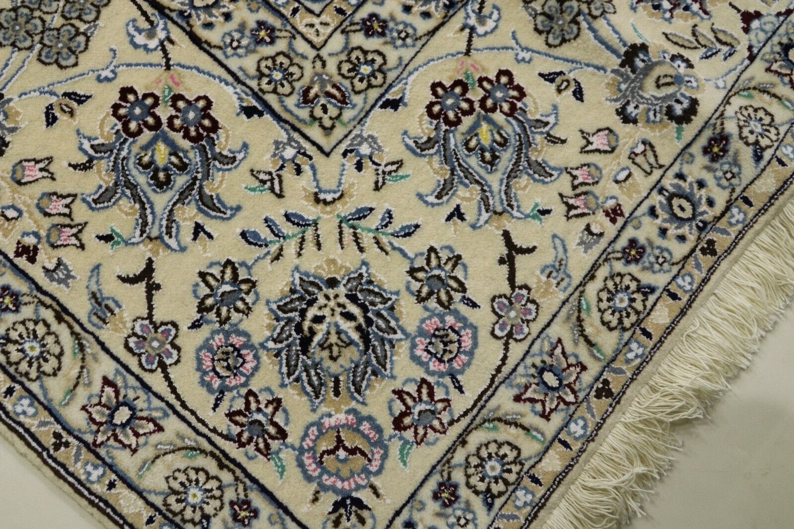 Dieser Teppich stammt aus der renommierten Region Nain im Iran, die für ihre erstklassigen Perserteppiche geschätzt wird. Nain ist bekannt für ihre exquisiten Designs und luxuriösen Materialien. Die Teppichknüpftradition in Nain hat tiefe Wurzeln und blickt auf eine lange Geschichte zurück, die bis ins 20. Jahrhundert reicht. Die Kunst des Teppichknüpfens wird von Generation zu Generation weitergegeben und umfasst spezielle Techniken, die die hohe Knotendichte und die feinen Muster ermöglichen. Nain-Teppiche sind berühmt für ihre detaillierten floral und geometrischen Muster, die oft Symbole für Glück und Wohlstand darstellen.