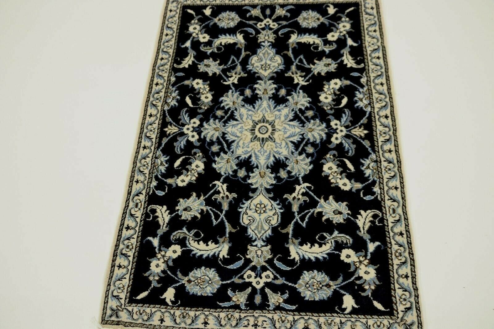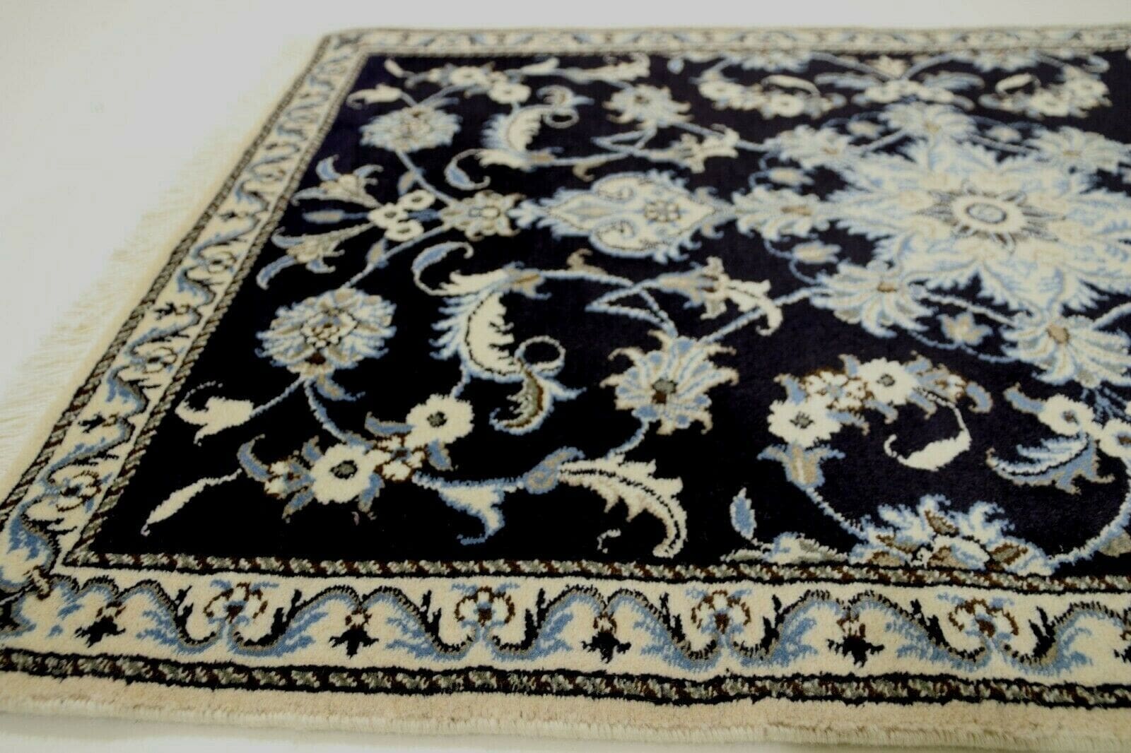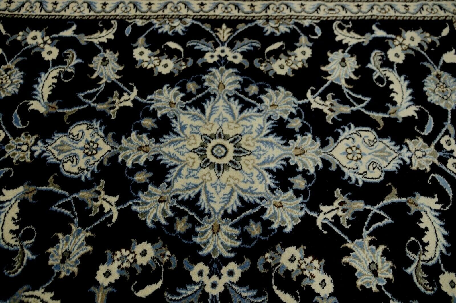 Persischer Super Nain Teppich | Handgeknüpft | Größe: 136 x 92 cm | Material: 90% Schurwolle, 10% Seide | Knoten/m²: ca. 300.000 | Zustand: Neu, sehr gut | Herkunft: Persien/Iran | Dicke: ca. 9 mm | Für Fußbodenheizung geeignet | Haustierfreundlich | Muster: Orientalisch | Form: Rechteckig | Farbton: Weiß/Dunkelblau