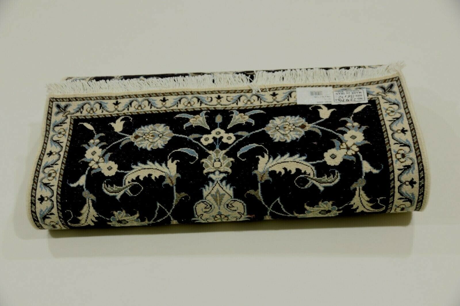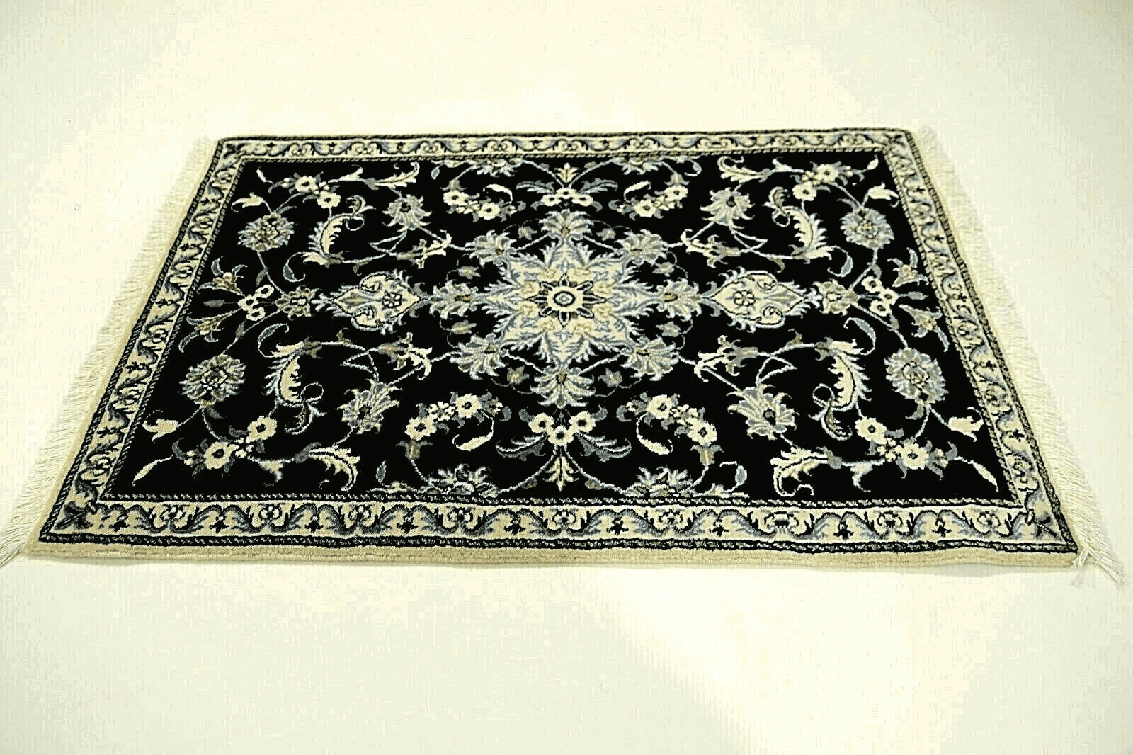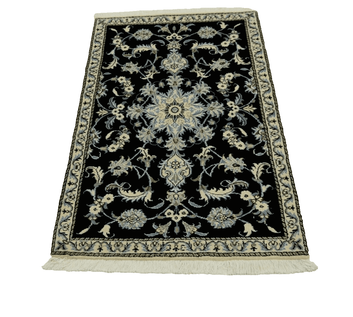 Persischer Super Nain Teppich | Handgeknüpft | Größe: 136 x 92 cm | Material: 90% Schurwolle, 10% Seide | Knoten/m²: ca. 300.000 | Zustand: Neu, sehr gut | Herkunft: Persien/Iran | Dicke: ca. 9 mm | Für Fußbodenheizung geeignet | Haustierfreundlich | Muster: Orientalisch | Form: Rechteckig | Farbton: Weiß/Dunkelblau