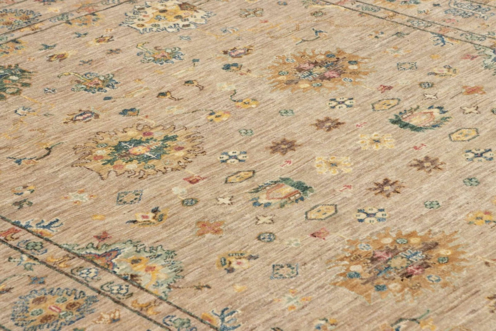 Die Farbpalette, die häufig aus sanften beigen, roten und blauen Tönen besteht, erlaubt zudem eine Vielzahl an Kombinationsmöglichkeiten mit Farben und anderen Materialien. Darüber hinaus bietet die handgeknüpfte Qualität den Vorteil einer langen Lebensdauer, auch bei intensivem Gebrauch.