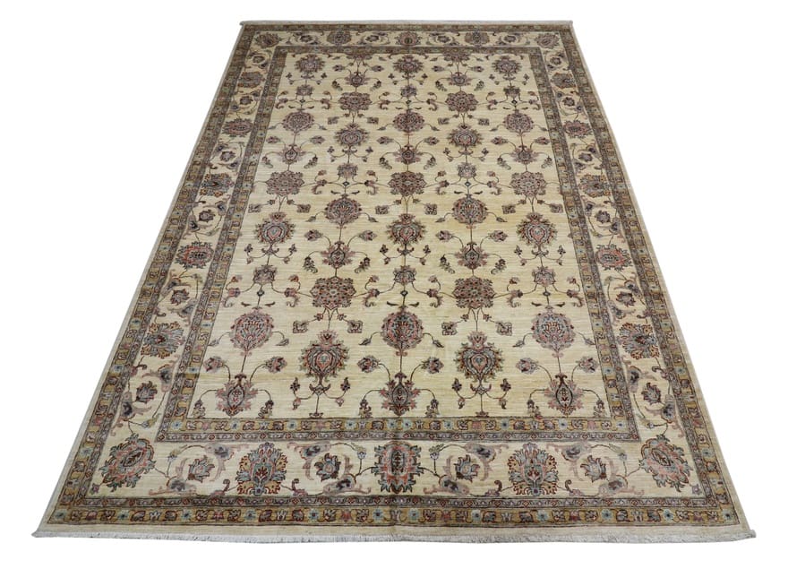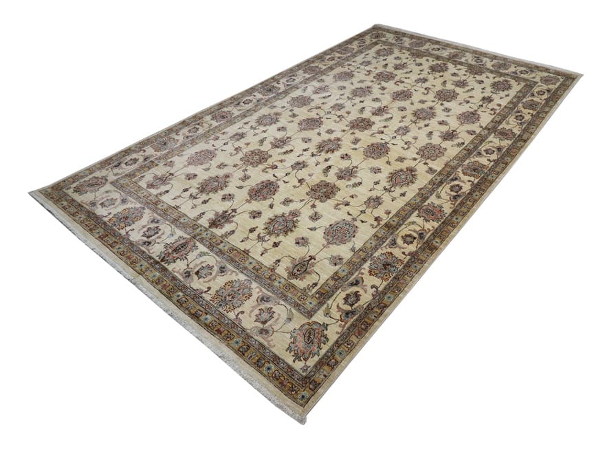 Ziegler Teppich | Knotendichte: 160.000 – 200.000 Knoten/m² | Material: Handgesponnene Wolle und Baumwolle | Größe: 350×255 cm | Farbe: Weiß/Beige | Zustand: Neu | Ursprung: Pakistan | Verarbeitung: Handgeknüpft