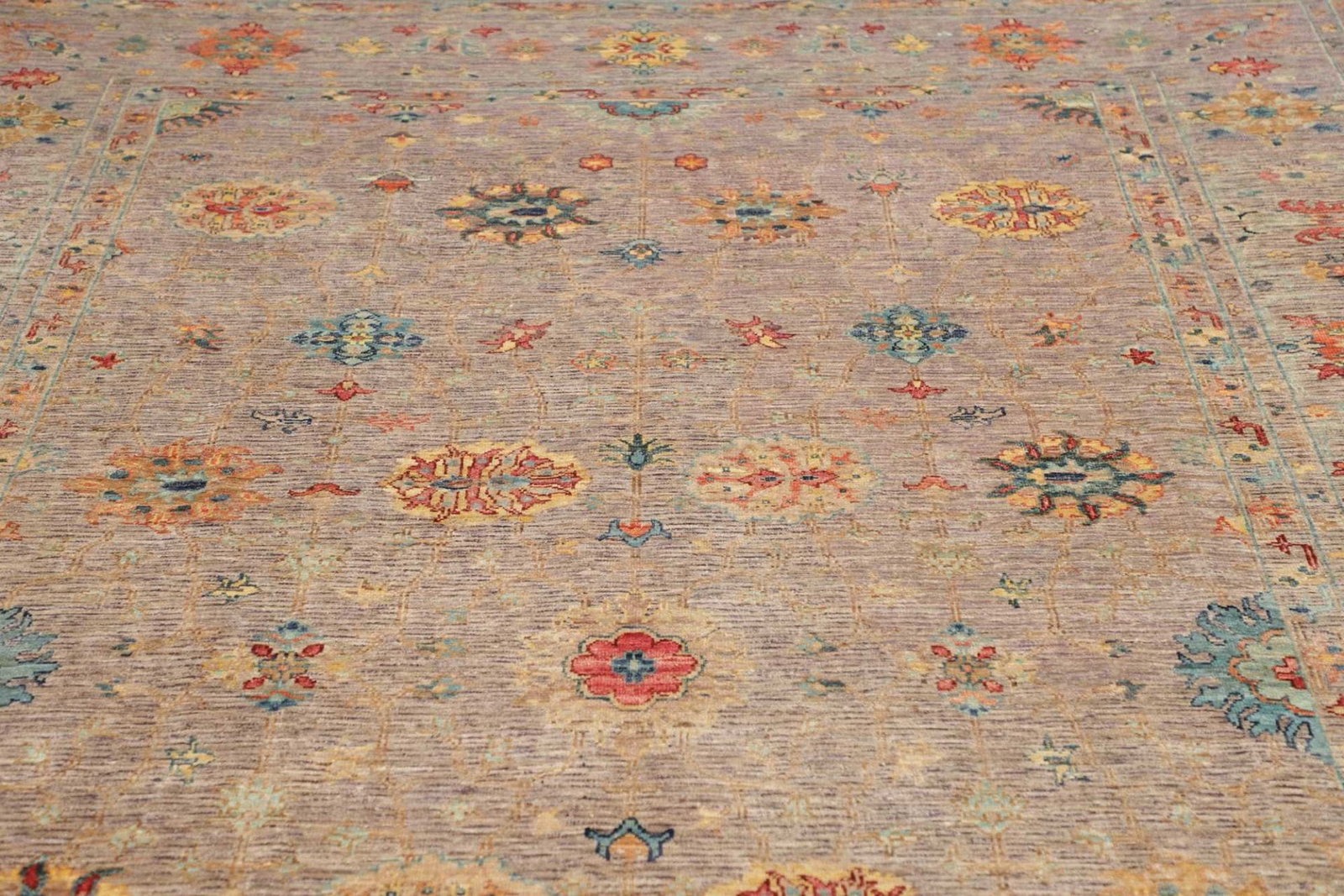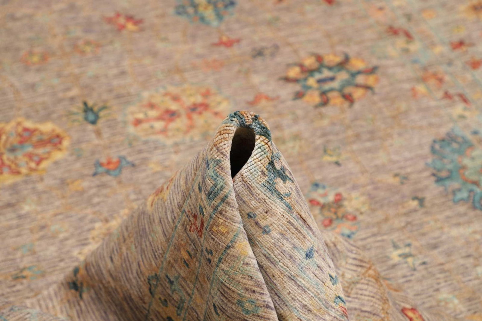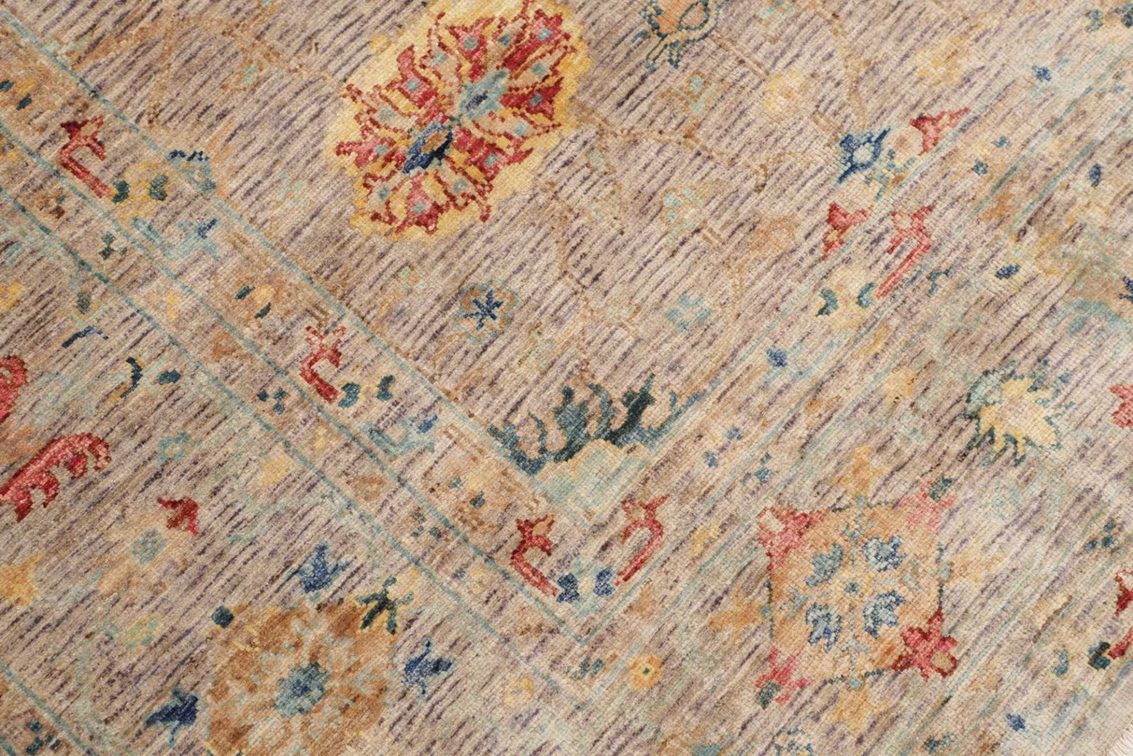 Die Verwendung von Schurwolle macht diesen Teppich zu einem besonders wertvollen Stück. Schurwolle ist für ihre Strapazierfähigkeit bekannt und bietet gleichzeitig eine angenehme Haptik. Dies sorgt dafür, dass der Teppich nicht nur schön aussieht, sondern auch angenehm im Gebrauch ist. Der Teppich wurde mit großer Sorgfalt handgeknüpft, wobei jedes einzelne Knotenelement mehrere Stunden in Anspruch nimmt. Diese präzise Knotentechnik führt zu einer hohen Knotendichte, die sowohl die Haltbarkeit als auch die Detailtreue der Muster gewährleistet.