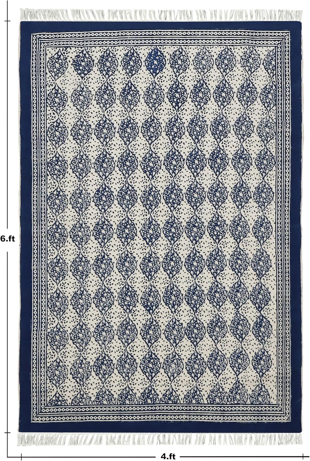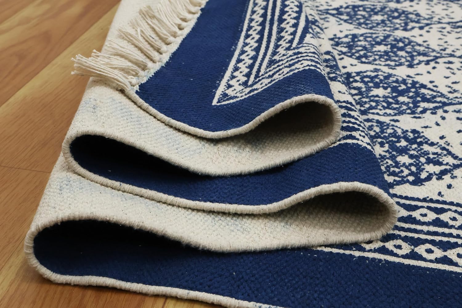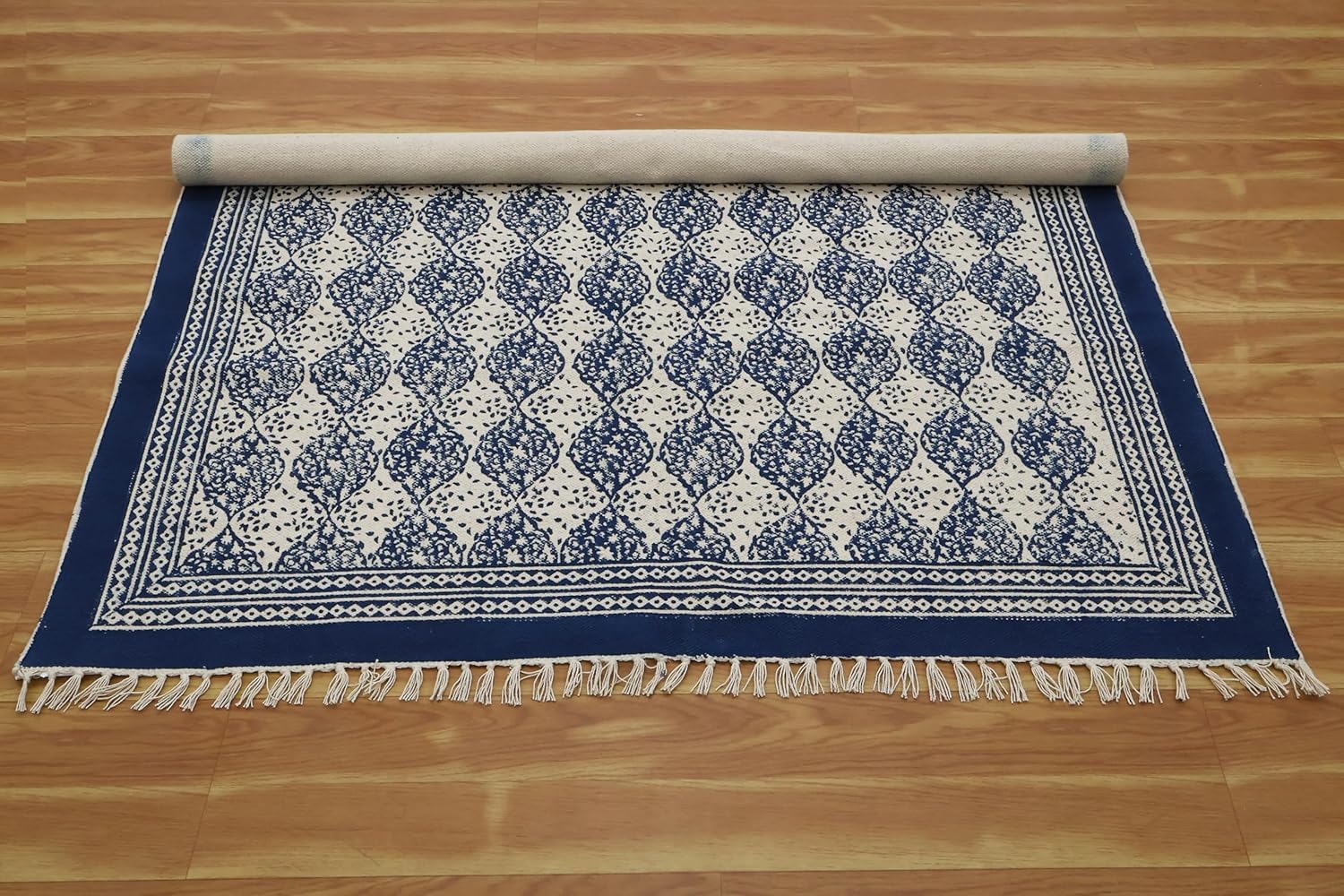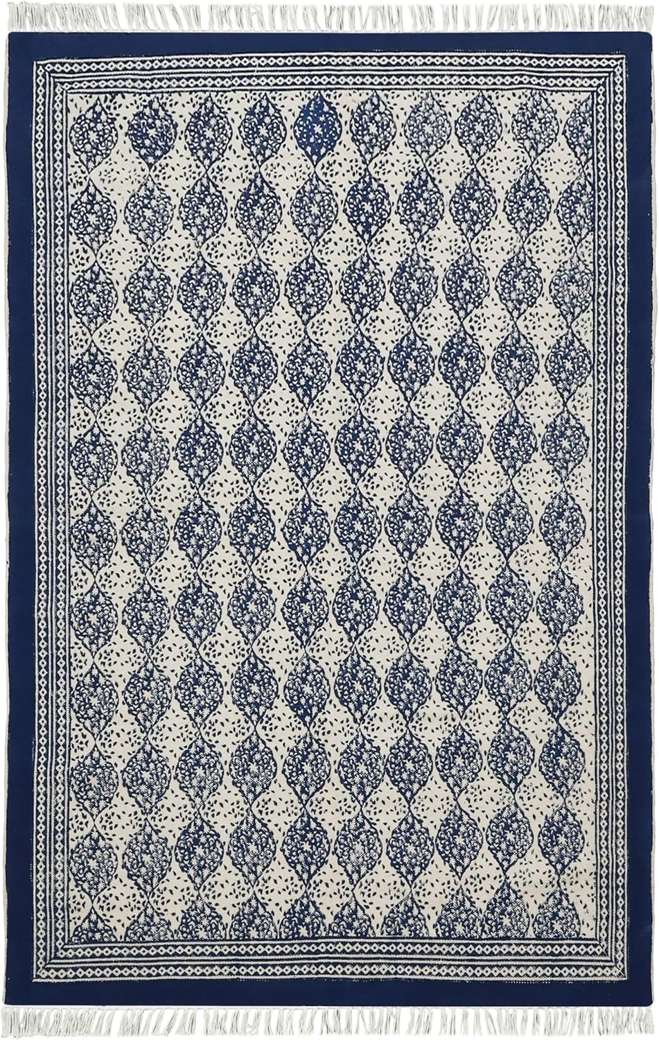 Top-Angebot: CASAVANI Hand Block Printed Cotton Kilim Flat Weave Blue Beige Plant Tree Design Easy Washable Thick 0.5cm Hand Wash Indoor Outdoor Living Room Rug