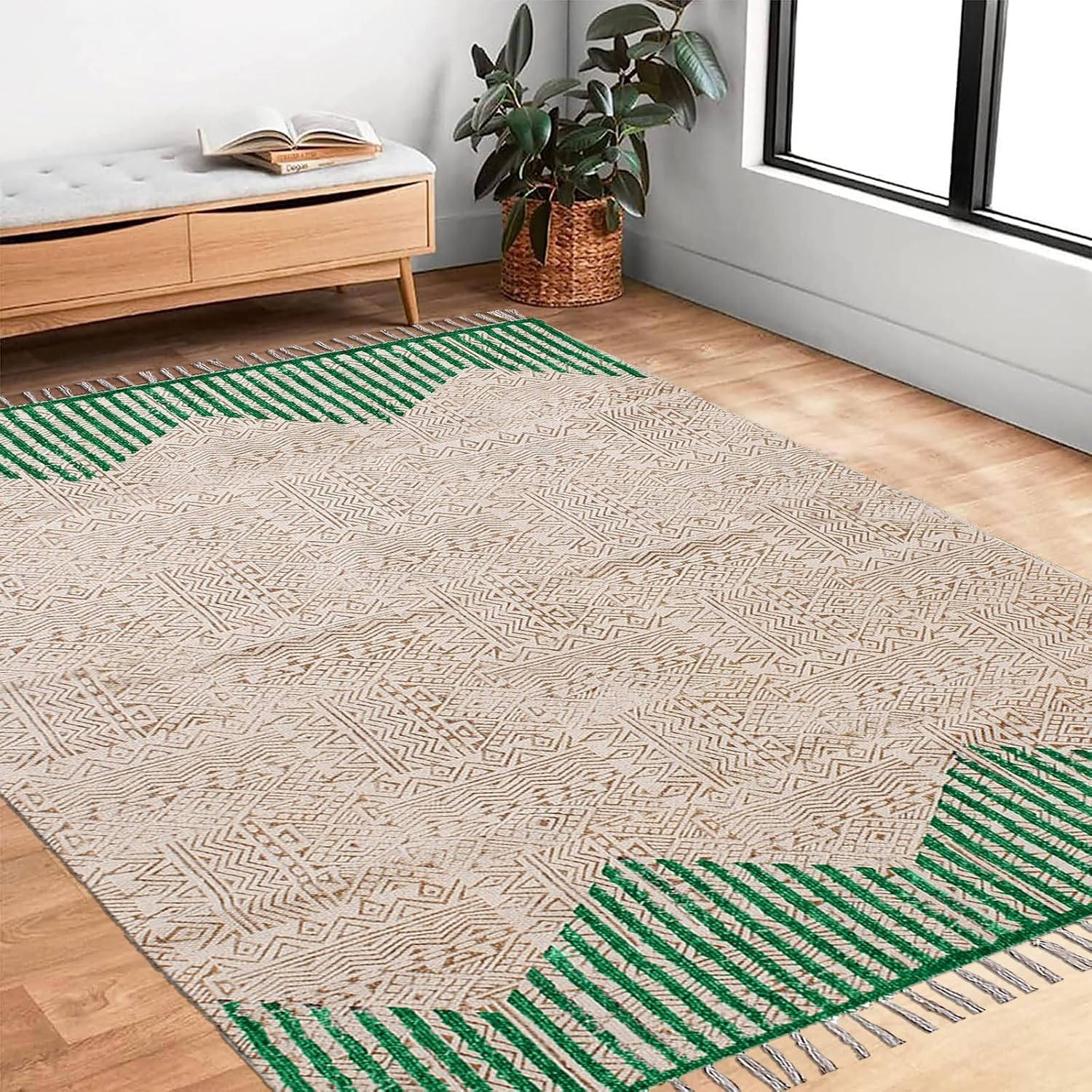Top-Angebot: Kilim Rug Handmade Boho Indoor Outdoor Flat Weave Thick 0.5cm Easy Wash Striped Design Green Beige Hand Printed Cotton Rugs for Bedroom Living Room